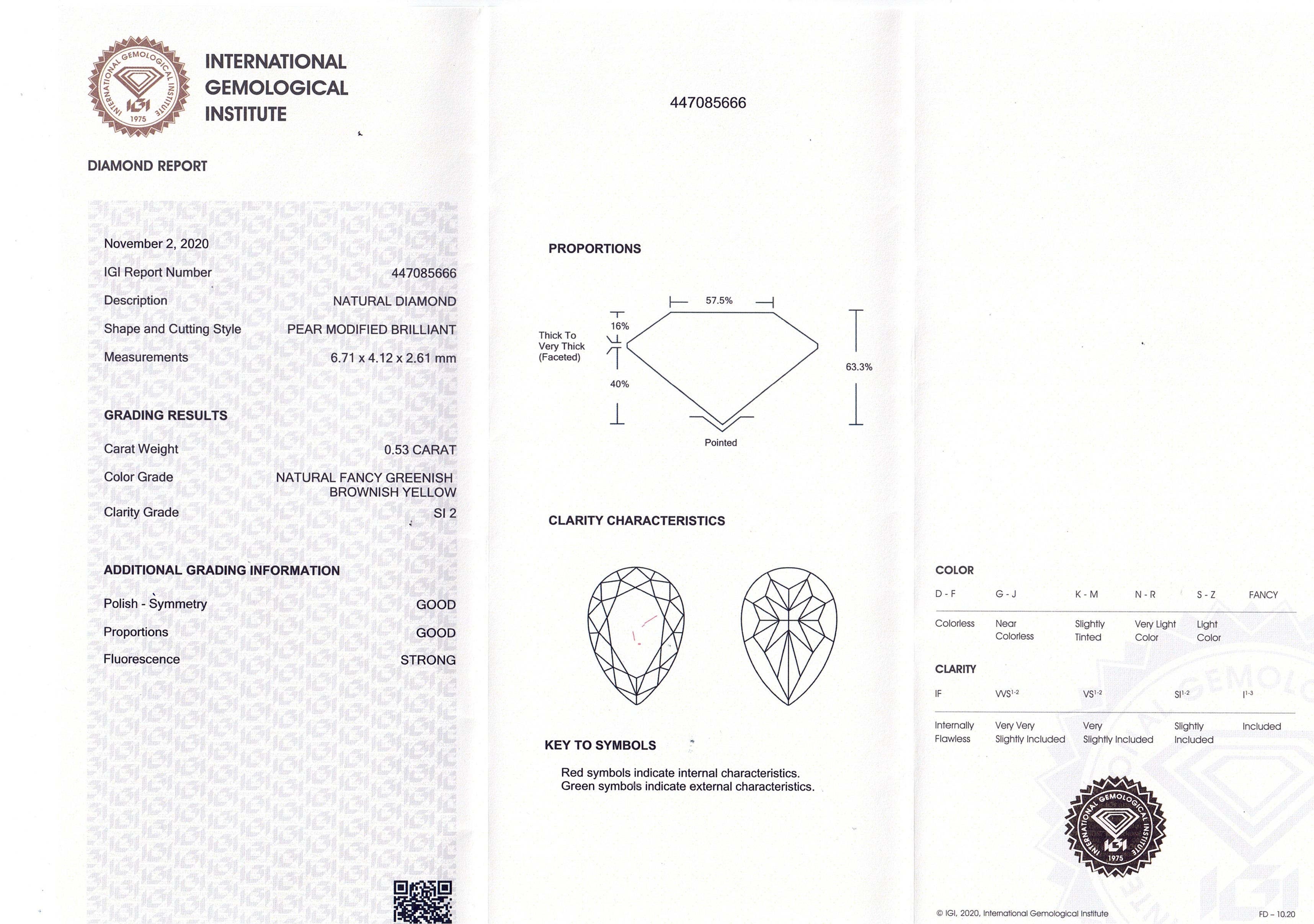 Tropfenschliff, Natural Fancy Greenish Brownish Yellow /SI2, inkl. IGI Zertifikat.