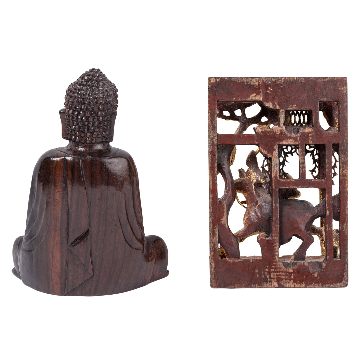 Buddha im Meditationssitz (H. ca.18,5 cm) und lackvergoldetese Schnitzereipaneel (ca. 17x11,5x4). Berieben, Altersspuren.