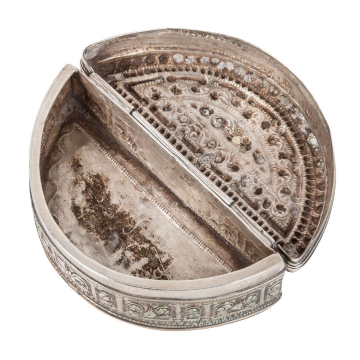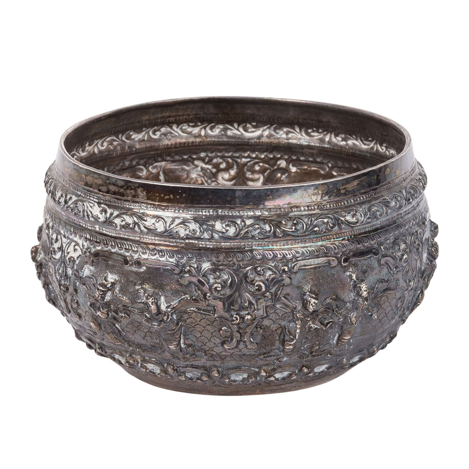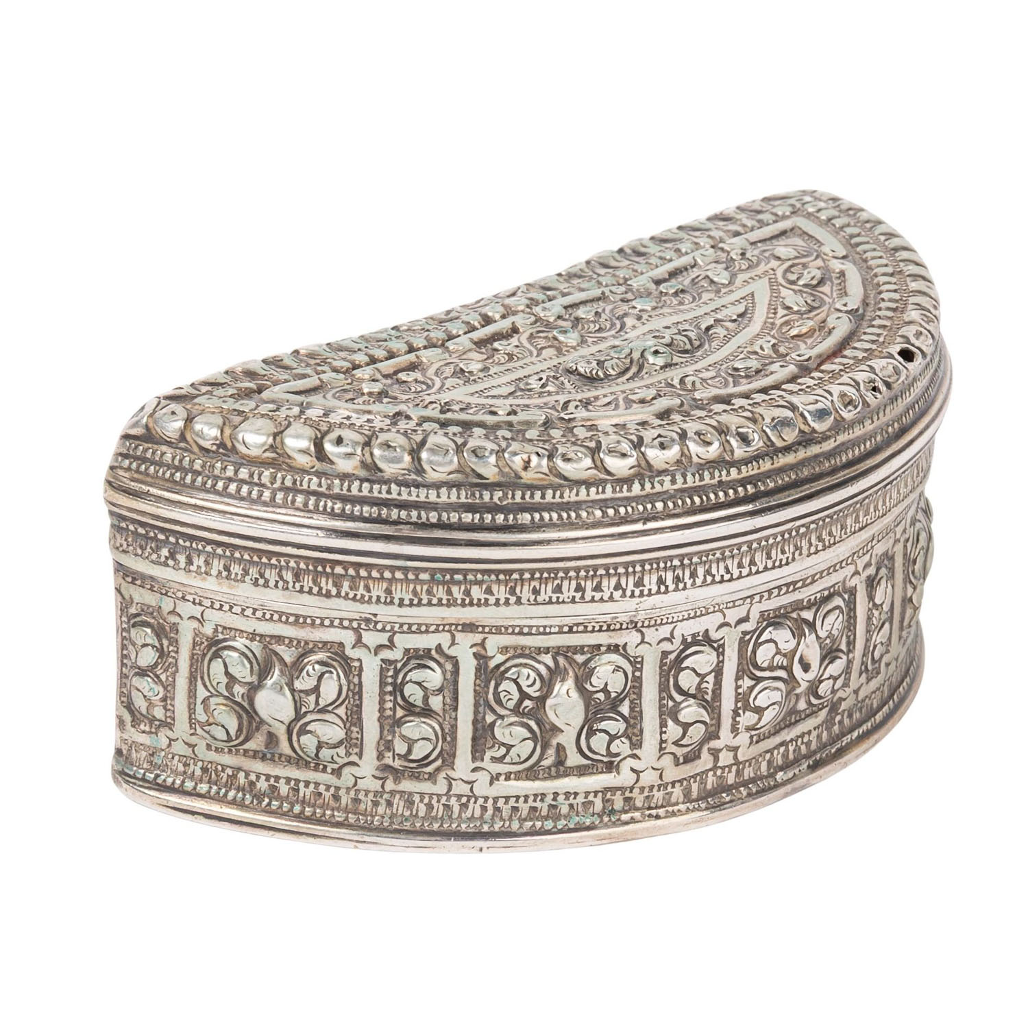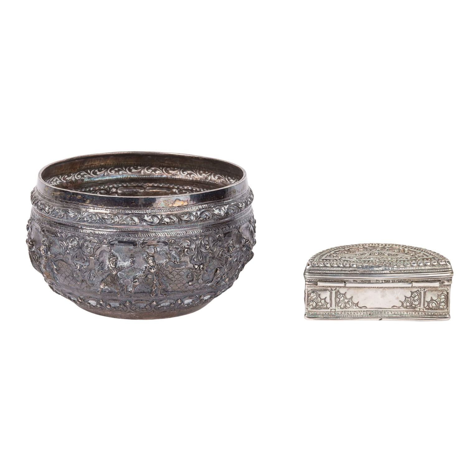 1.) Rundschale, umlaufend verziert mit figuralem und ornamentalem Rekiefdekor. Mit unterseitiger Widmung, H: 8,5 cm/D: ca.13 cm. 2.) halbmondförmige Deckeldose, ornamental verziert. L: 9 cm. Jeweils mit Altersspuren, besch,