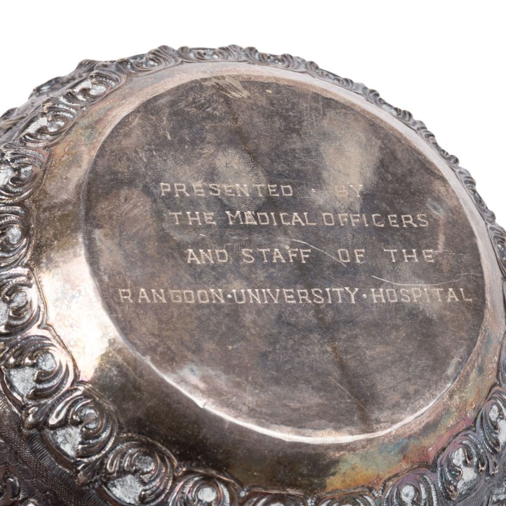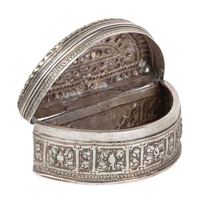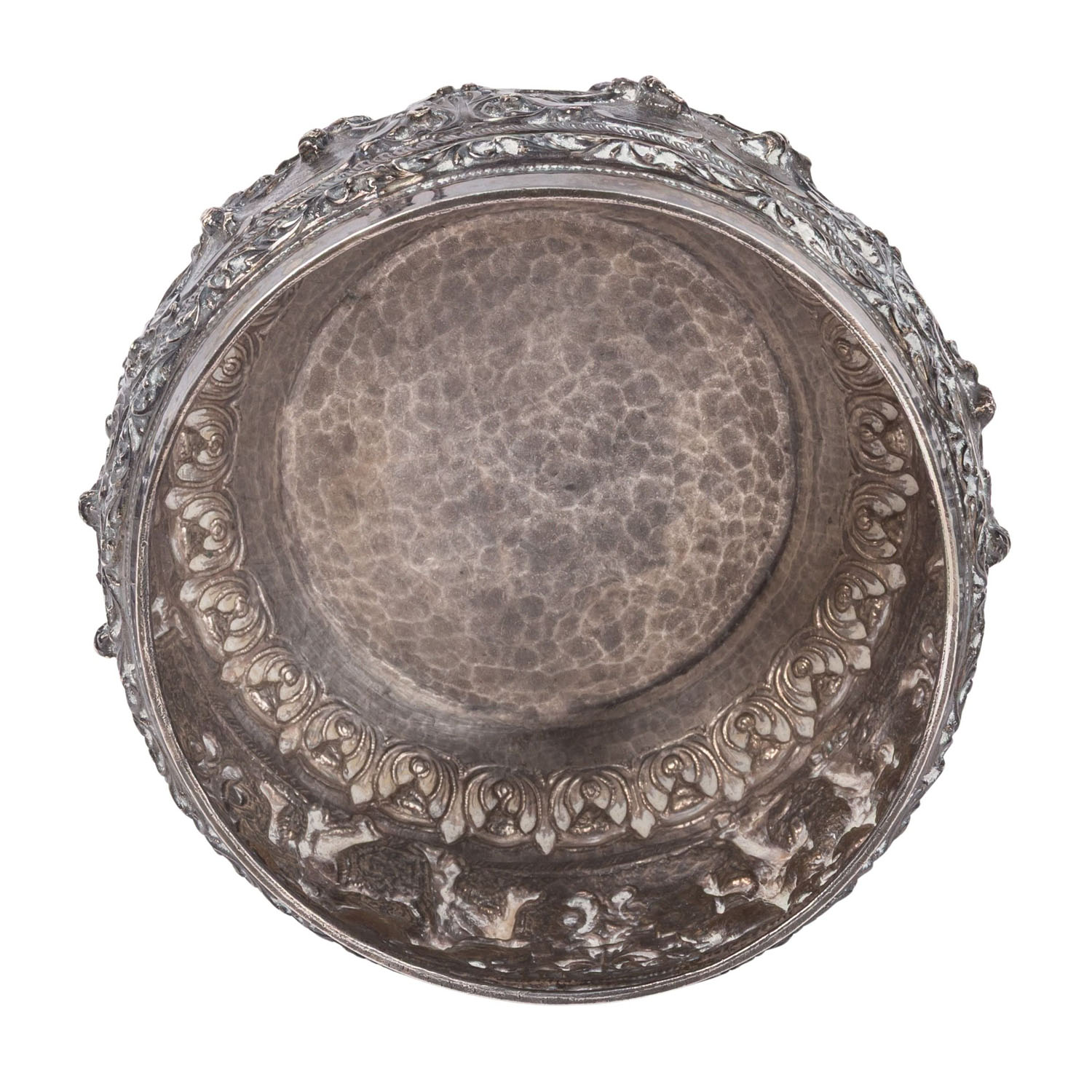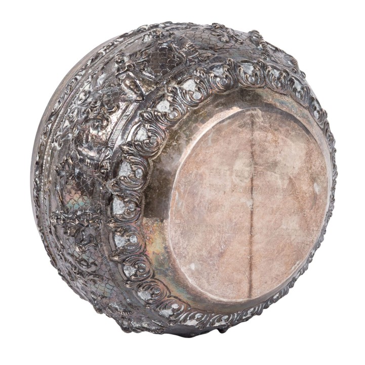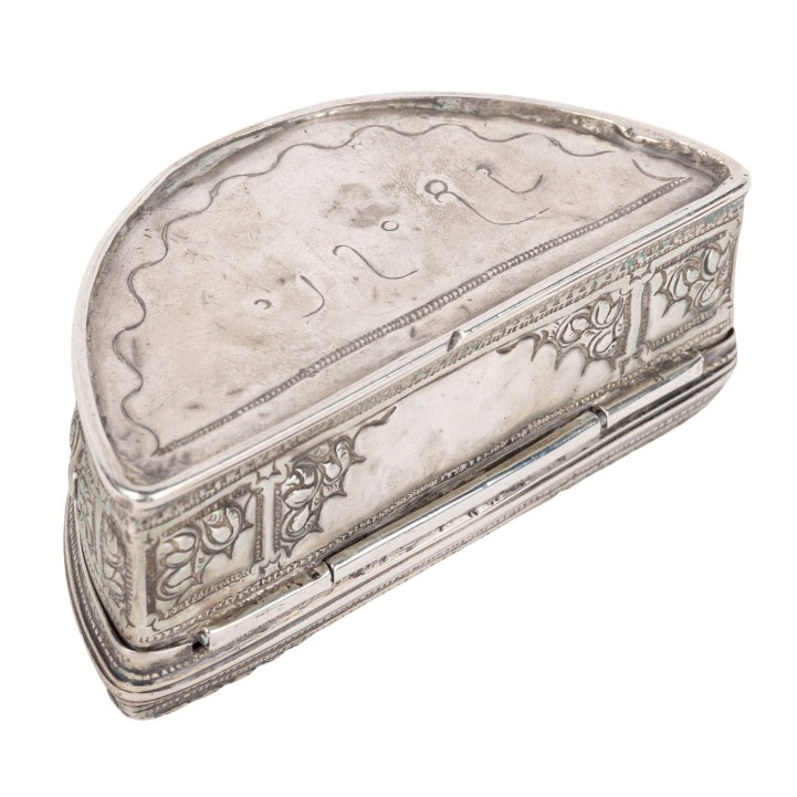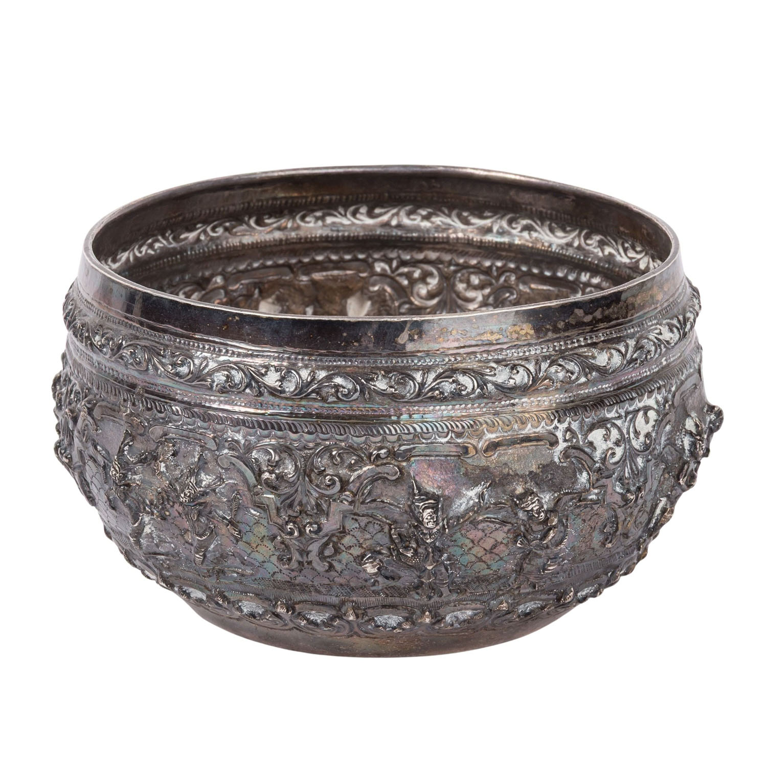 1.) Rundschale, umlaufend verziert mit figuralem und ornamentalem Rekiefdekor. Mit unterseitiger Widmung, H: 8,5 cm/D: ca.13 cm. 2.) halbmondförmige Deckeldose, ornamental verziert. L: 9 cm. Jeweils mit Altersspuren, besch,