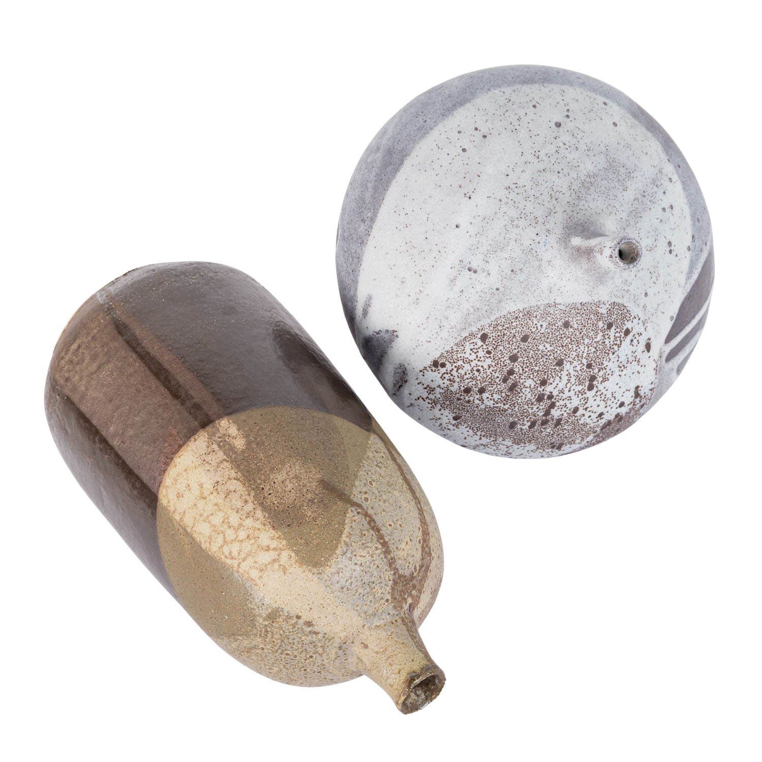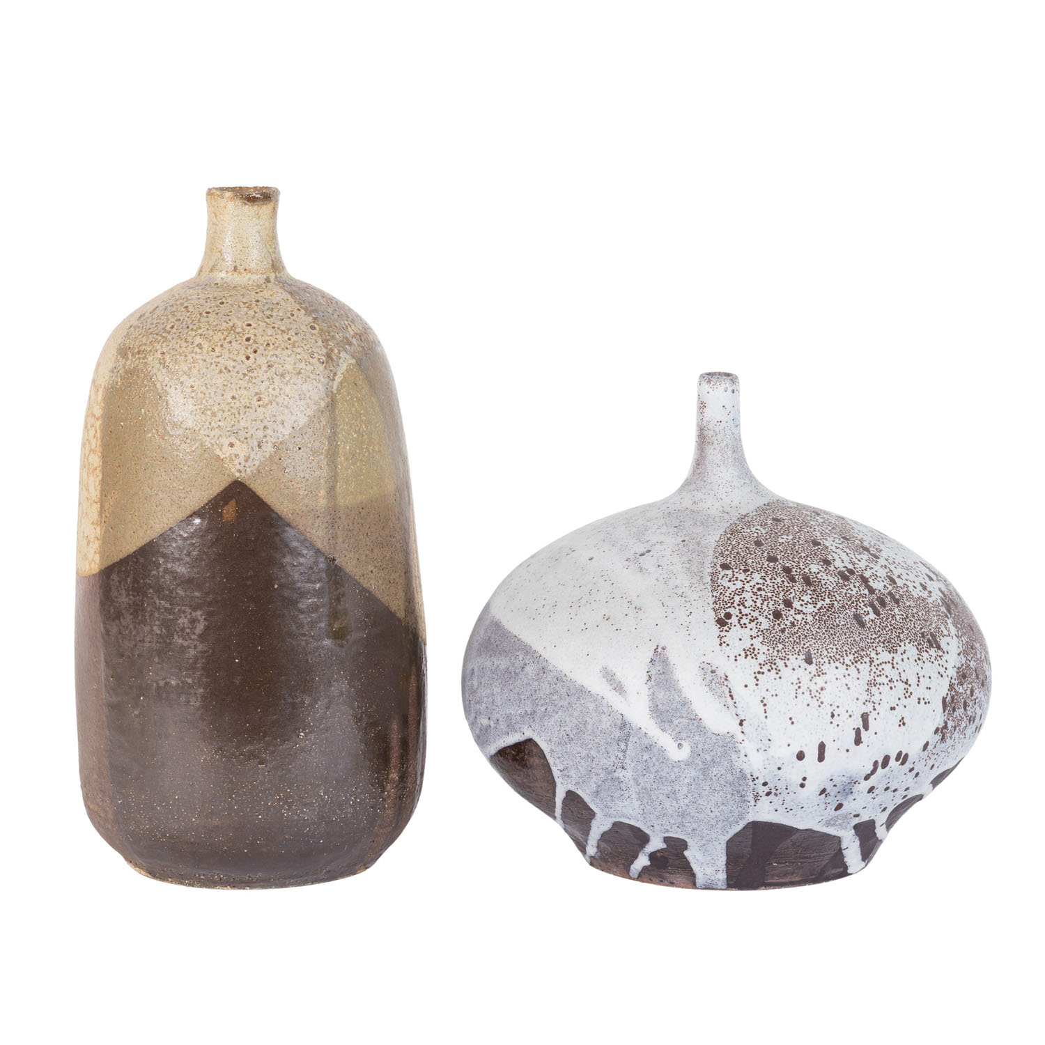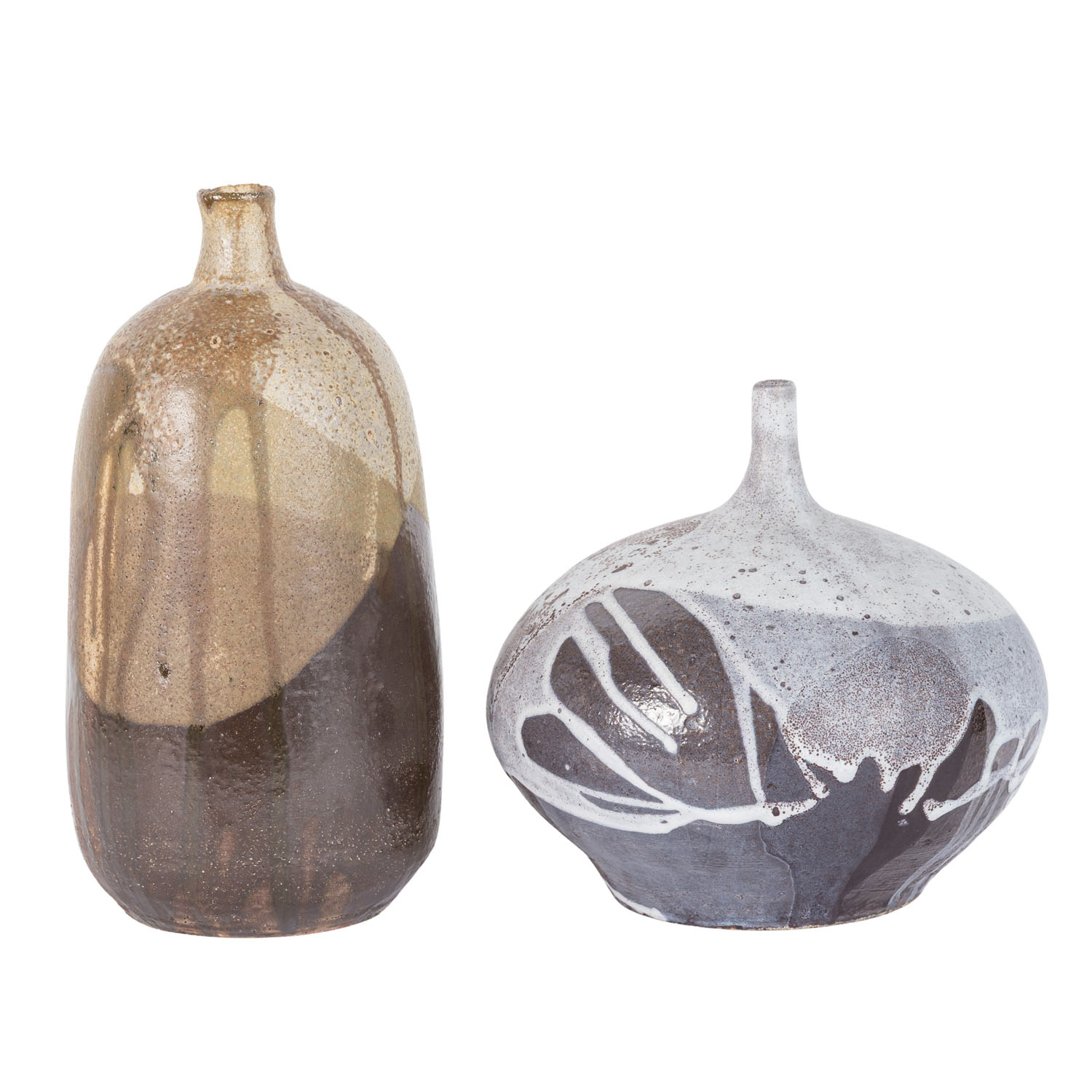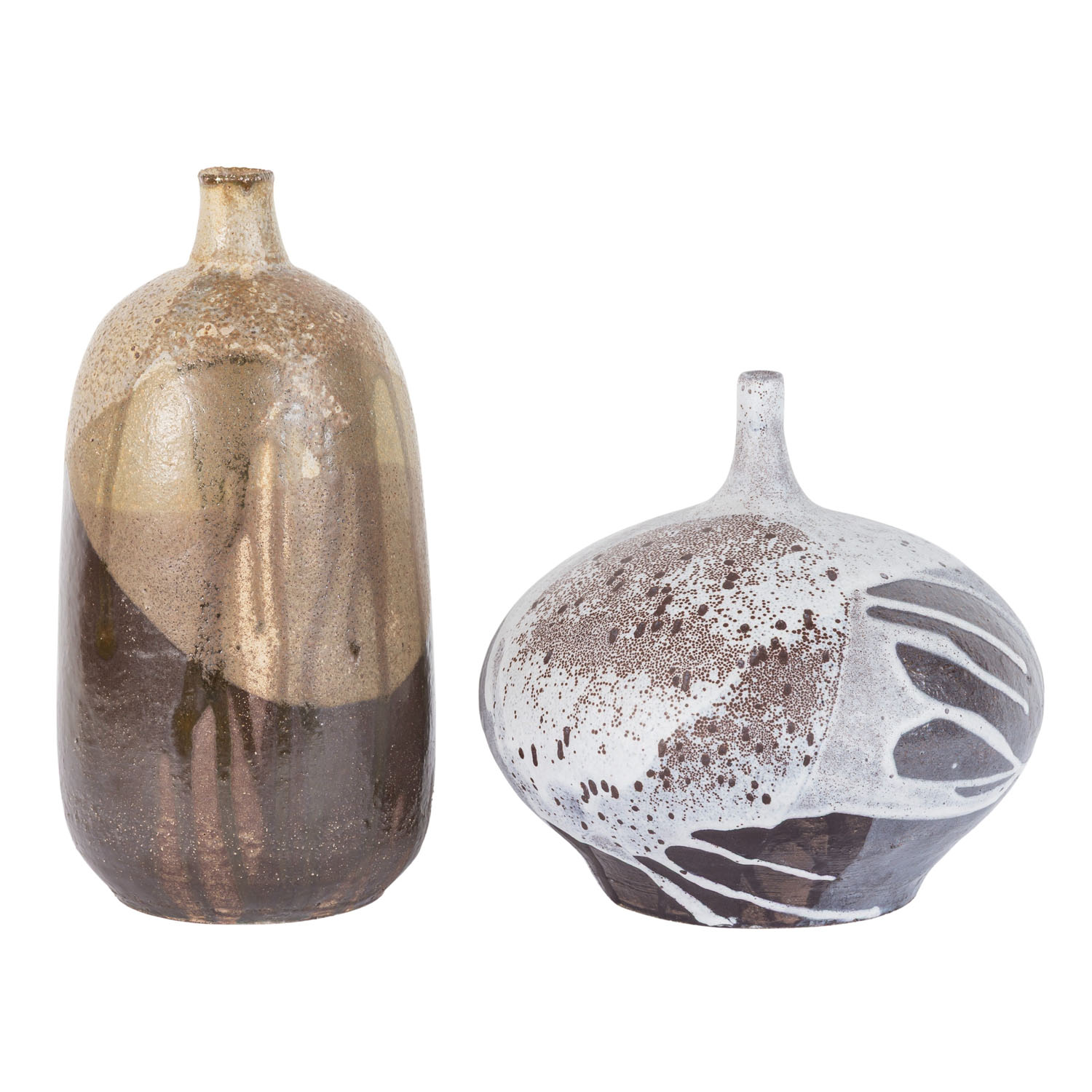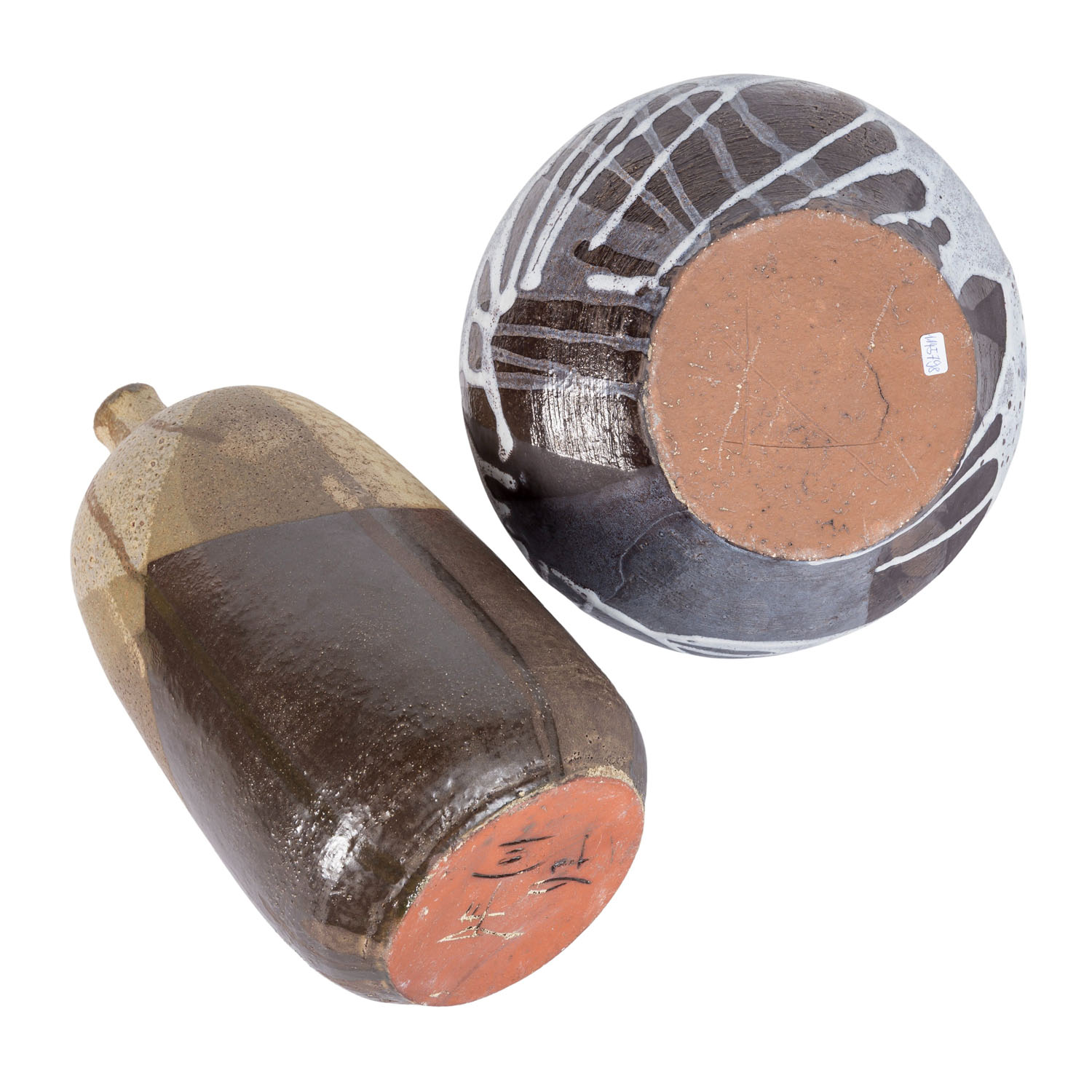 1 Vase aus rotem Scherben, mit verschiedenen Brauntönen, teilweise glänzend, eiförmiger Körper mit kurzem, schmalem Hals, unbekannte Marke, H. ca. 26,5 cm; 1 Vase aus braunem Scherben, in gedrückter Kugelform mit kurzem, engem Hals, hellgrau auf braunem Grund, nicht aufgelöste Marke, H. ca. 19. Alters- und Gebrauchsspuren.