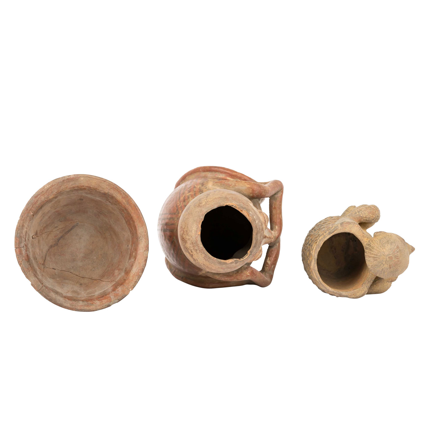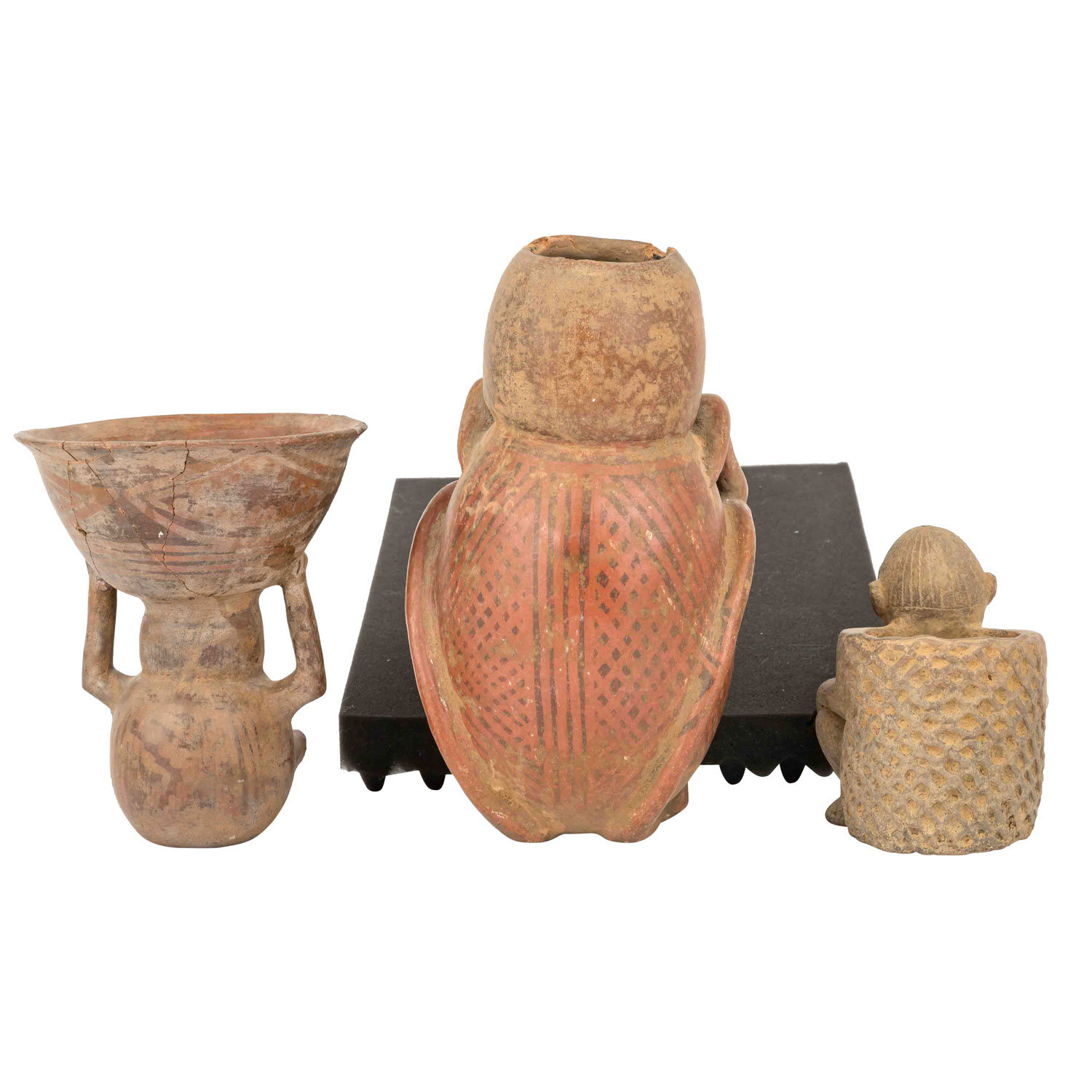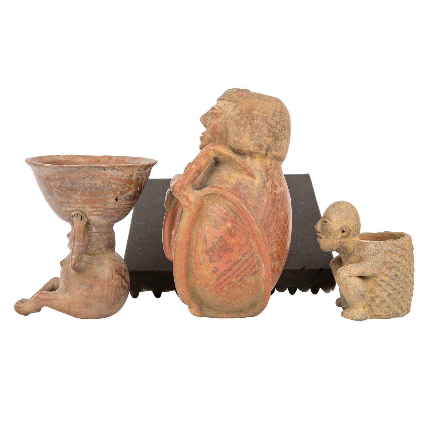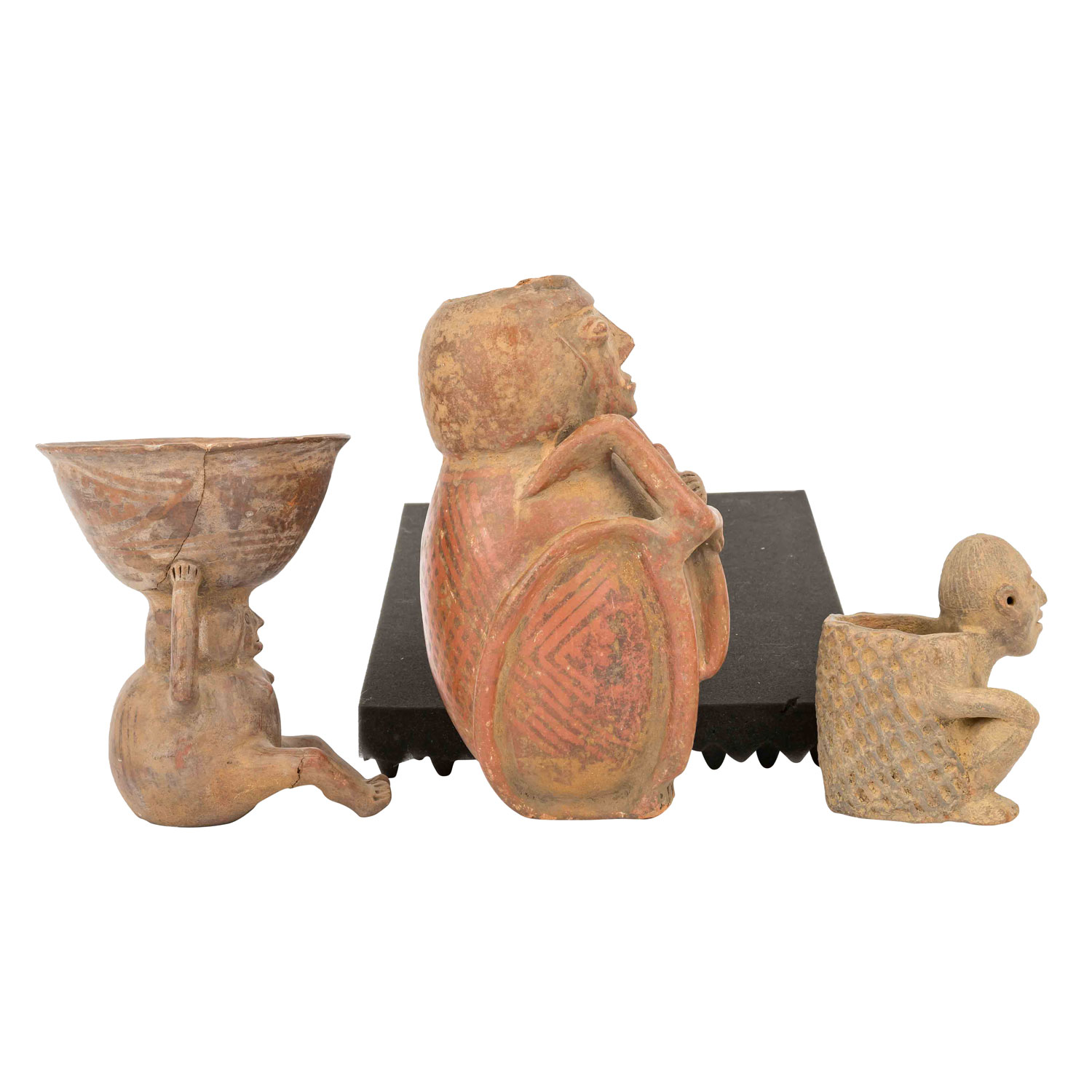 1,) Gefäß mit anmodelliertem hockendem Mann, der seine Hände auf seine Knie legt. Aus rötlichem Ton mit ockerfarbener Engobe, H: 15 cm. 2.) Sitzende unbekleidete Frau, die auf Ihrem Kopf eine Schale trägt, die sie auf beiden Seiten mit den Händen festhält. Aus rötlichem Ton mit Resten einer Bemalung, H: 21 cm. Die Schale ist stark beschädigt: gebrochen und wieder zusammengefügt. 3.) Anthropomorphes Gefäß in Form eines hockenden Mannes mit überlangen, schlangenartigen Gliedmaßen. Aus rötlichem Ton mit dunkelroter Engobe und geometrischer Bemalung, H: ca. 29 cm. Mit krustiger Patina, besch. u.a. durch Ausbruchstellen am Mündungsrand, der sich im Bereich des Kopfes befindet.