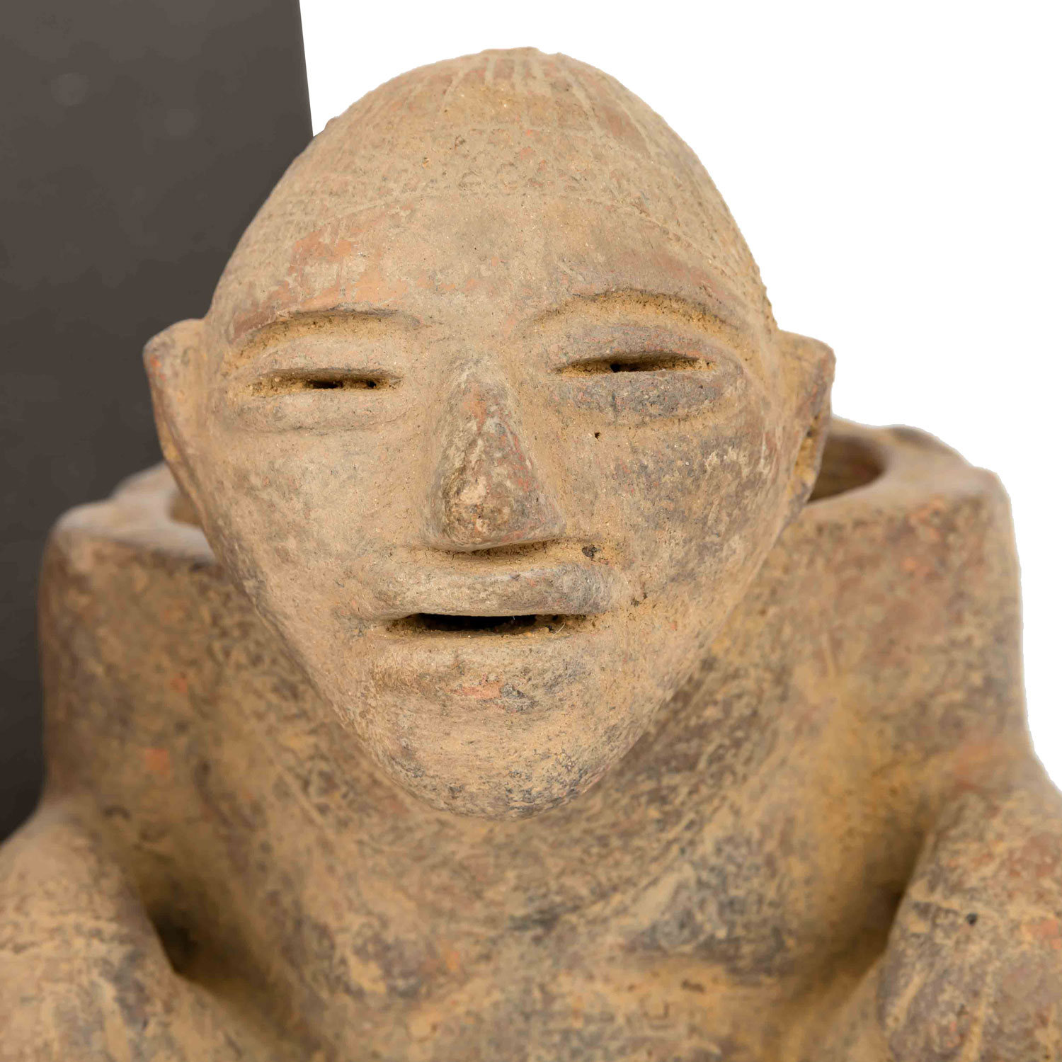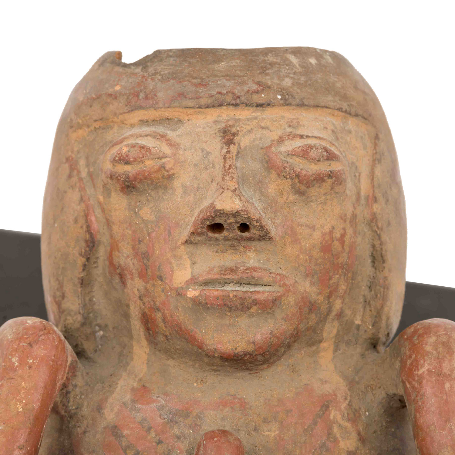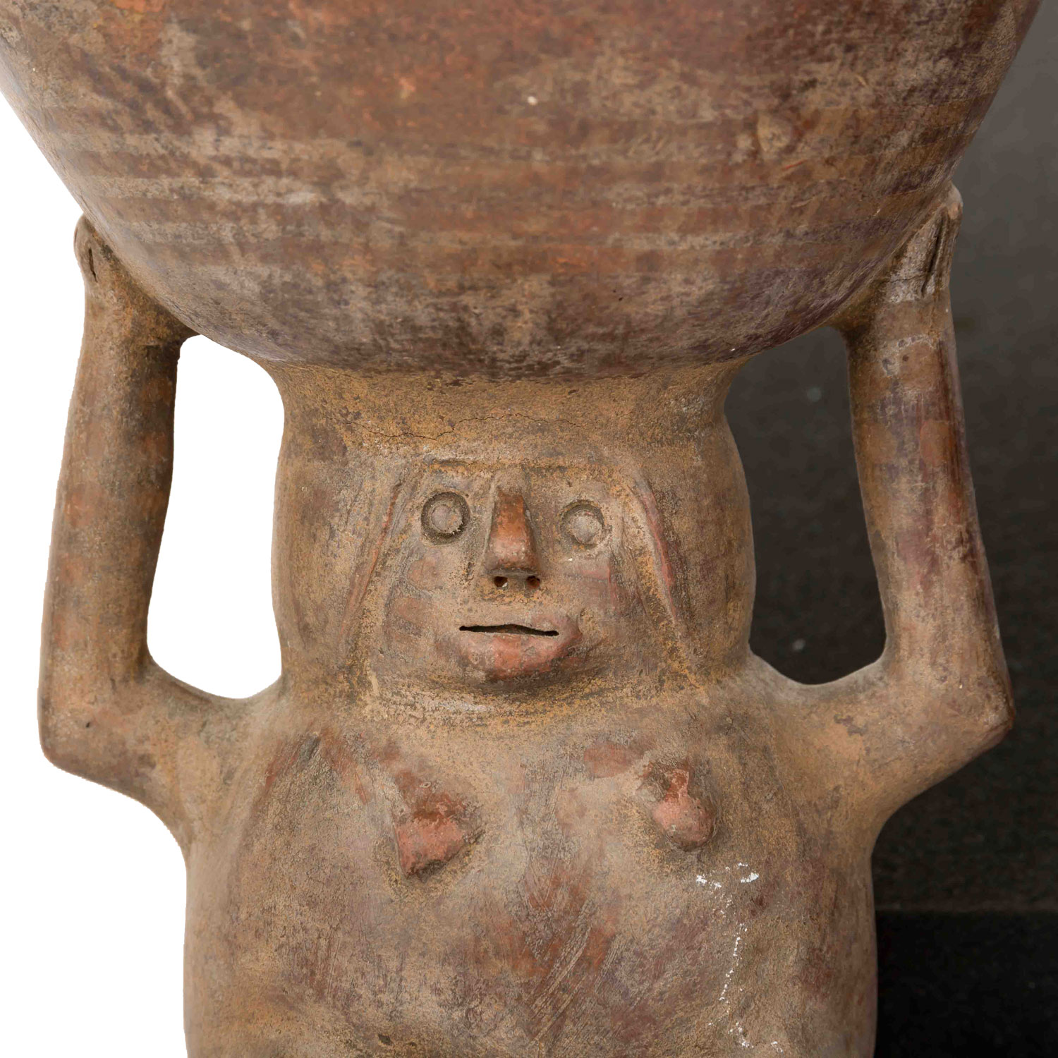 1,) Gefäß mit anmodelliertem hockendem Mann, der seine Hände auf seine Knie legt. Aus rötlichem Ton mit ockerfarbener Engobe, H: 15 cm. 2.) Sitzende unbekleidete Frau, die auf Ihrem Kopf eine Schale trägt, die sie auf beiden Seiten mit den Händen festhält. Aus rötlichem Ton mit Resten einer Bemalung, H: 21 cm. Die Schale ist stark beschädigt: gebrochen und wieder zusammengefügt. 3.) Anthropomorphes Gefäß in Form eines hockenden Mannes mit überlangen, schlangenartigen Gliedmaßen. Aus rötlichem Ton mit dunkelroter Engobe und geometrischer Bemalung, H: ca. 29 cm. Mit krustiger Patina, besch. u.a. durch Ausbruchstellen am Mündungsrand, der sich im Bereich des Kopfes befindet.