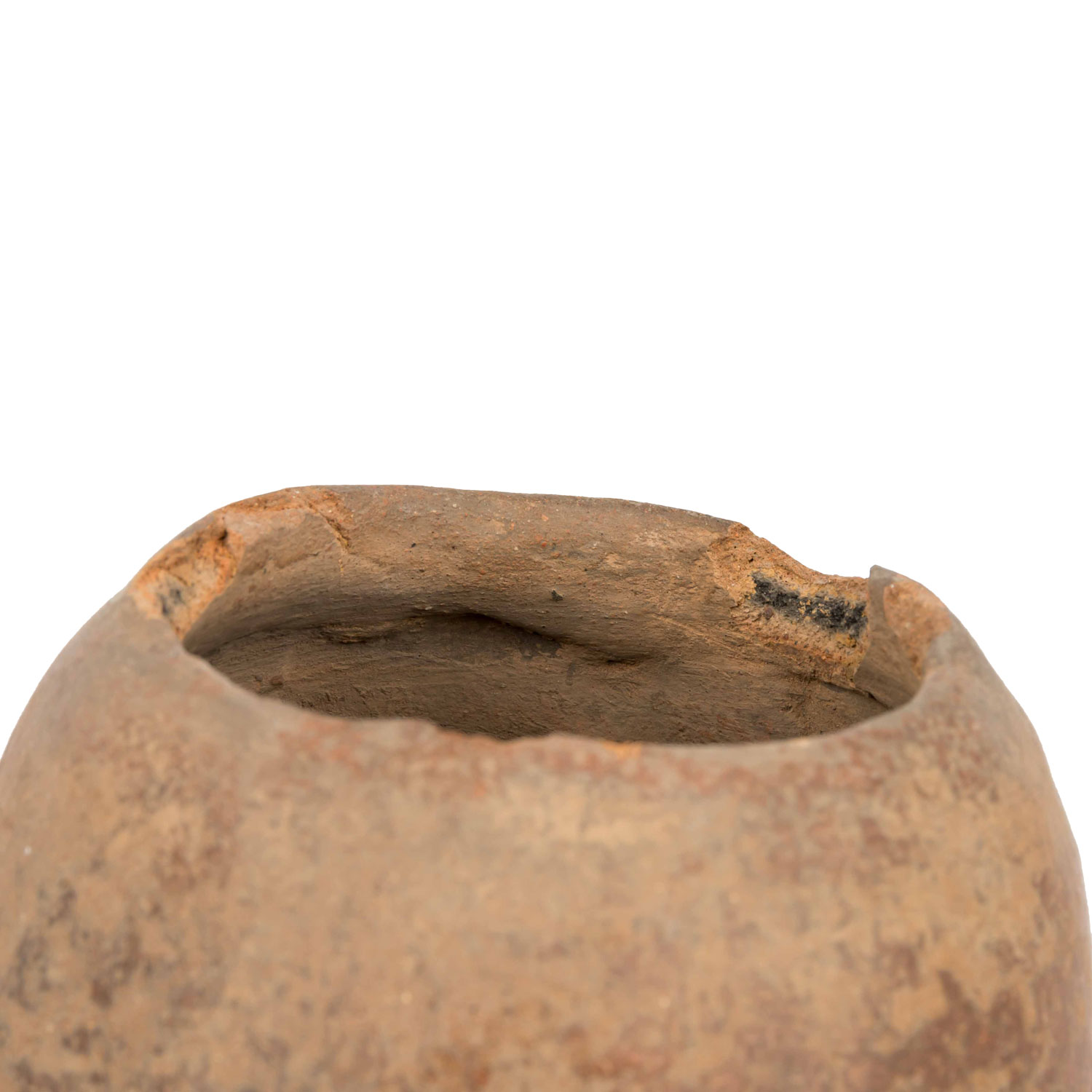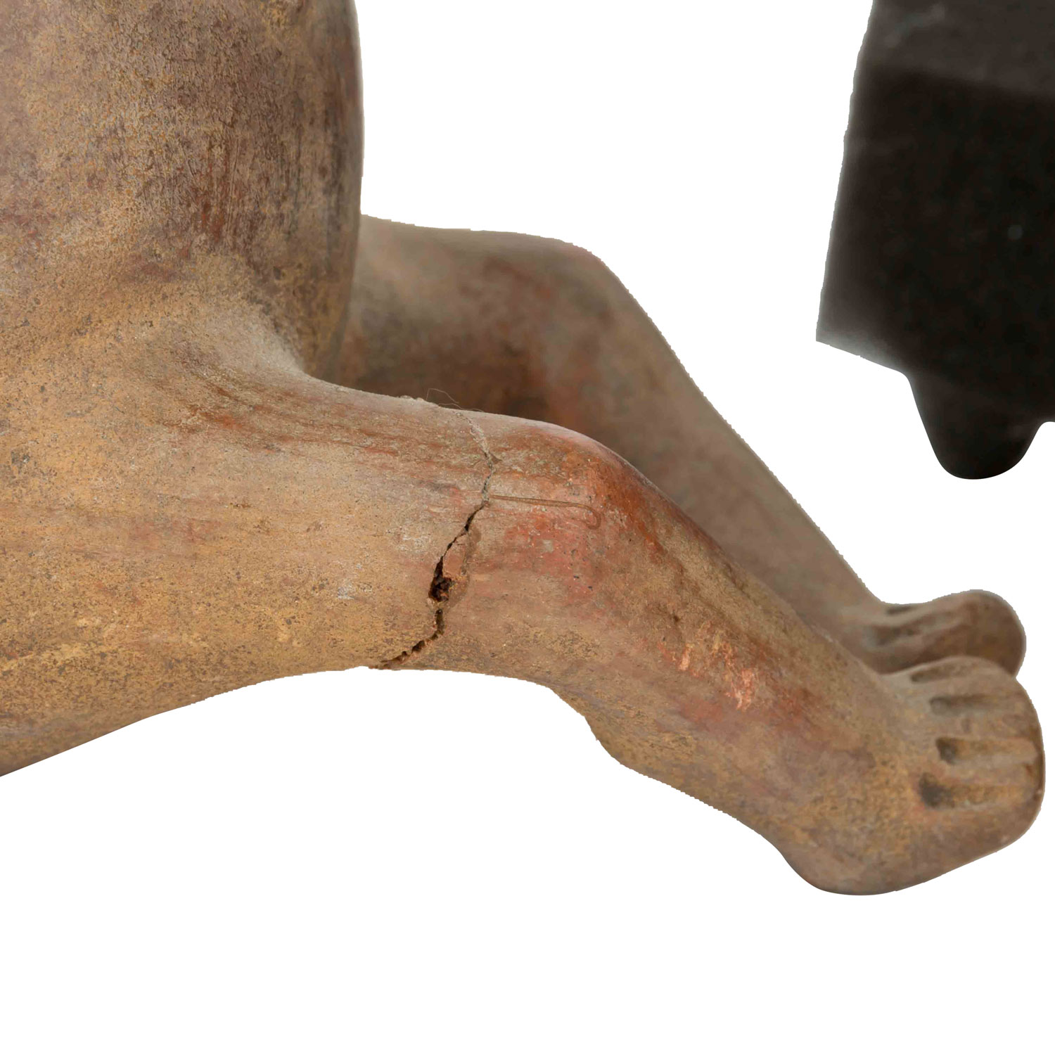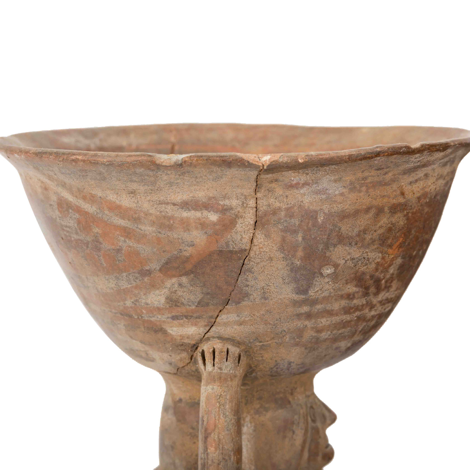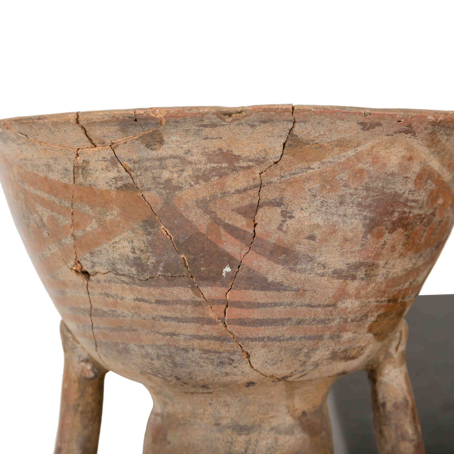 1,) Gefäß mit anmodelliertem hockendem Mann, der seine Hände auf seine Knie legt. Aus rötlichem Ton mit ockerfarbener Engobe, H: 15 cm. 2.) Sitzende unbekleidete Frau, die auf Ihrem Kopf eine Schale trägt, die sie auf beiden Seiten mit den Händen festhält. Aus rötlichem Ton mit Resten einer Bemalung, H: 21 cm. Die Schale ist stark beschädigt: gebrochen und wieder zusammengefügt. 3.) Anthropomorphes Gefäß in Form eines hockenden Mannes mit überlangen, schlangenartigen Gliedmaßen. Aus rötlichem Ton mit dunkelroter Engobe und geometrischer Bemalung, H: ca. 29 cm. Mit krustiger Patina, besch. u.a. durch Ausbruchstellen am Mündungsrand, der sich im Bereich des Kopfes befindet.