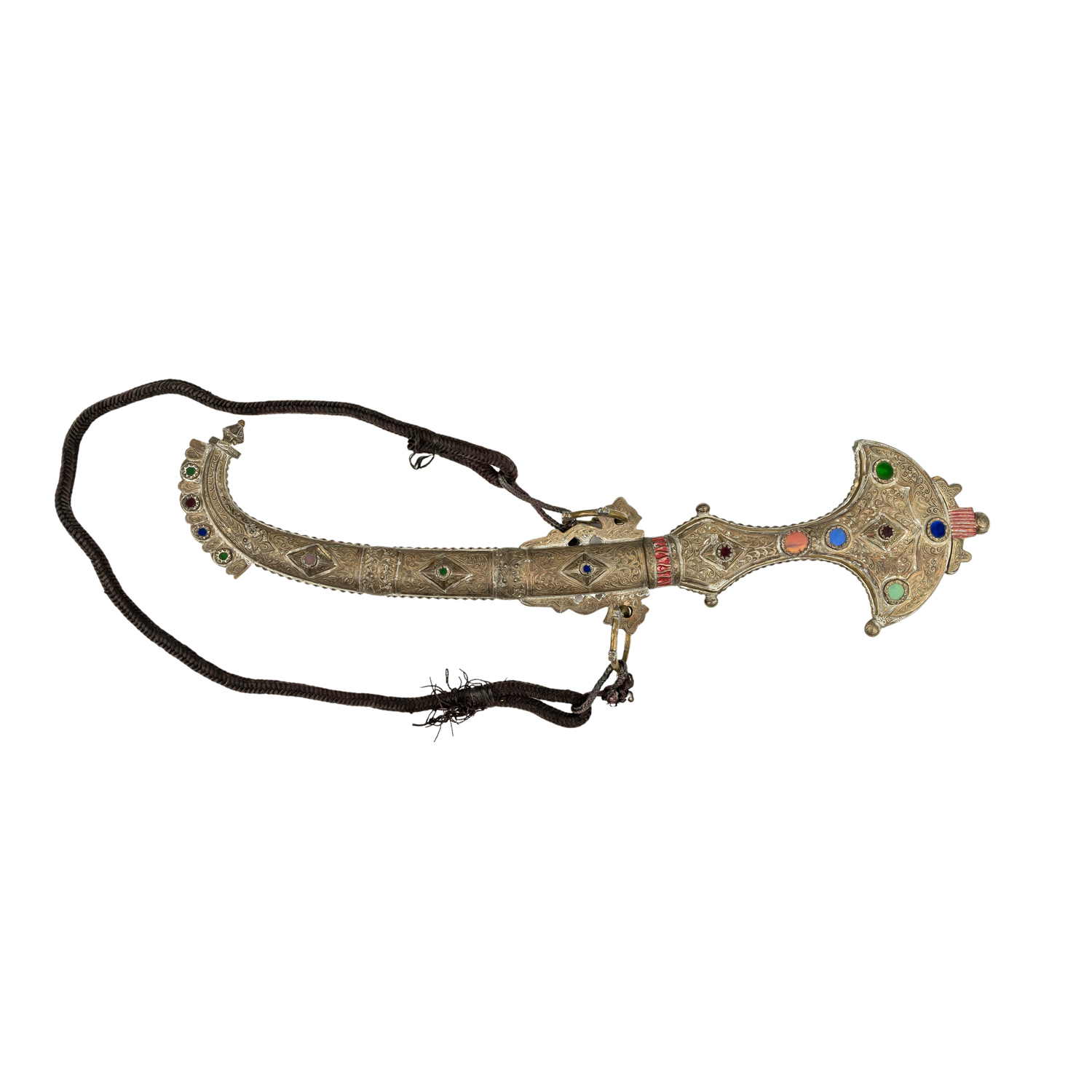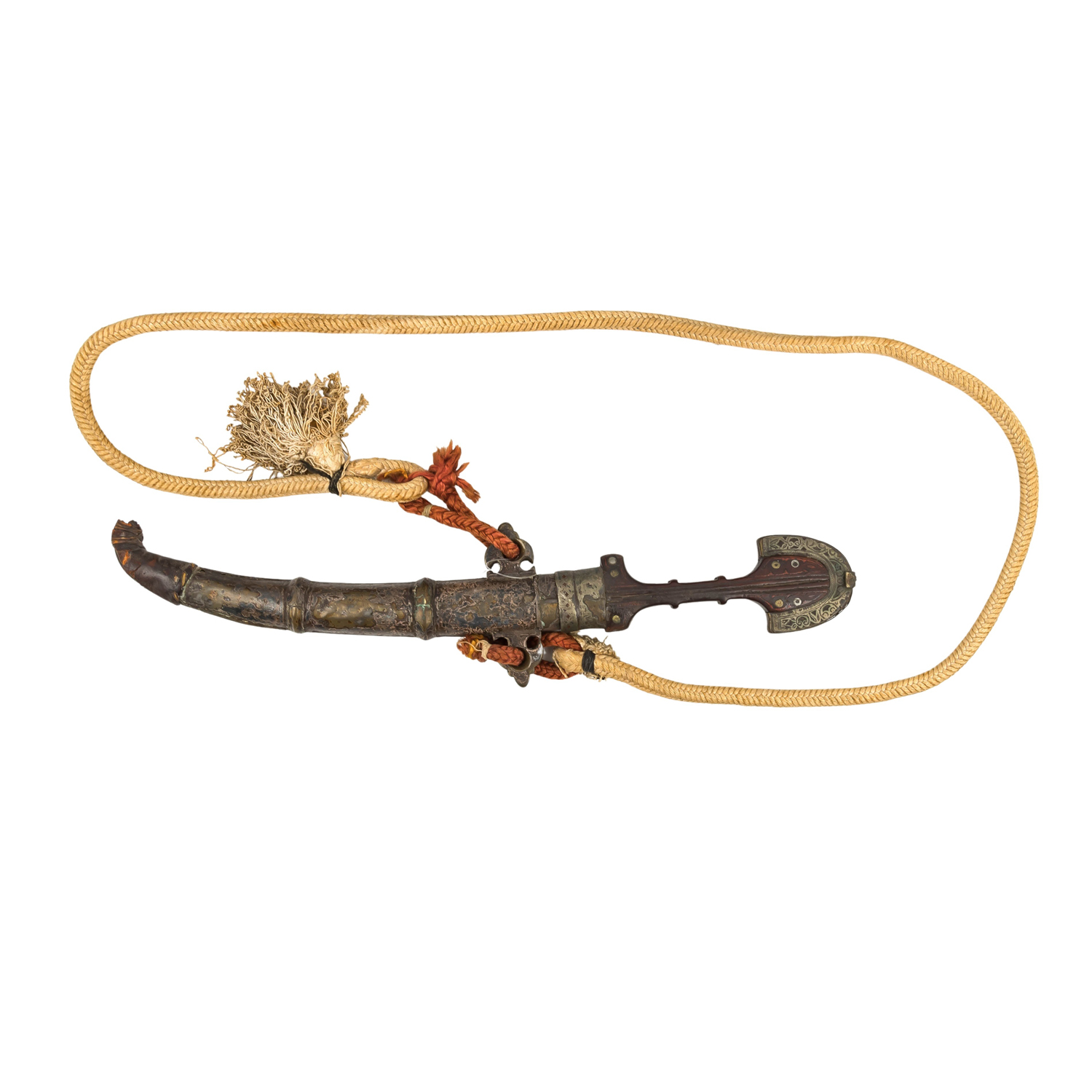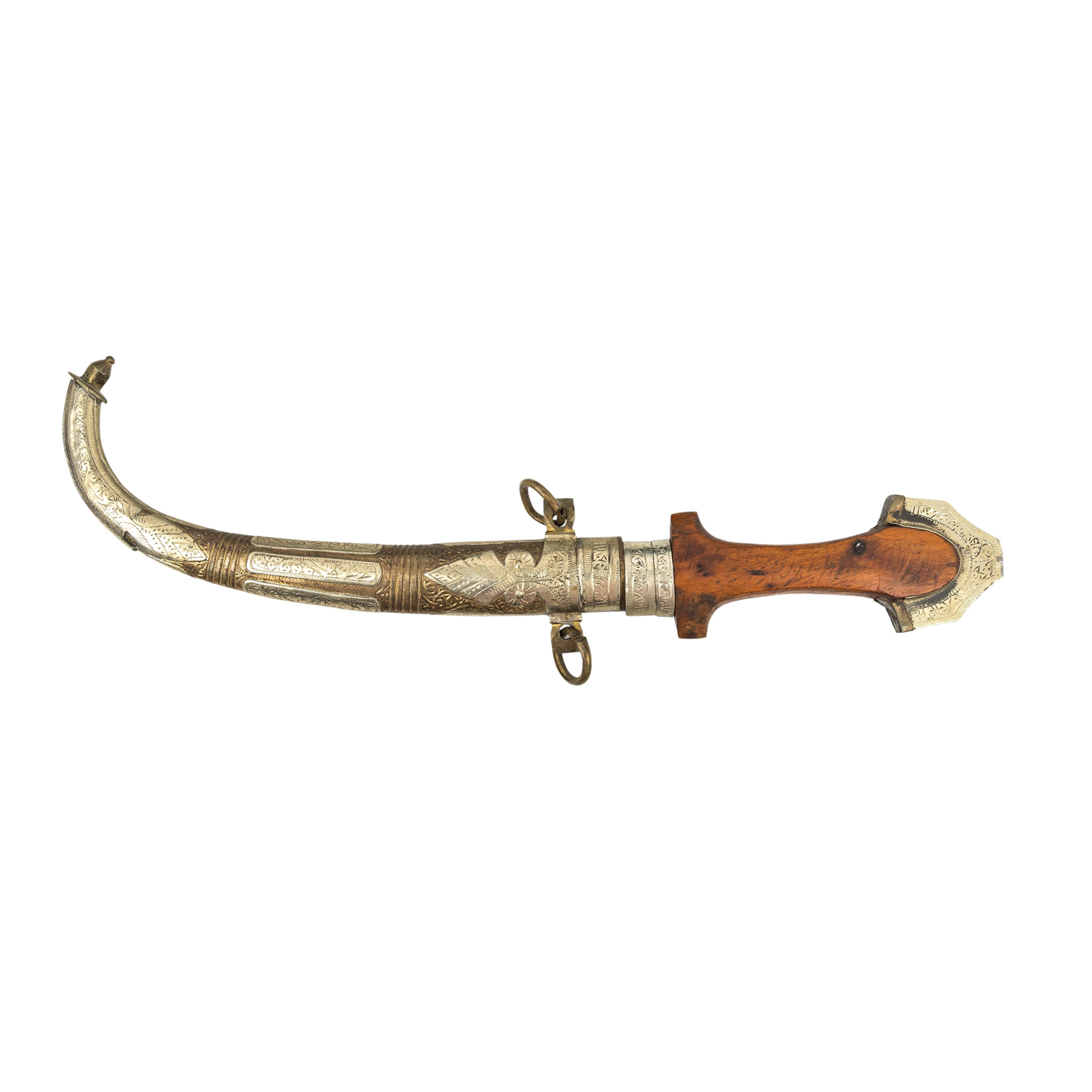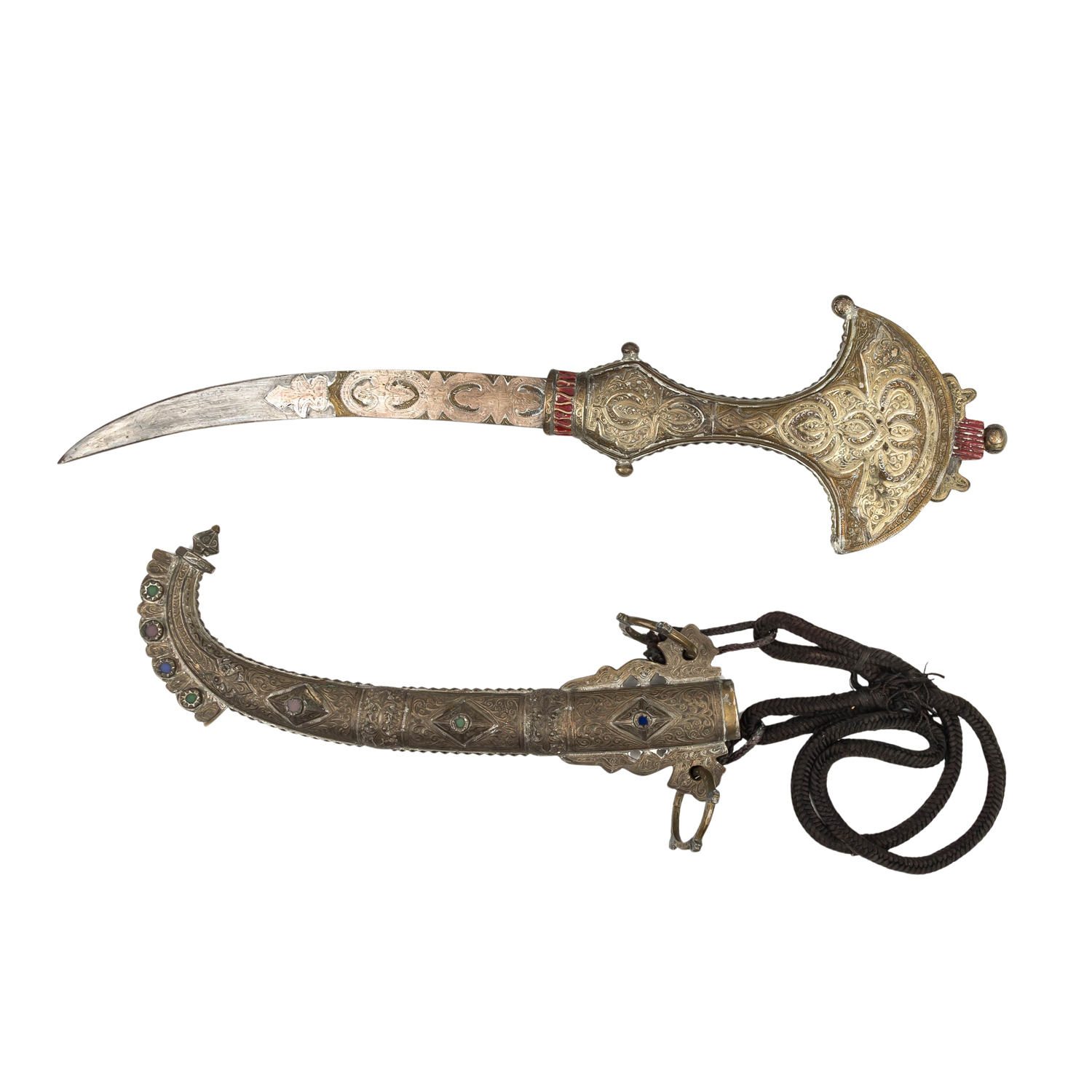 Die Zierdolche haben jeweils eine nicht geschärfte, zweischneidige, leicht gebogene Klinge. Die Knäufe haben die charakteristische Form eines Pfauenschwanzes. Die Scheiden haben jeweils an beiden Seiten Vorsprünge mit Befestigungsmöglichkeiten für die Gehängekordel (1 Krummdolch ist ohne Gehängekordel). Der große Krummdolch ist reich verziert und mit applizierten Glassteinen besetzt., L: 65 cm, 42 cm, 39 cm. Anbei: für den großen Dolch der dazugehörende, mit schwarzem Leder bezogene, bestickte Aufbewahrungskasten HxBxT: 10x25x74 cm. Besch.