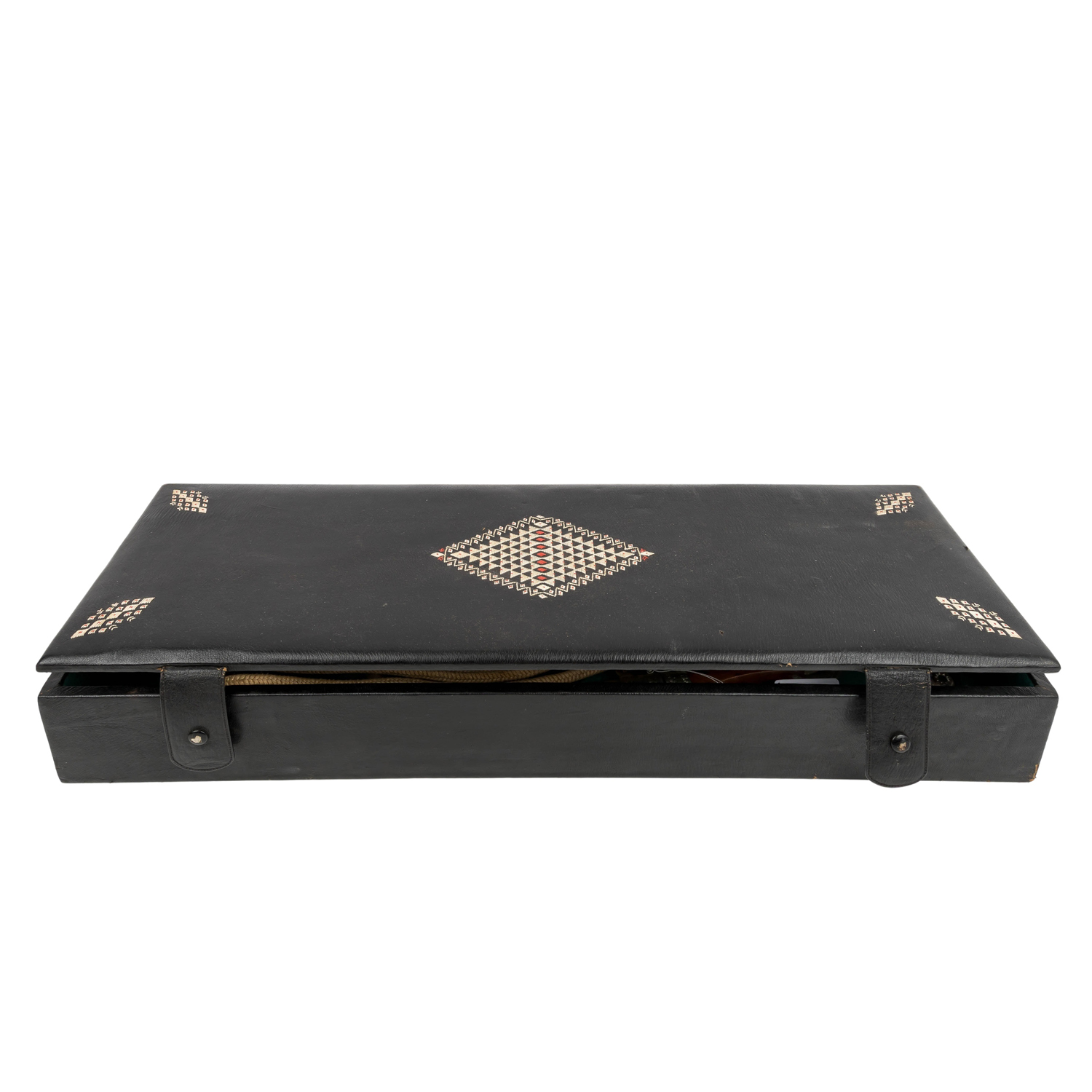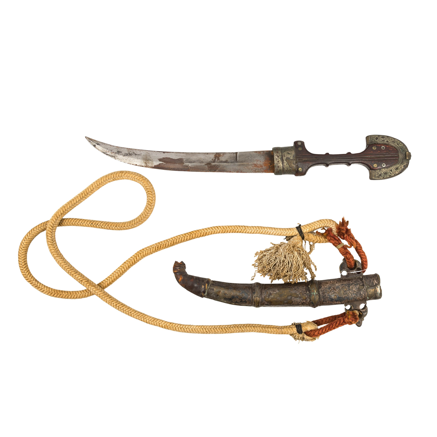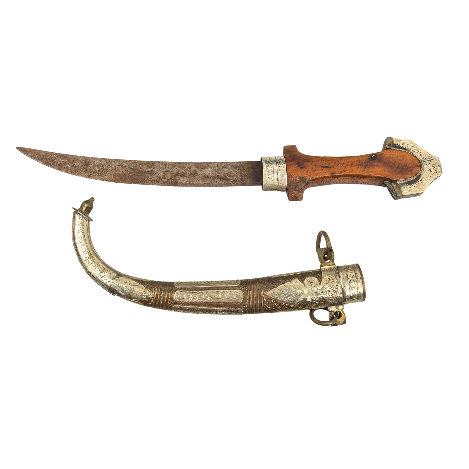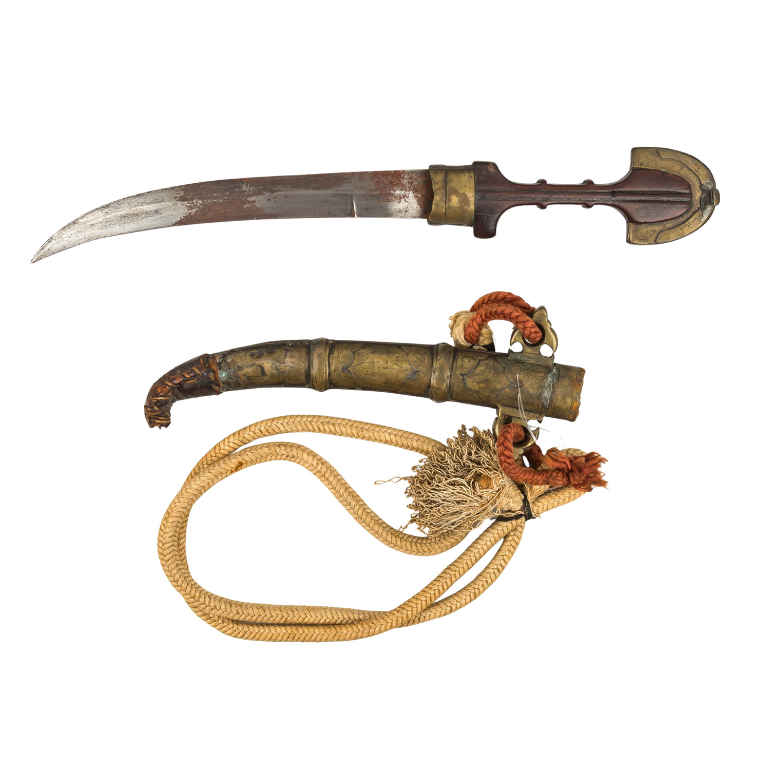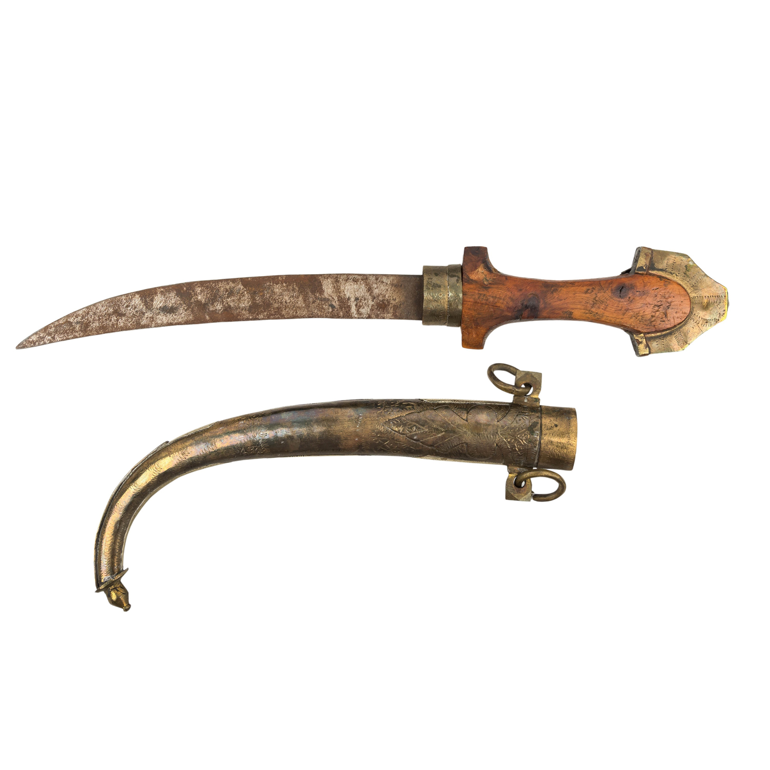 Die Zierdolche haben jeweils eine nicht geschärfte, zweischneidige, leicht gebogene Klinge. Die Knäufe haben die charakteristische Form eines Pfauenschwanzes. Die Scheiden haben jeweils an beiden Seiten Vorsprünge mit Befestigungsmöglichkeiten für die Gehängekordel (1 Krummdolch ist ohne Gehängekordel). Der große Krummdolch ist reich verziert und mit applizierten Glassteinen besetzt., L: 65 cm, 42 cm, 39 cm. Anbei: für den großen Dolch der dazugehörende, mit schwarzem Leder bezogene, bestickte Aufbewahrungskasten HxBxT: 10x25x74 cm. Besch.