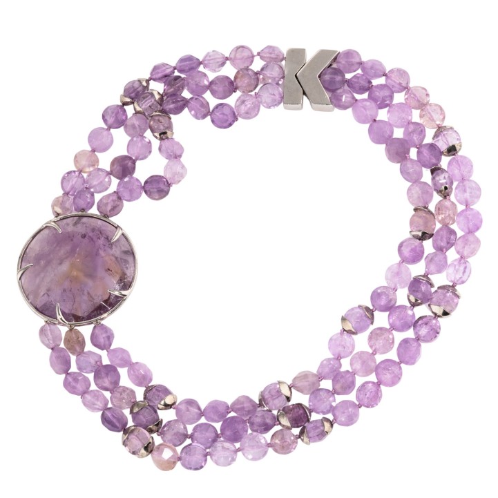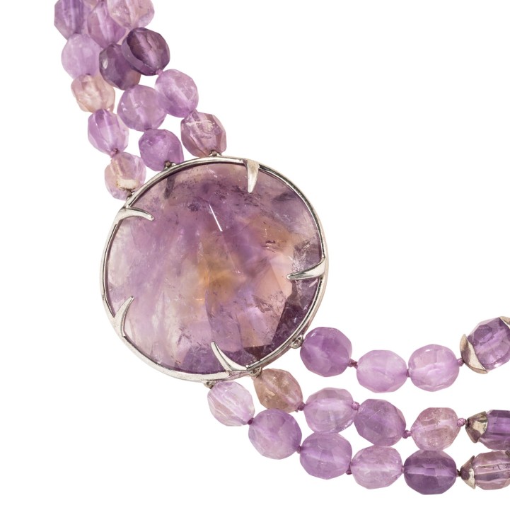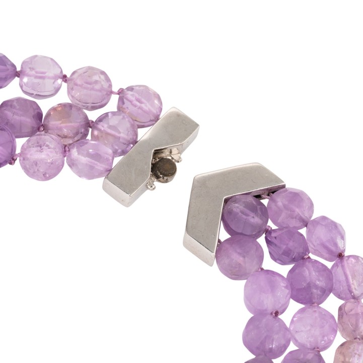 tlw. bräunliche Färbung (Ametrin), Zwischenteile u. Magnetschließe Silber, 189,9 g, Länge ca. 40 cm, 21. Jh., leichte Tragespuren, Schließe etwas leichtgängig.