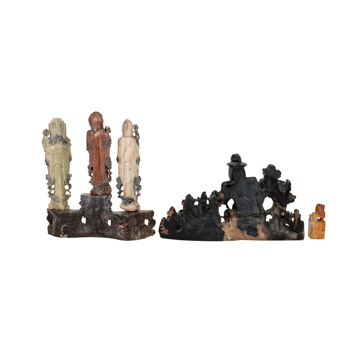 3 Schnitzereien aus Speckstein, CHINA, um 1900: 1 Pinselwaschgefäß mit Figurenschnitzerei, L.: 22 cm/1 Figurengruppe mit 3 Unsterblichen in unterschiedlichen Farben, mit Podest, H. gesamt: 21 cm/1 kleine Petschaft mit Löwenbekrönung, H.: 5,5 cm. Tlw besch., mit Alters- und Gebrauchsspuren.