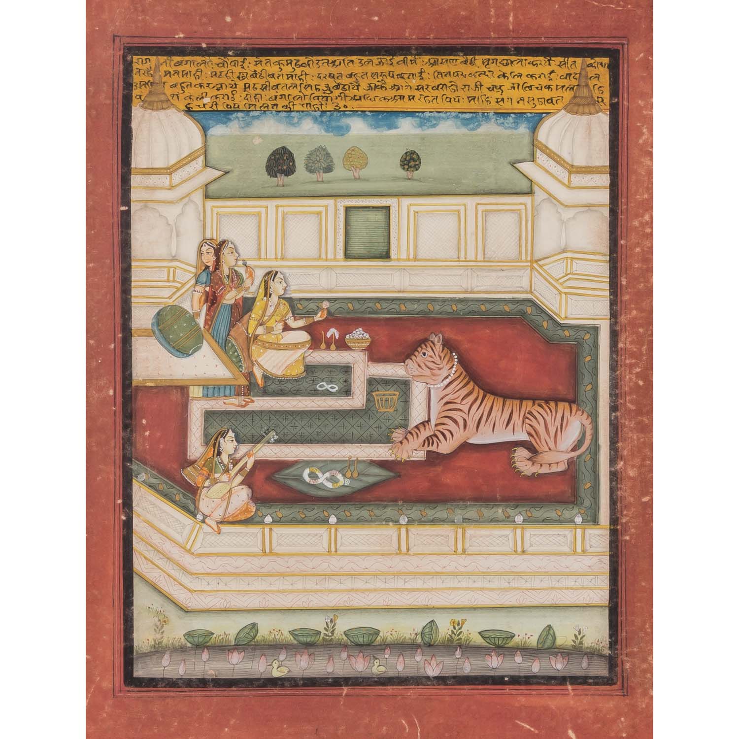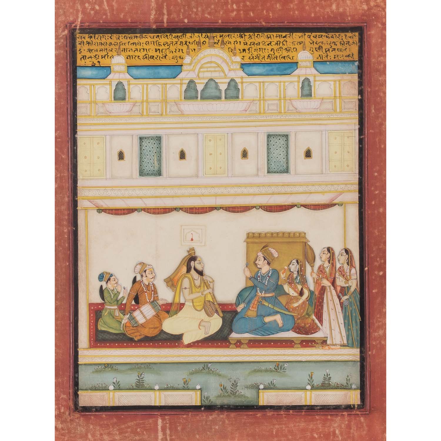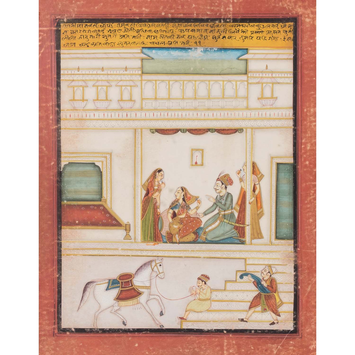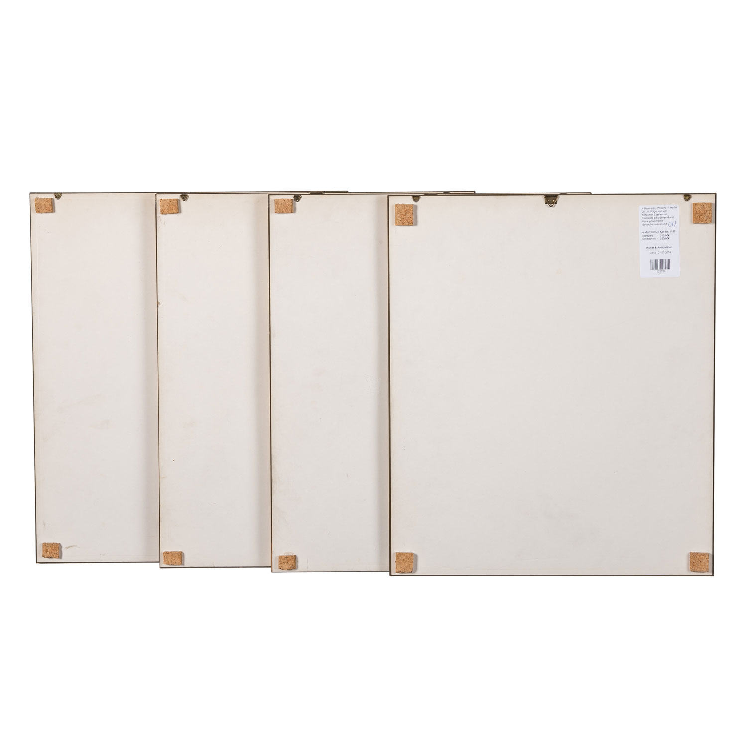 Folge von vier höfischen Szenen mit Textleiste am oberen Rand. Feine polychrome Gouachemalerei und schwarze Tinte auf Papier. Alle Blätter sind mehrfach schwarz umrandet und durch einen breiten, rötlichen Randstreifen hervorgehoben. In Passepartout montiert und hinter Glas gerahmt. Größe mit Rahmen: 43x36 cm. Altersspuren, besch.