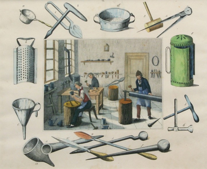 5 Bl. alte Handwerksdarstellungen, um 1860, colorierte Lithographien, erschienen im Schreiber Verlag Esslingen, Bl.gr. je 33 x 38, Rahmen.