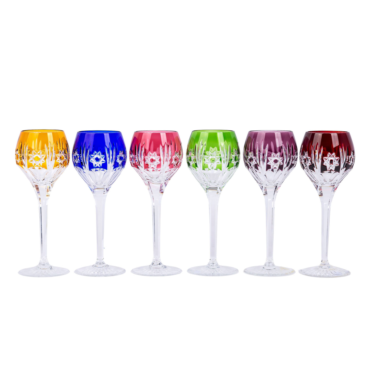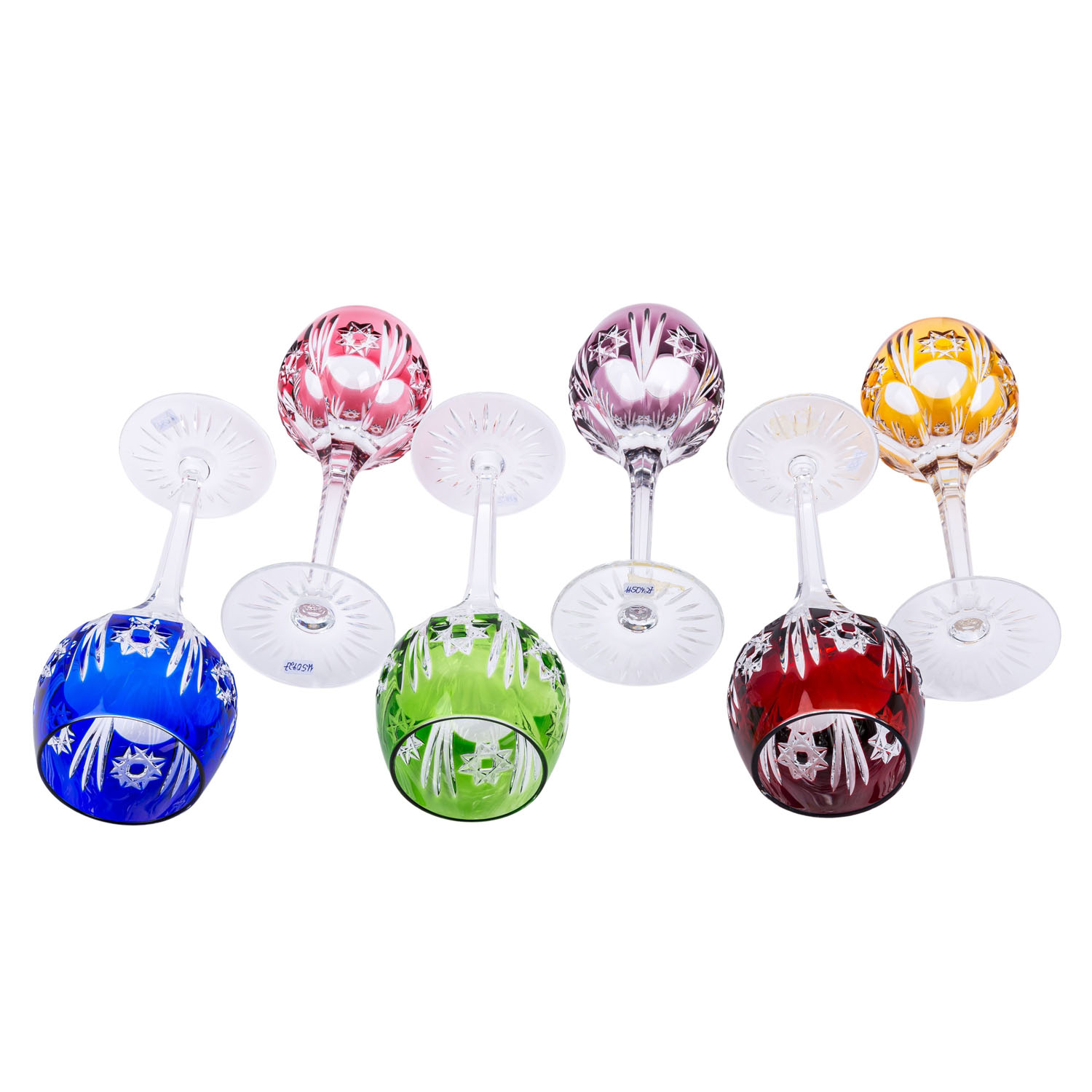 Farbloses Kristallglas mit verschiedenfarbigen Überfängen und Sternenschliffdekor, 3 Gläser mit nicht aufgelöster Ätzsignatur, H. ca. 21,5 cm.