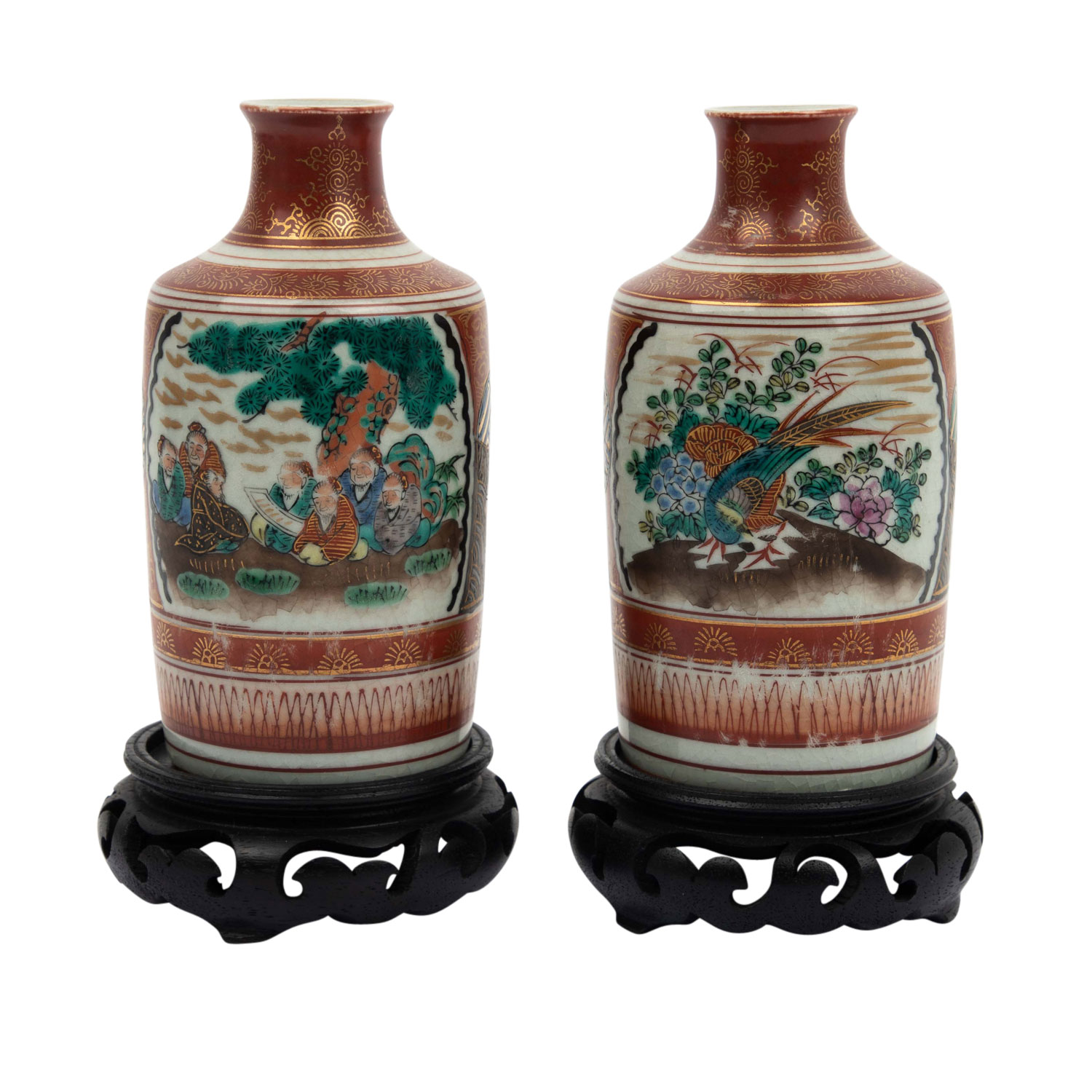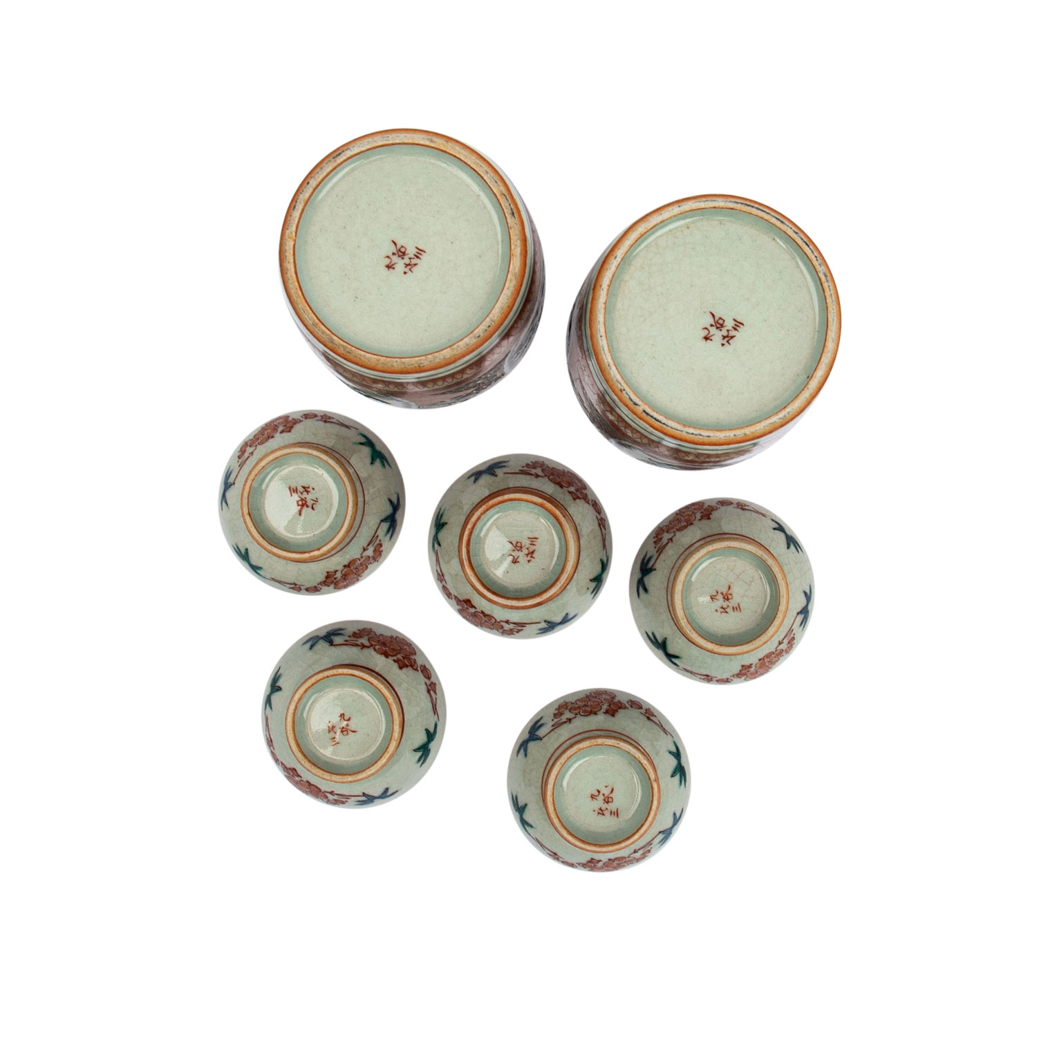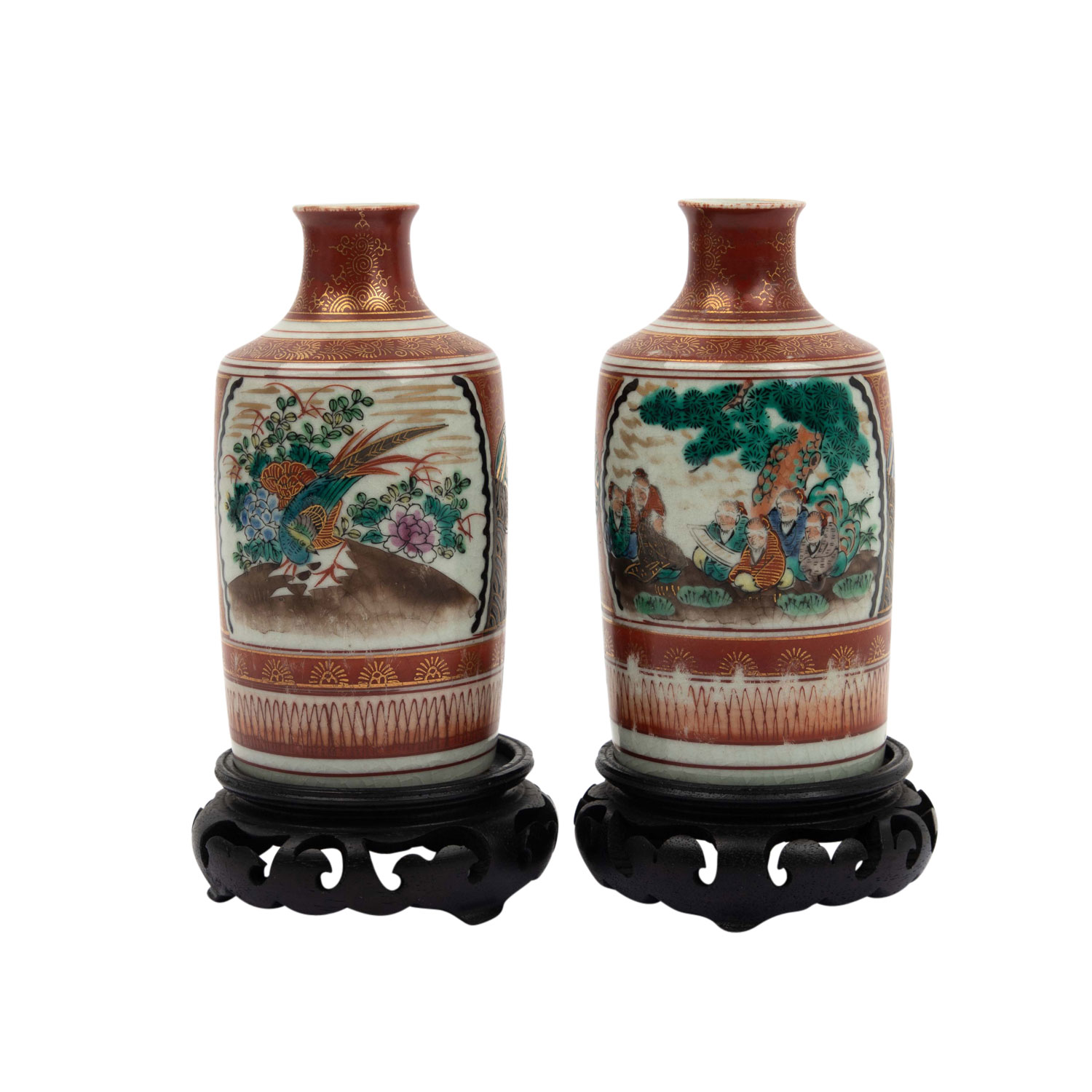 2 Sake Flaschen und 5 Sake Trinkschalen. Rotes Kutani, goldverziert, die Flaschen sind bemalt schau- und rückseitig je mit einer Reserve mit einer figürlichen Szene und mit einem Fasan vor blühenden Zweigen. Die 5 Trinkschalen sind innen ebenfalls figürlich verziert. Unterseitige, eisenrote Marken, H. 13 cm, berieben, mit 2 Holzsockeln. AUS DEM NACHLASS DER EHELEUTE ALFRED UND GISELA DIENST