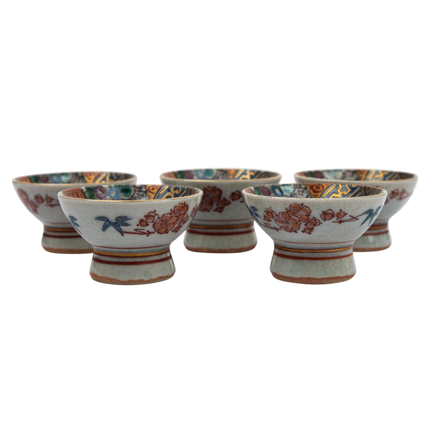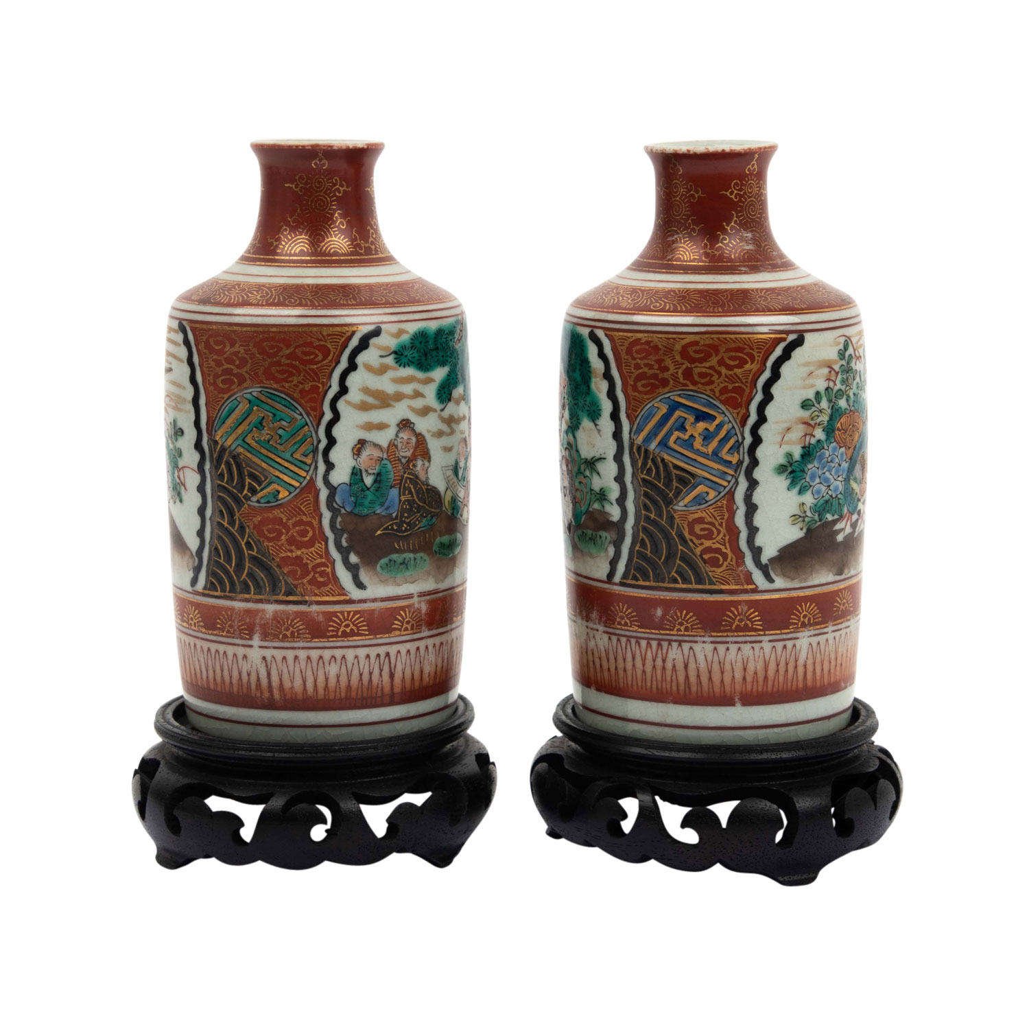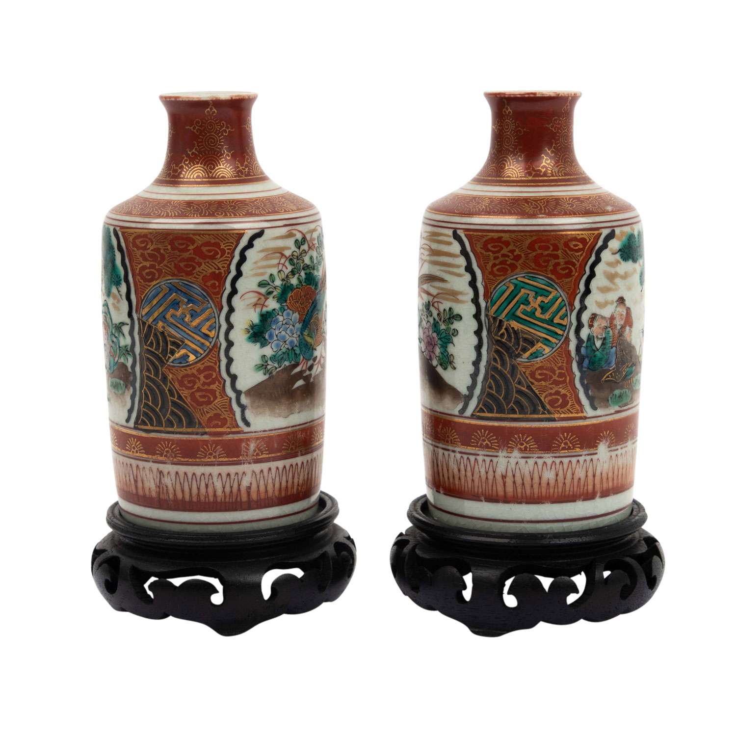 2 Sake Flaschen und 5 Sake Trinkschalen. Rotes Kutani, goldverziert, die Flaschen sind bemalt schau- und rückseitig je mit einer Reserve mit einer figürlichen Szene und mit einem Fasan vor blühenden Zweigen. Die 5 Trinkschalen sind innen ebenfalls figürlich verziert. Unterseitige, eisenrote Marken, H. 13 cm, berieben, mit 2 Holzsockeln. AUS DEM NACHLASS DER EHELEUTE ALFRED UND GISELA DIENST