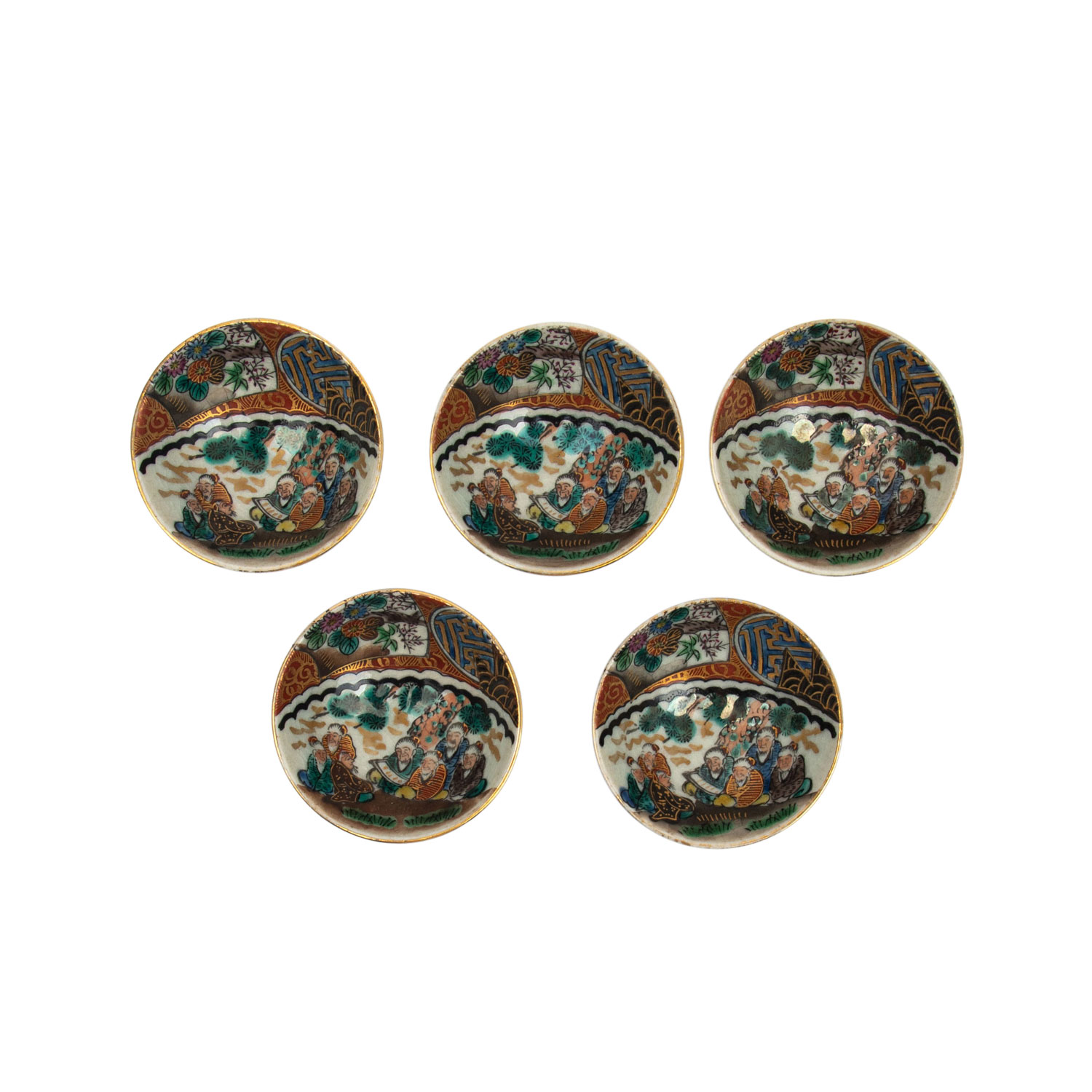 | 7-piece sake set: made of KUTANI porcelain, JAPAN, Meiji period (1868-1912). 2 sake bottles and 5 sake drinking bowls. Red kutani, gold decorated, the bottles are painted on the front and back each with a reserve with a figural scene and with a pheasant in front of flowering branches. The 5 drinking bowls are also figurally decorated inside. Underside, iron red marks, h. 13 cm, worn, with 2 wooden bases. FROM THE ESTATE OF ALFRED AND GISELA