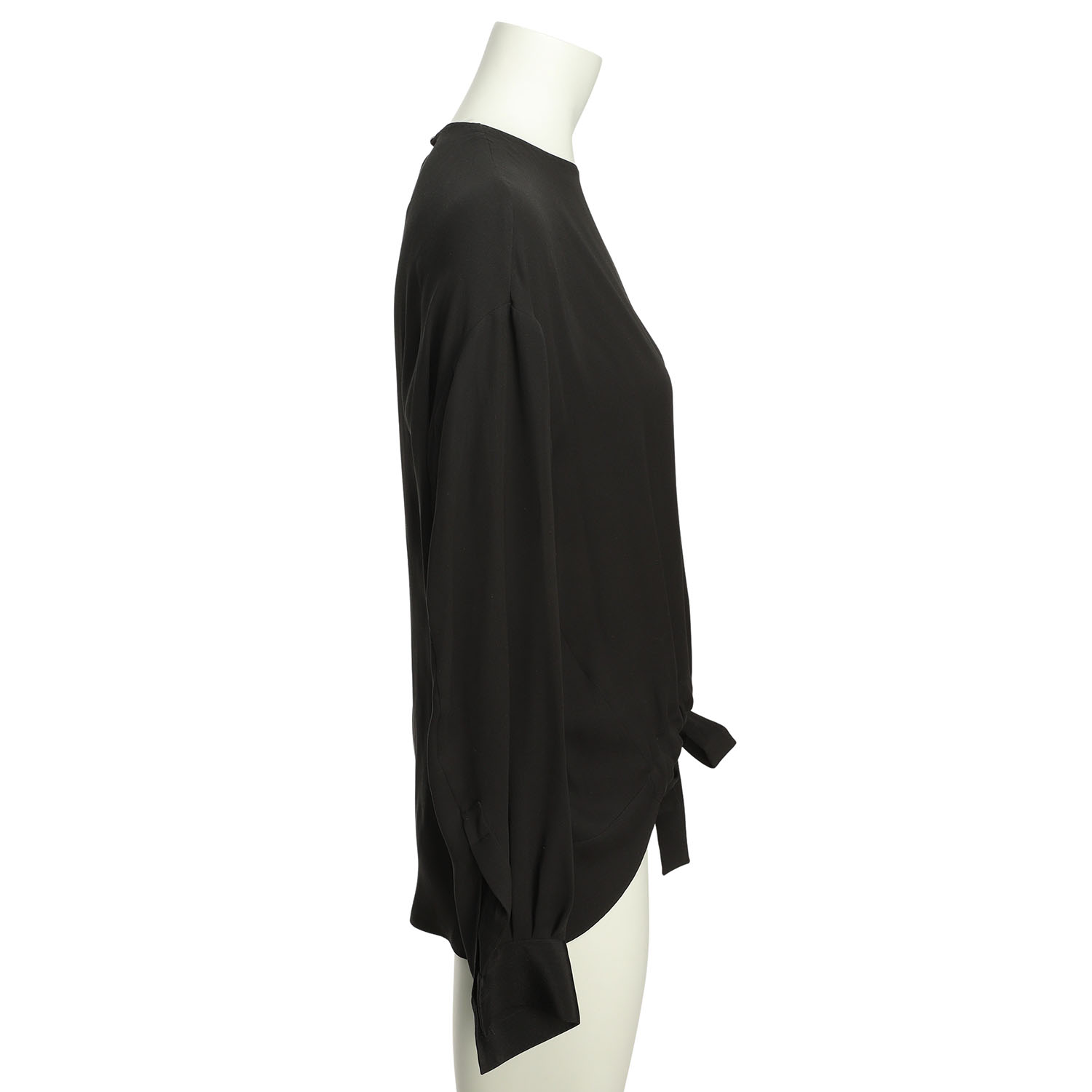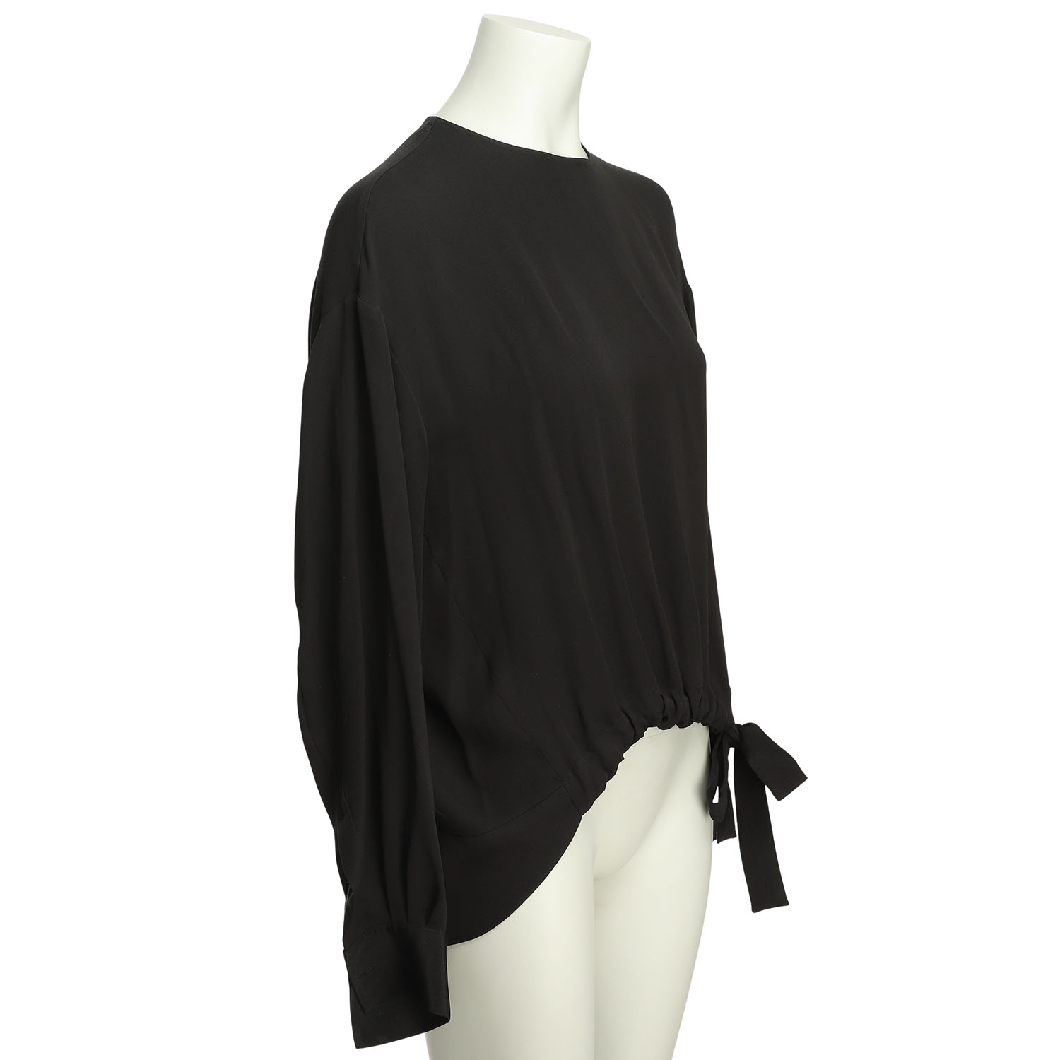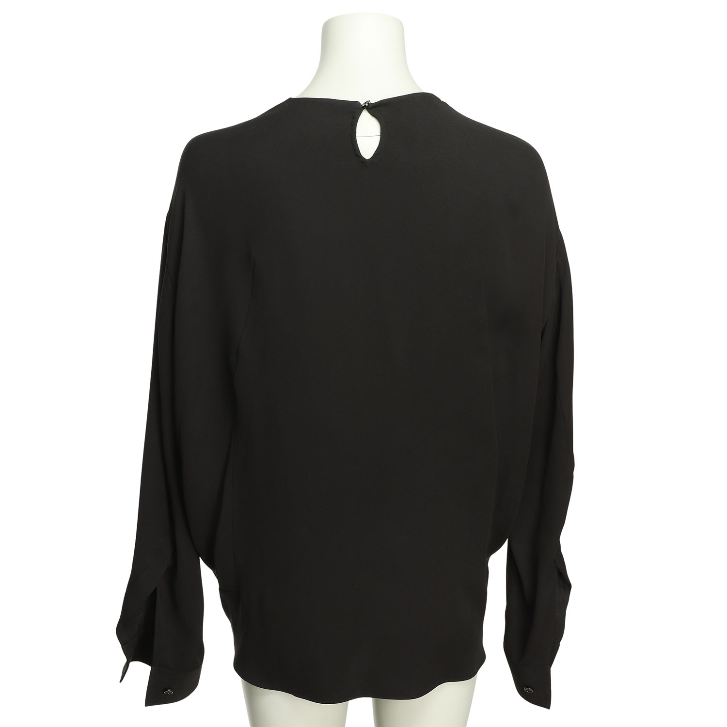100% Seide in Schwarz. Weiter Schnitt mit Manschetten und Saum mit Zugband. Sehr guter Erhalt.