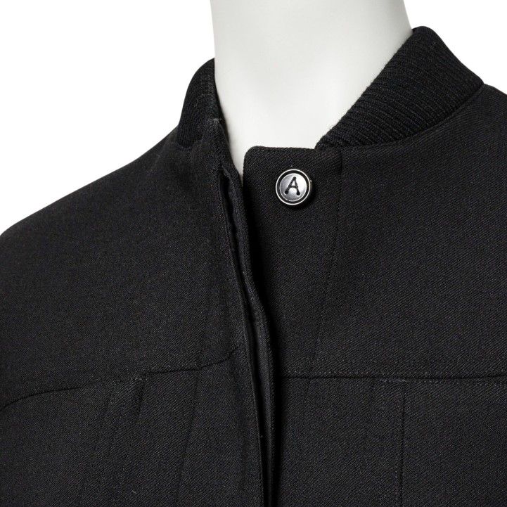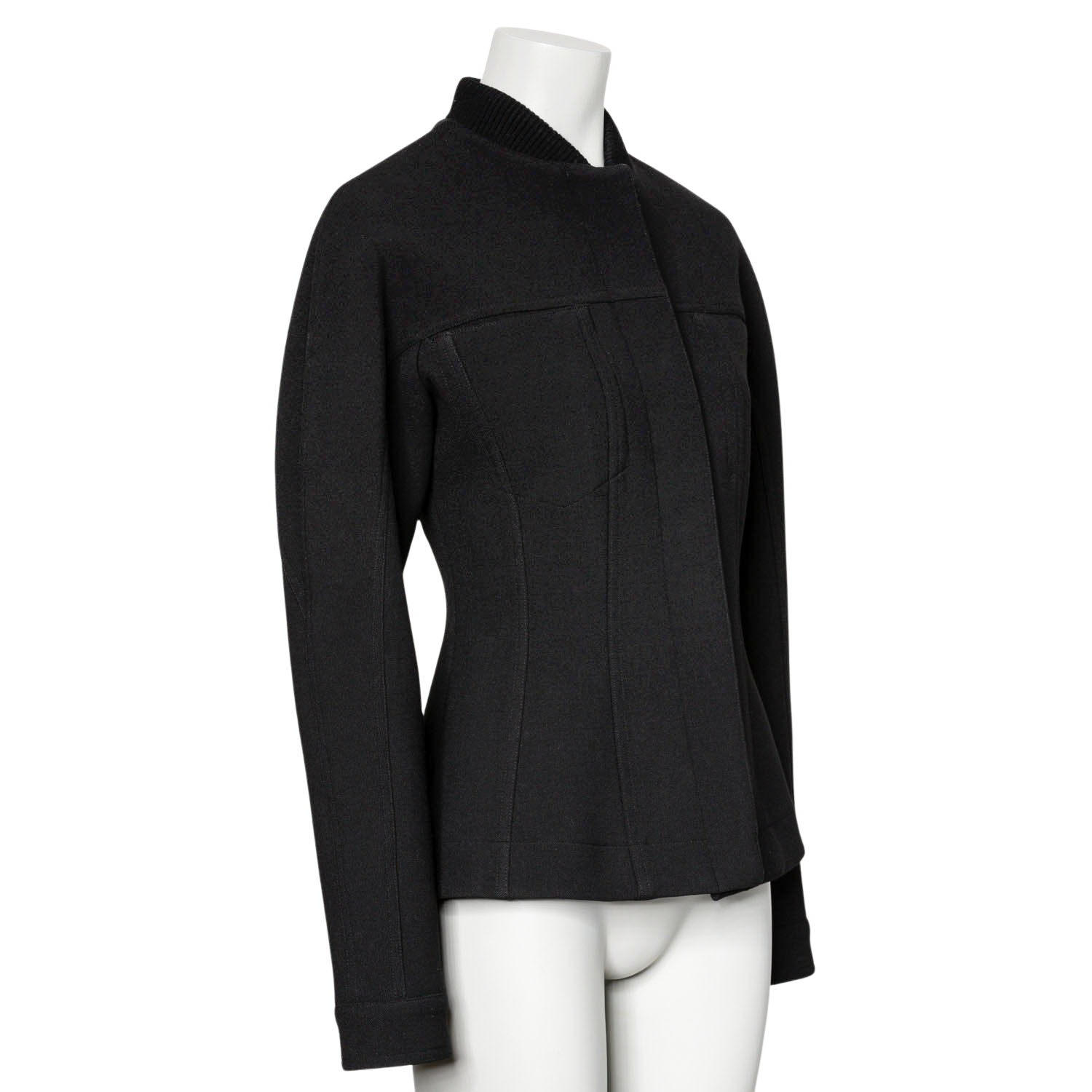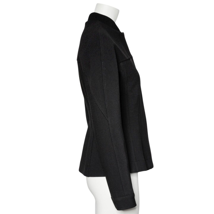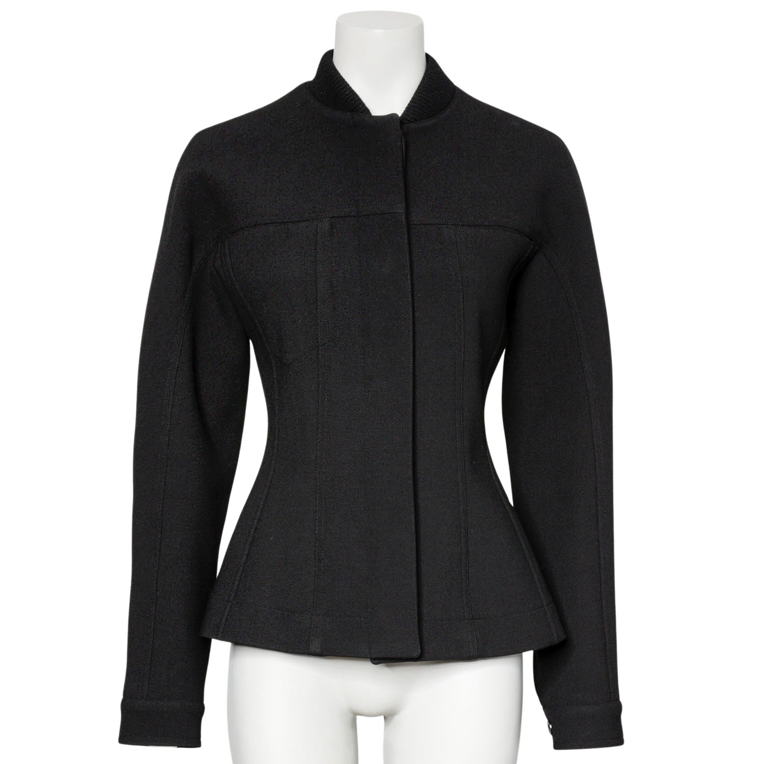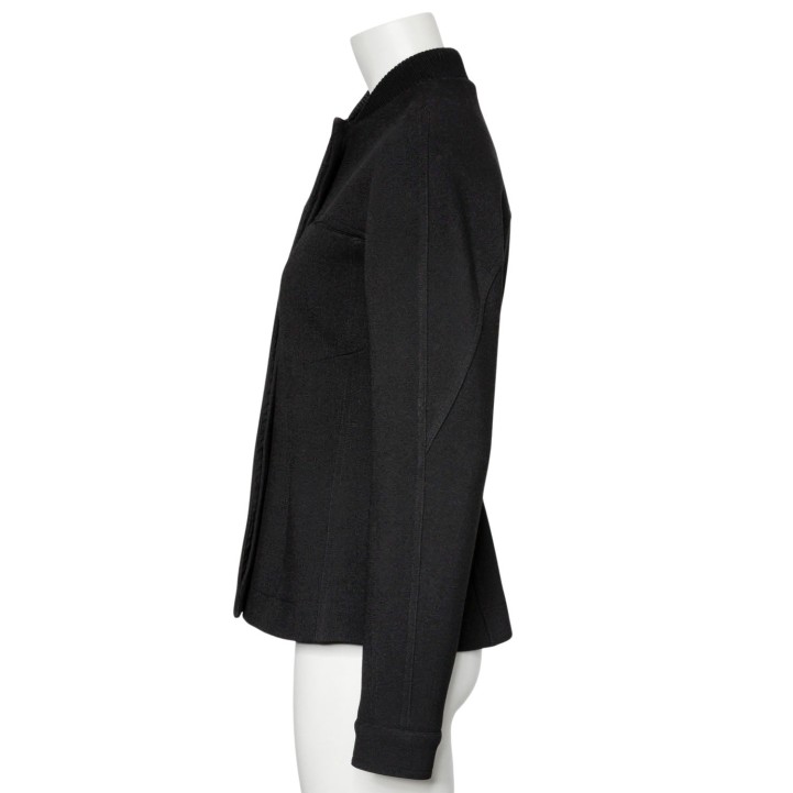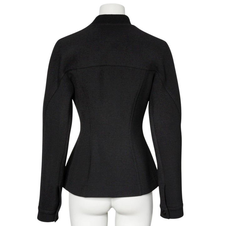 Schurwollegemisch. Schwarzes Modell mit Knopfverschluss, starker Tallierung, Brusttaschen und Stehkragen. Guter Zustand.
