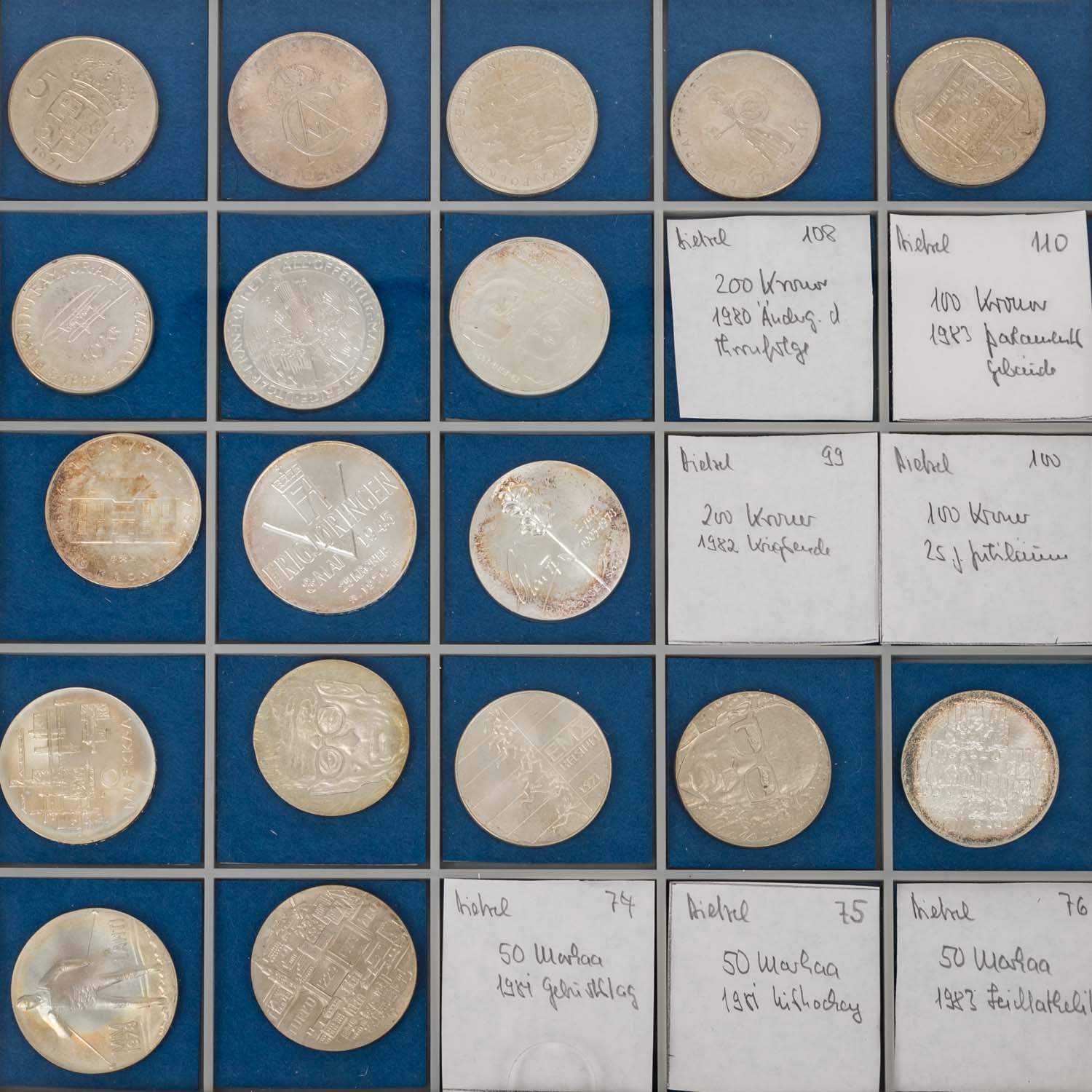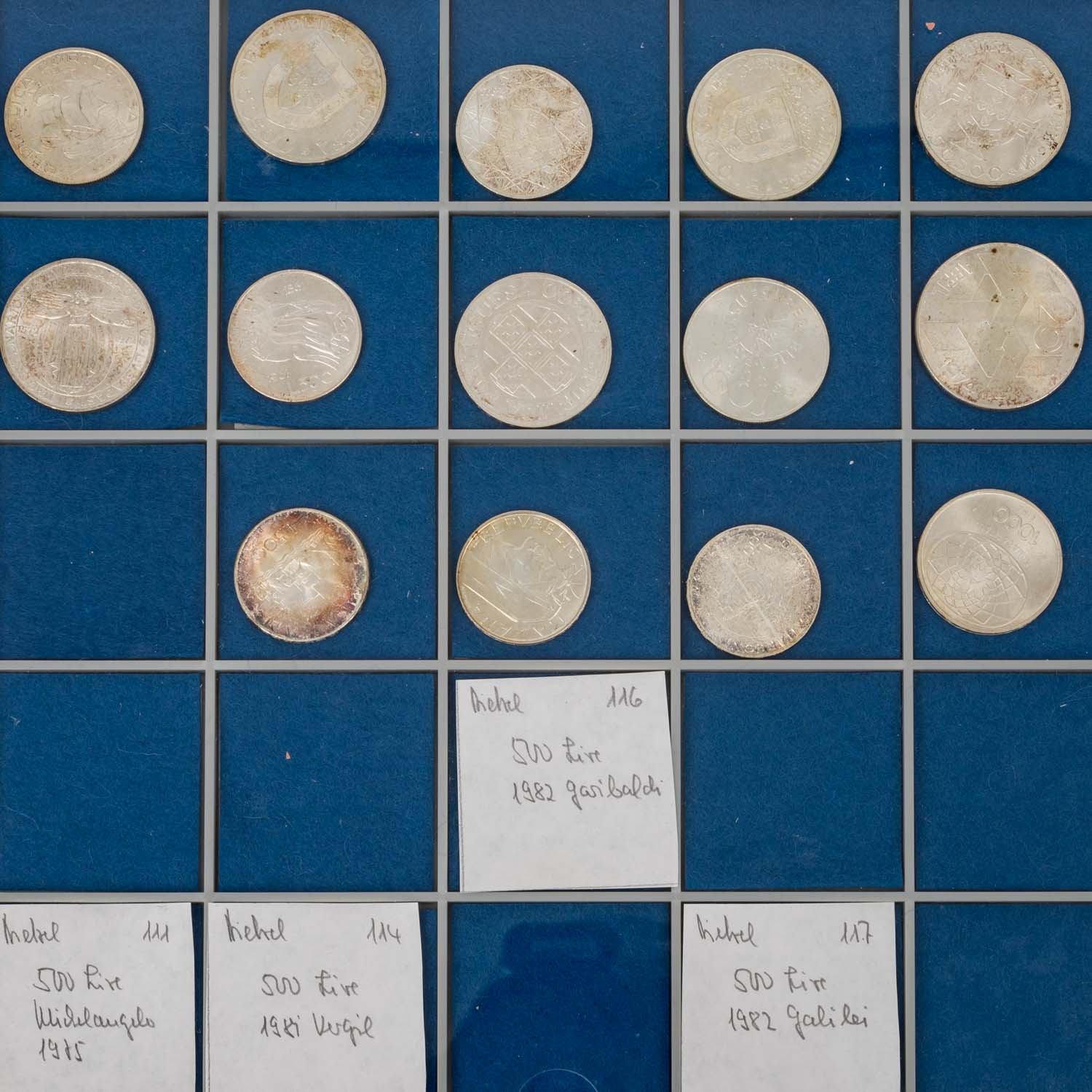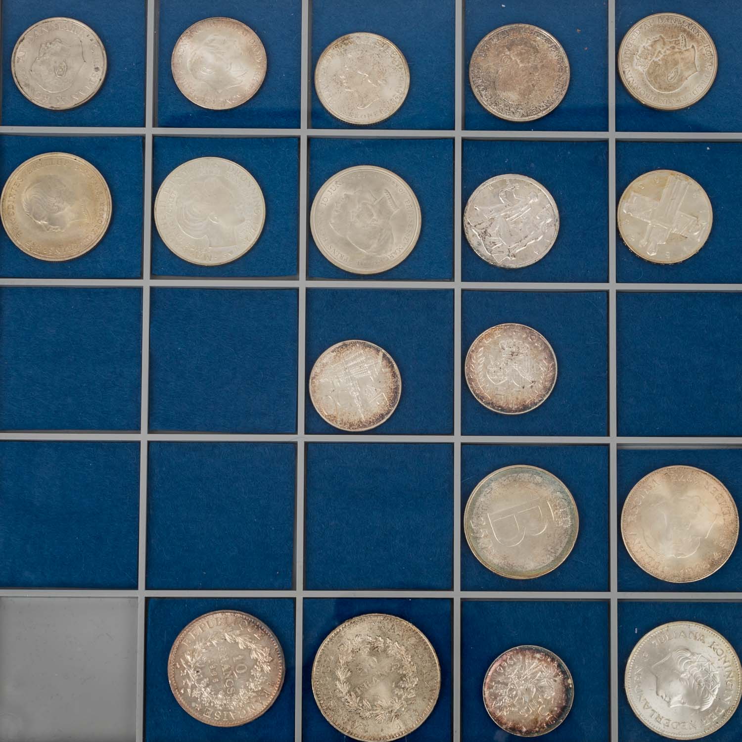 Diverse Münzen überwiegend in Silber u.a. aus Italien, Frankreich, Niederlande, Dänemark, Belgien, Finnland, etc. vor allem 50er bis 70er Jahre, unterschiedliche Erhaltungsstufen, meistens vz, teils mit Patina. In drei Tableaus.