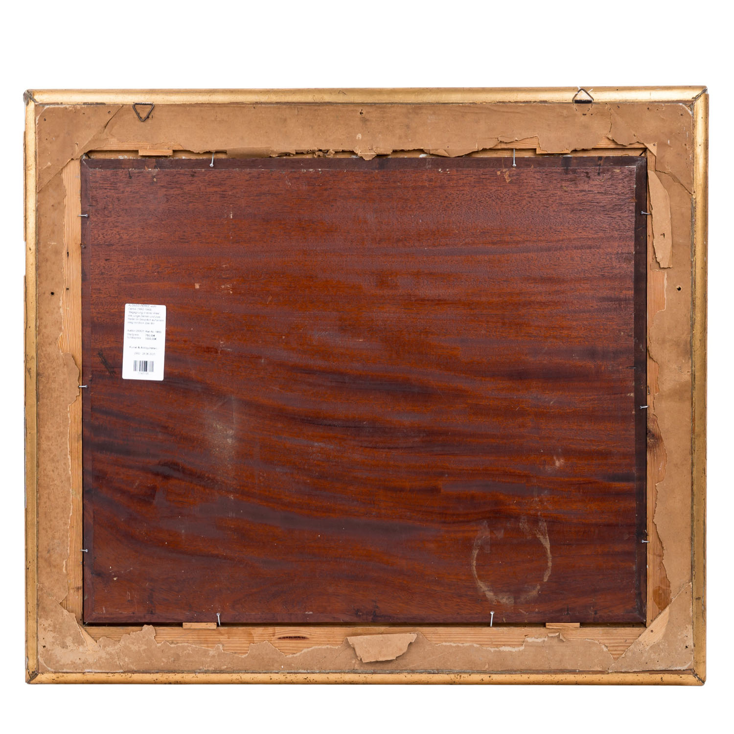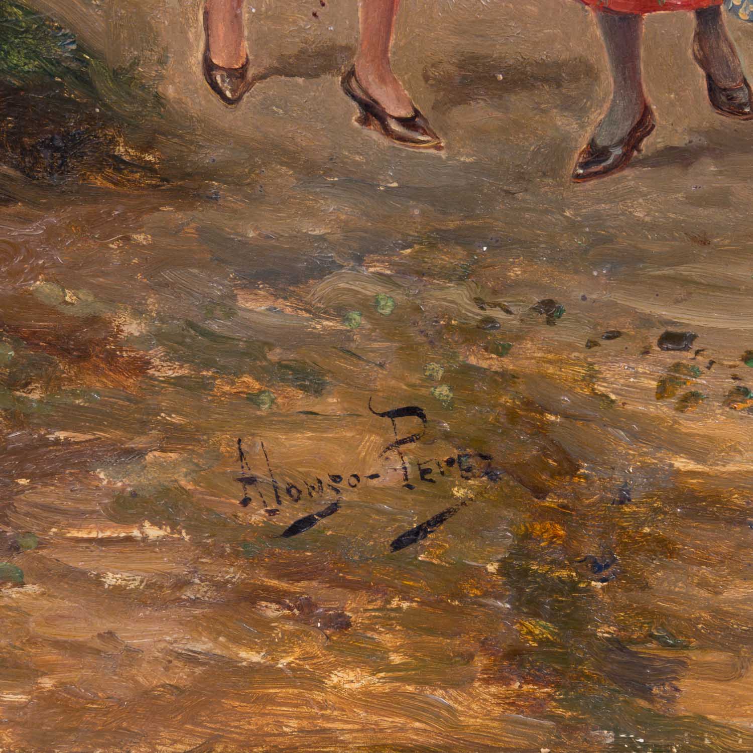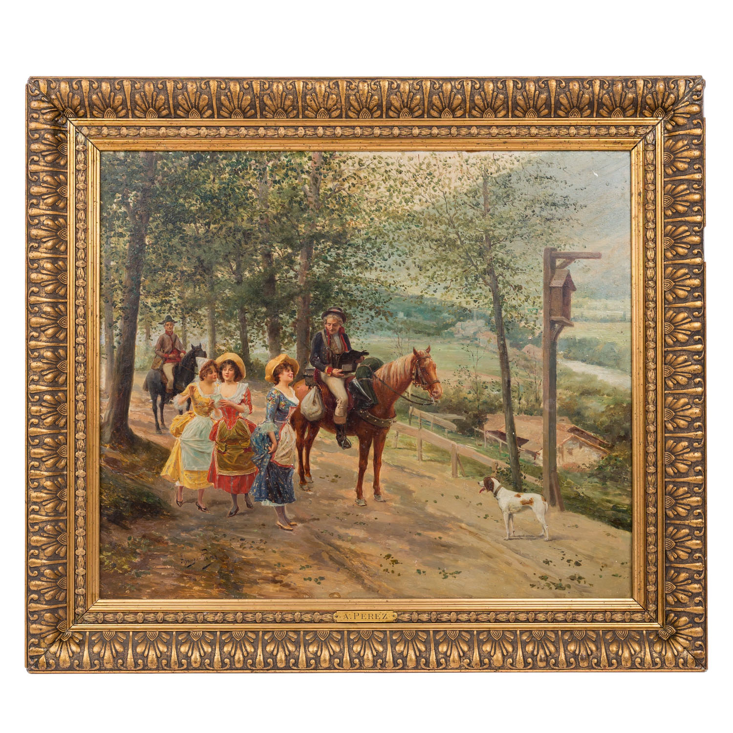drei junge Damen und zwei Reiter im Gespräch auf einem Weg mit Blick über ein Flusstal, u.li. signiert 'Alonso-Perez', Öl/Holztafel, HxB: ca. 50x60 cm (65x75 cm mit Rahmen). Alters- und Beriebspuren, wenige Farbabplatzer bzw. Kratzer. Mit Rahmen (beschädigt), mit Plakette mit Künstlerbezeichnung 'A. Perez'.