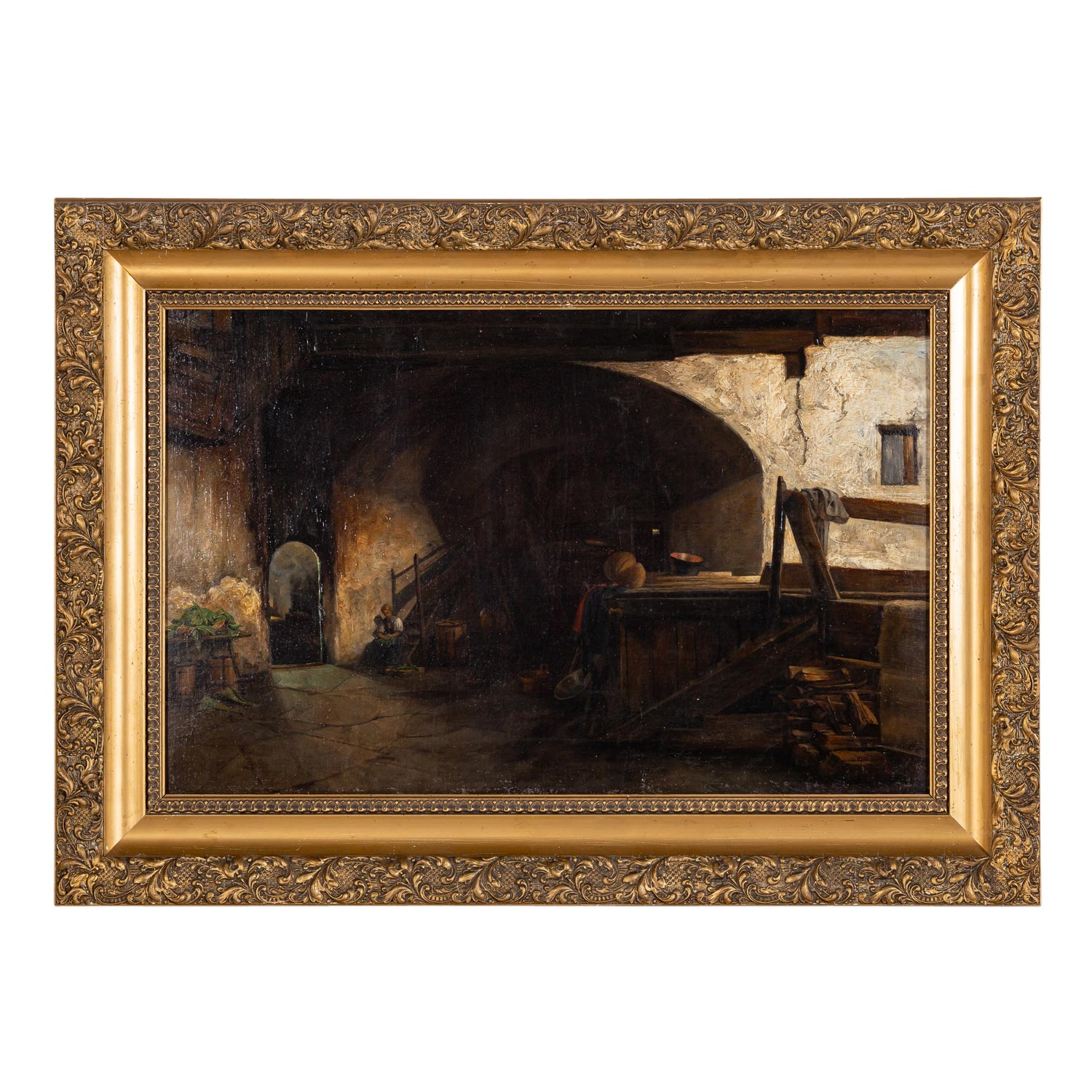 im Schatten an der Treppe sitzend, Öl/Leinwand doubliert, HxB: ca. 39x60 cm (54,5x76 cm mit Rahmen). Alters- und Beriebspuren, restauriert und part. retuschiert. Mit Ramen (Fassung part. berieben). PROVENIEZ: 1976 bei Kunst- und Auktionshaus Dr. Fritz Nagel, Stuttgart erworben (Rg. mit Nennung 'Gem. Ambros, Wilh.' liegt bei).