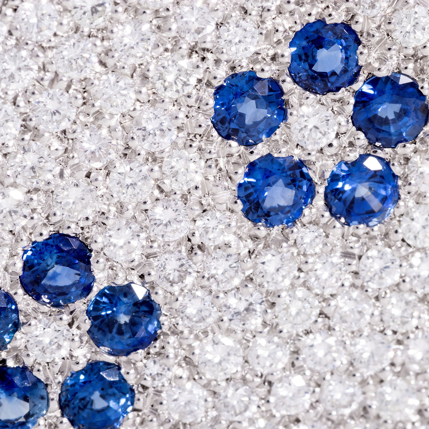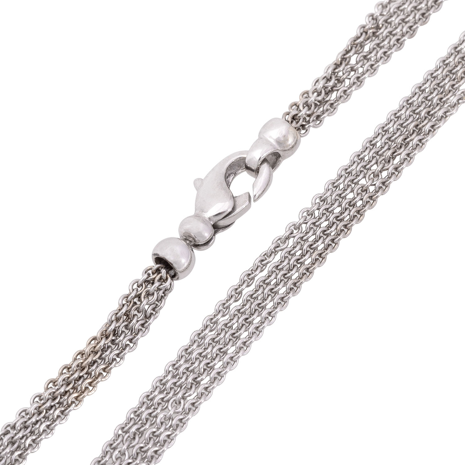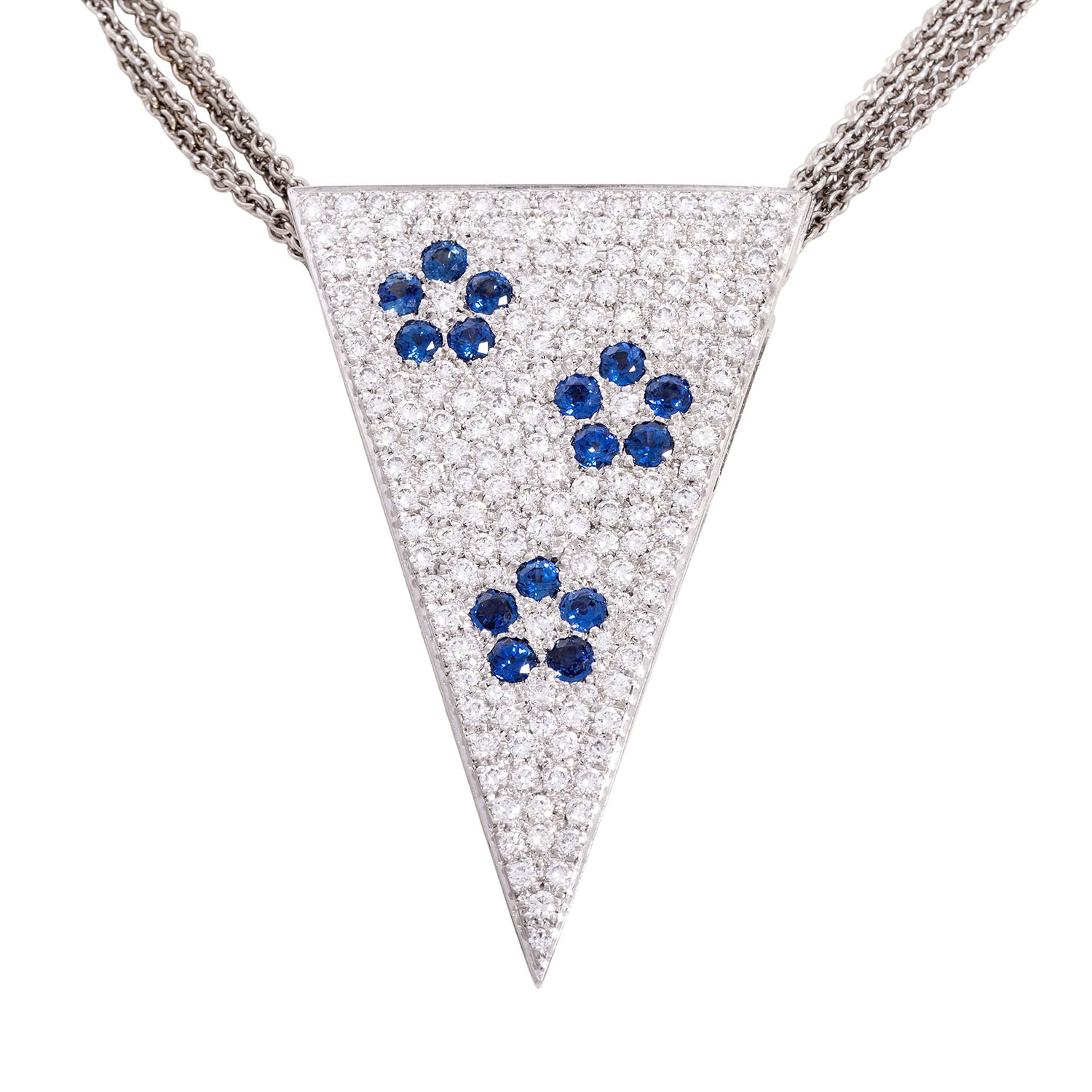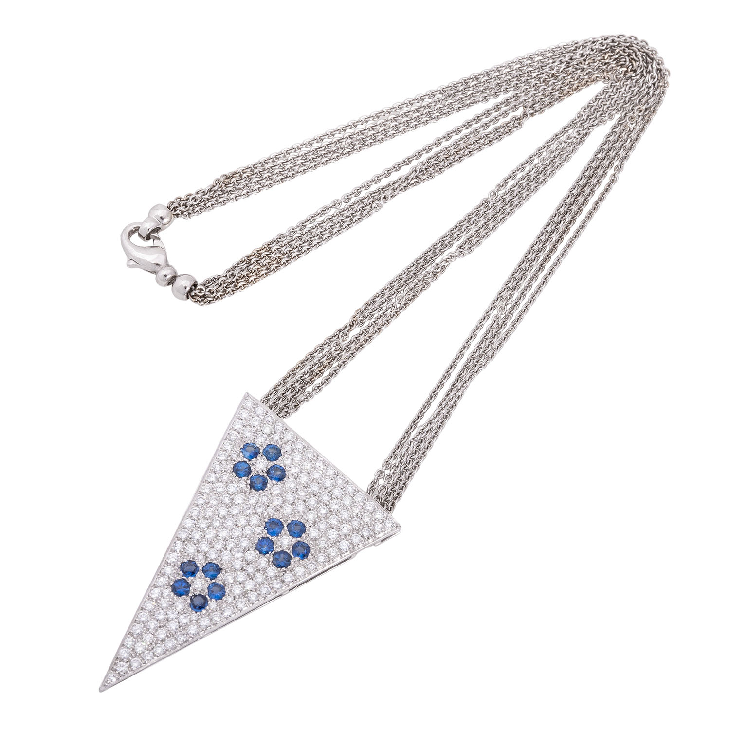 Anhänger besetzt mit Brillanten von ca. 3,0 ct, gute bis mittlere Farbe und Reinheit, 15 rund facettierte Saphire, zus. ca. 1,5 ct, WG 18K, 51,7 g, L.: 51 cm, 20./21. Jh., an zwei Ecken verbogen, Tragespuren.