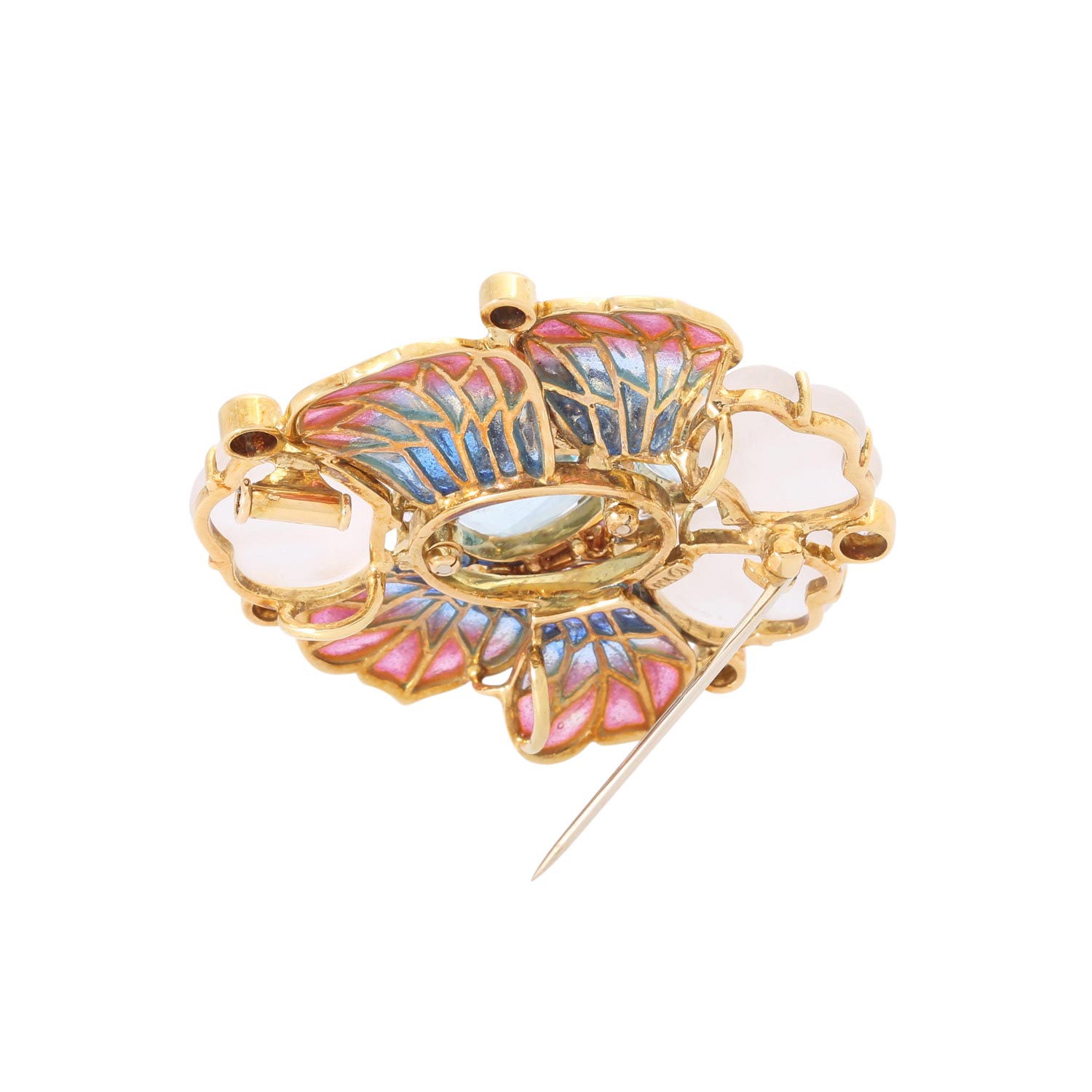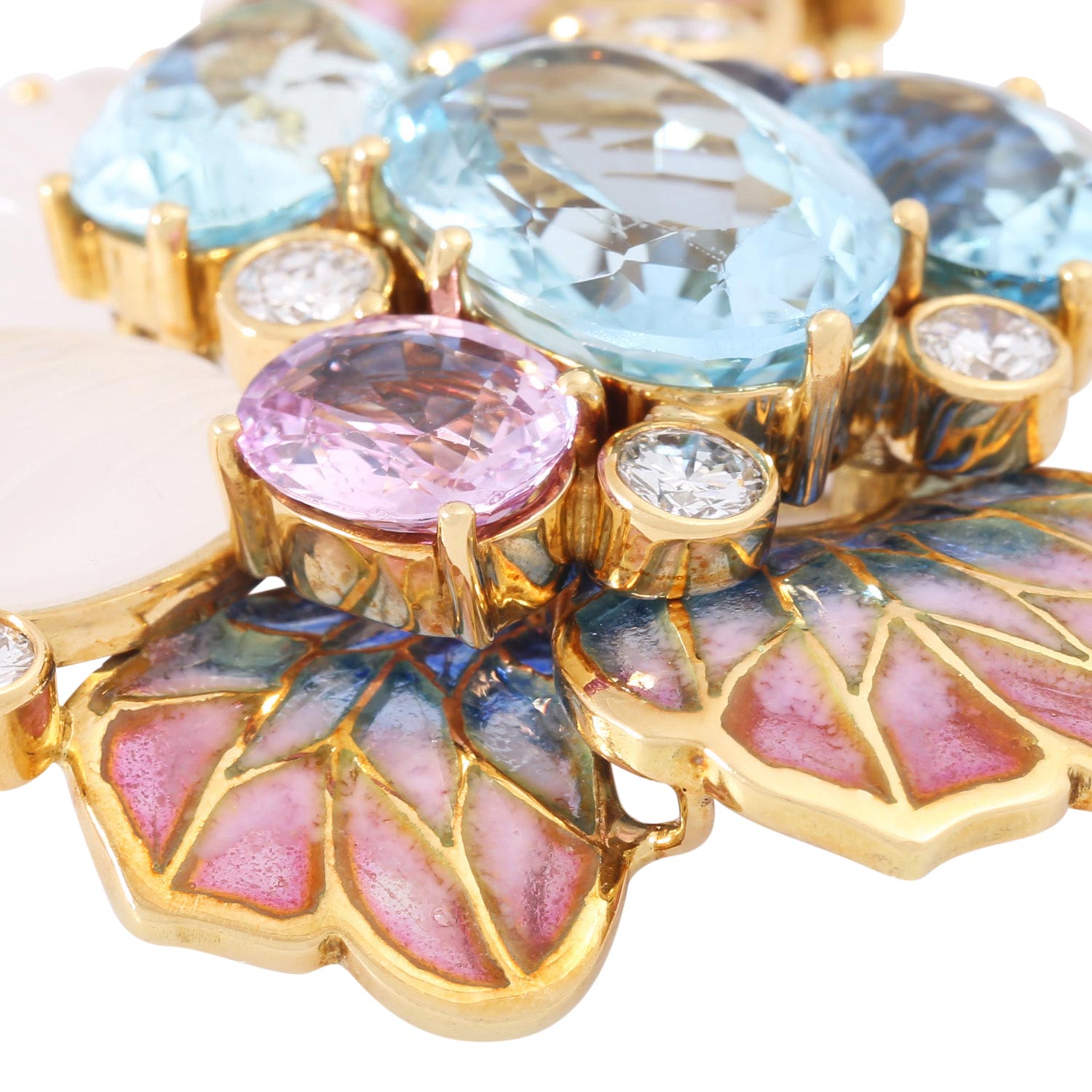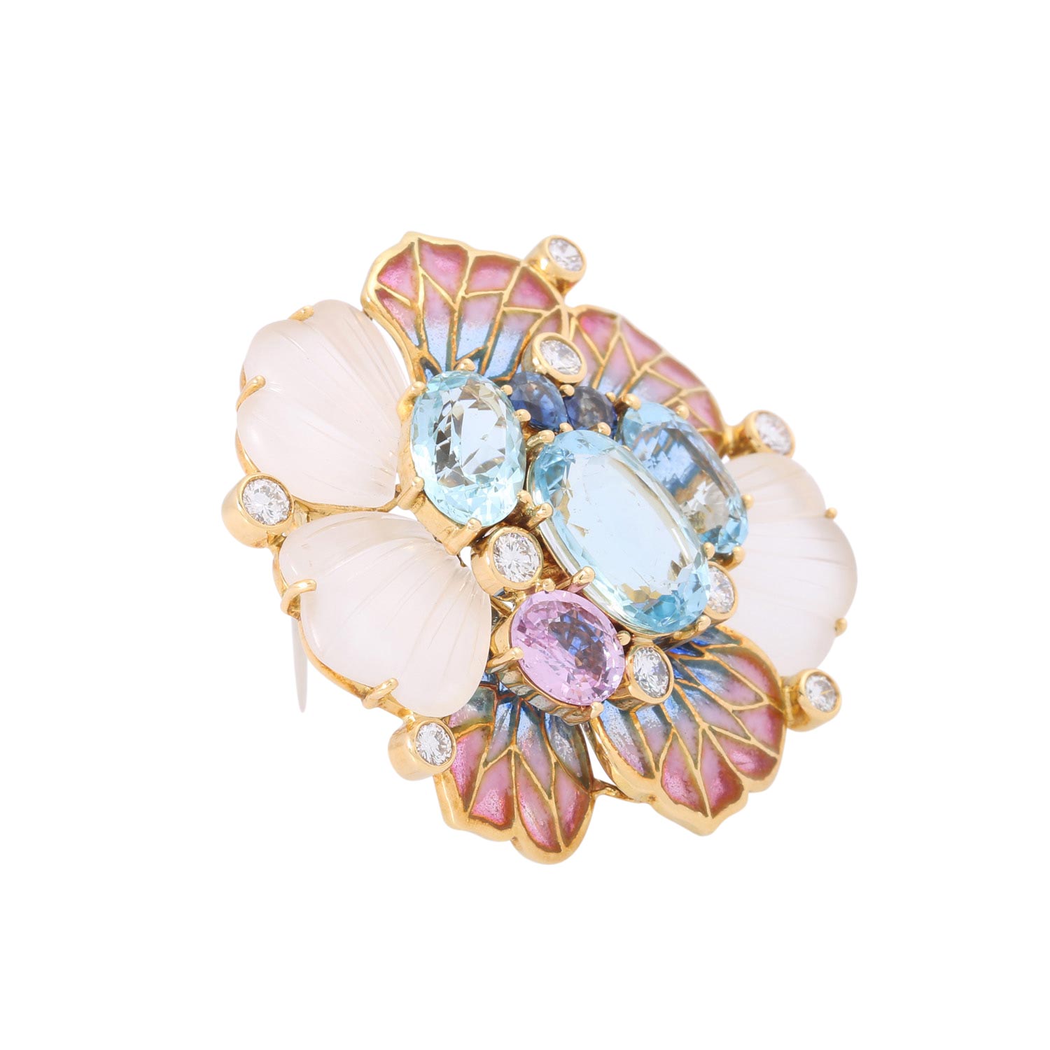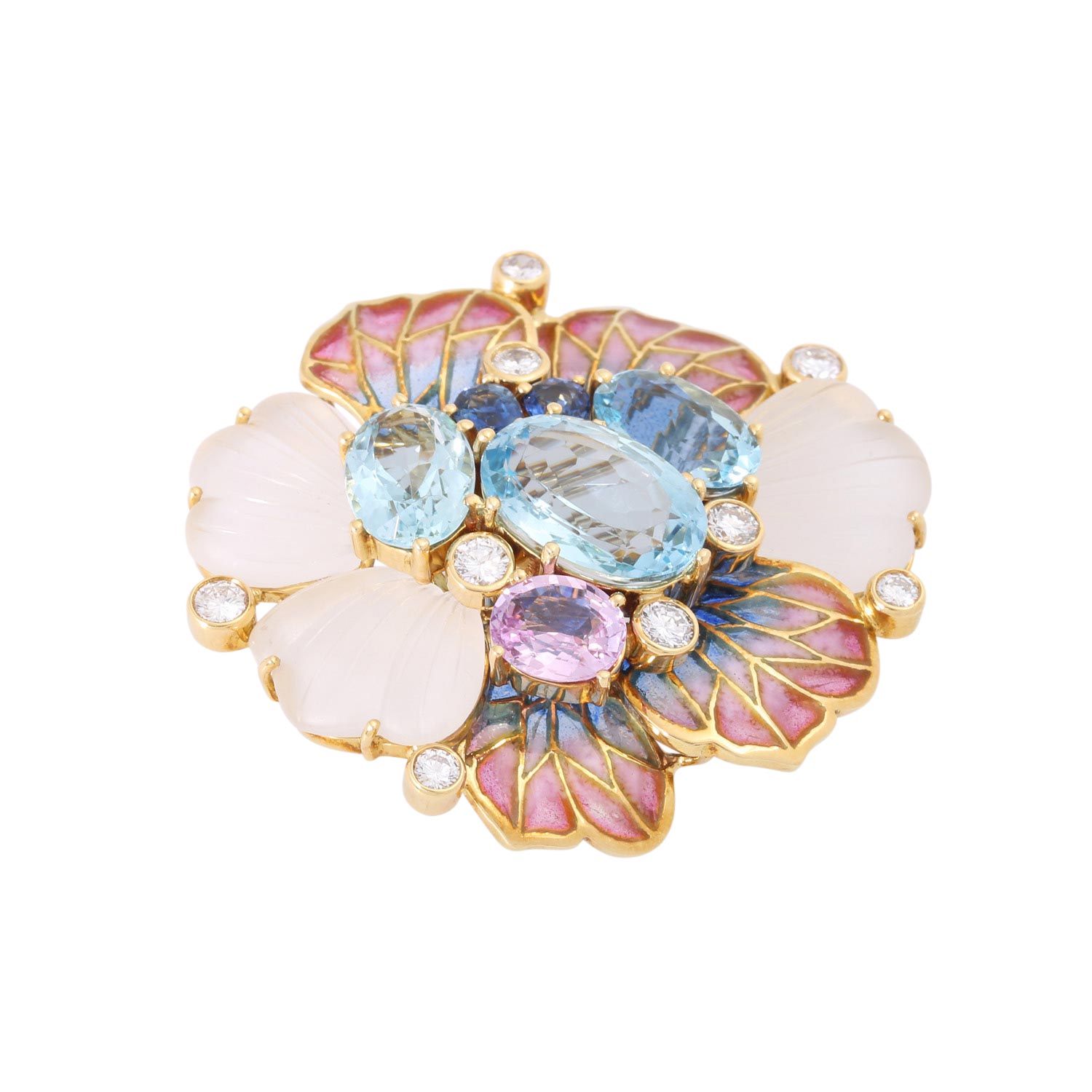 von zus. ca. 1,2 ct, ca. FW-WEISS (G-H)/SI, 1 Stein mit kl. Ausbruch, GG 18K, 32 g, 5x4,5 cm, fantasievolle Gestaltung mit 3 oval fac. Aquamarinen zus. ca. 10 ct, 2 blaue Saphirtropfen und 1 oval fac. rosa Korund, Farbsteine z.T. etwas berieben, Blütenblätter aus graviertem und mattiertem Bergkristall und rosa-blauem Fensteremail, 2. H. 20. Jh., insgesamt guter Erhalt, sorgfältige Handarbeit, Unikat.