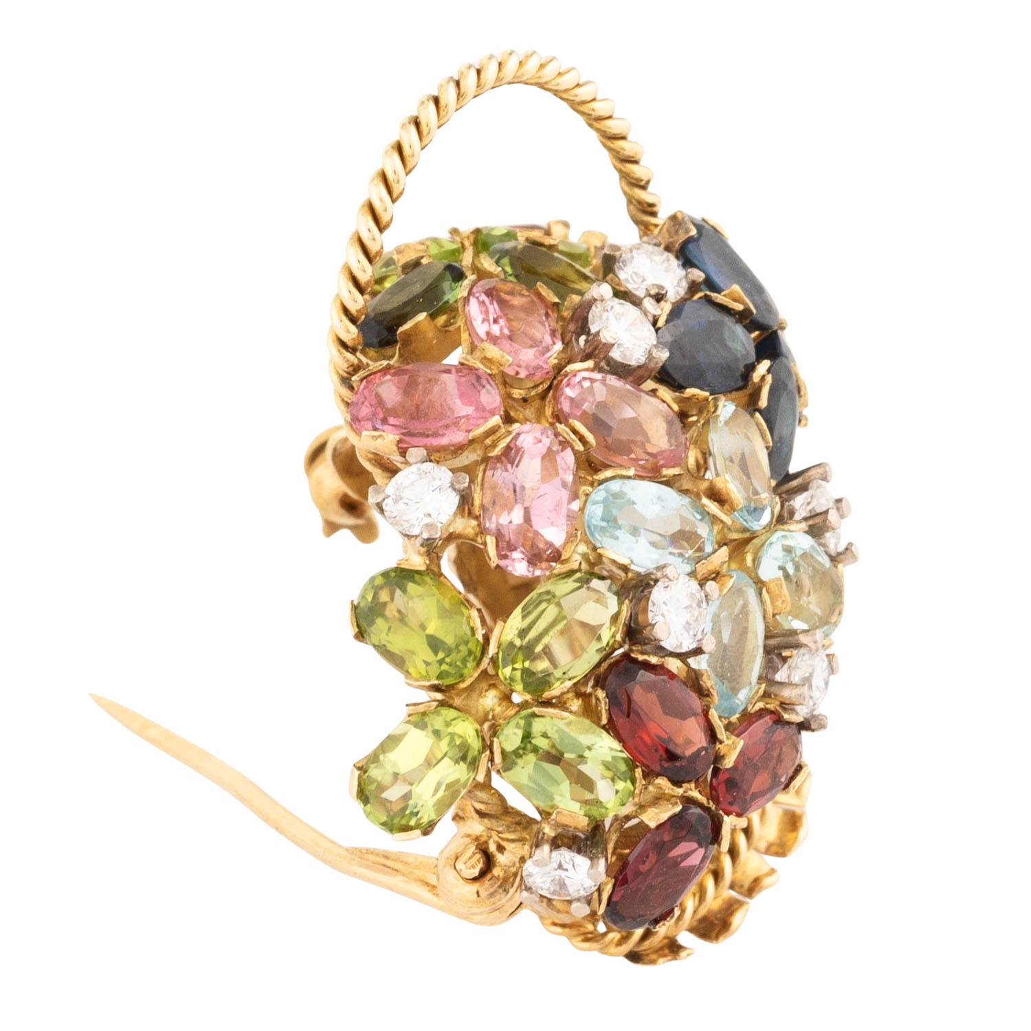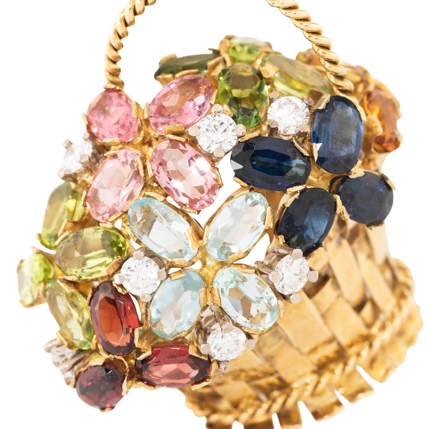 zus. ca. 0,70 ct, FW (G)/IF-VS, Blumen aus verschiedenfarbigen Edelsteinen: Peridot, Saphir, Citrin, Aquamarin, Granat und Turmalinen, GG 18K, 13 g, L x B 33,4 x 31 mm, 21. Jh., neuwertig. Handarbeit.