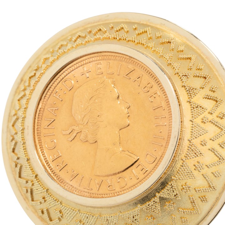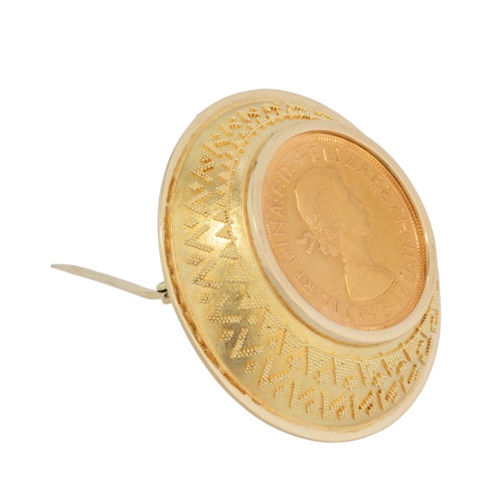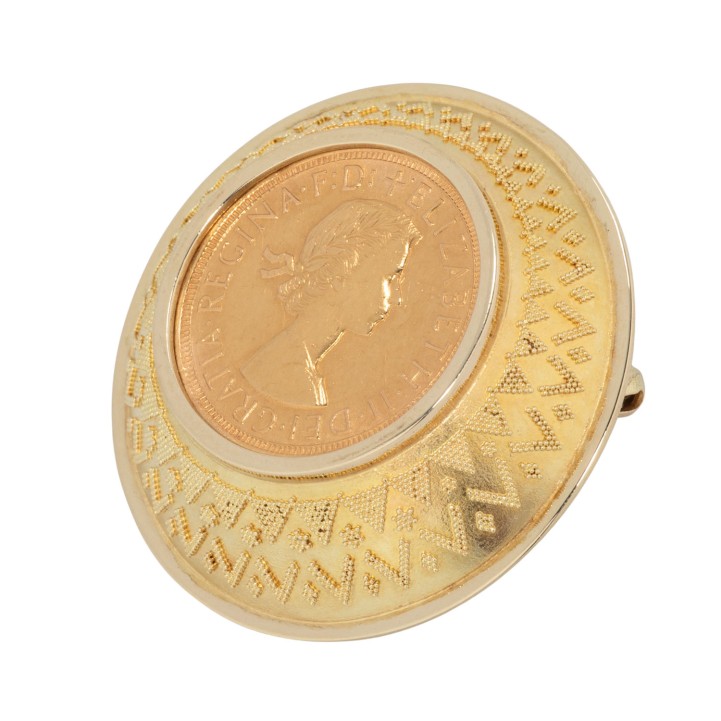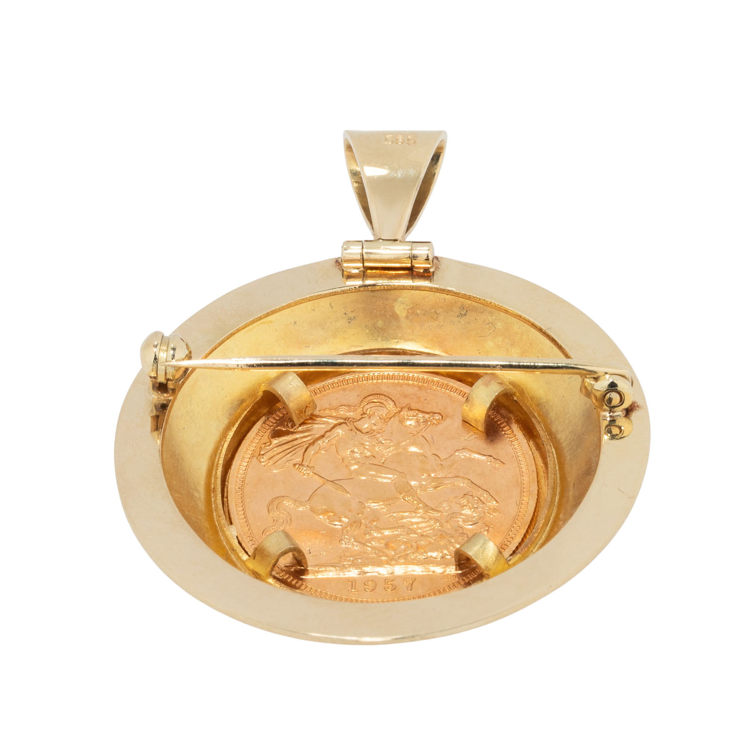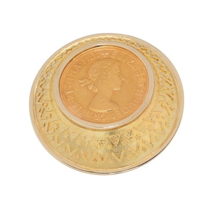 Anhänger/Brosche mit 1 Sovereign Elisabeth II 1957 Goldmünze,