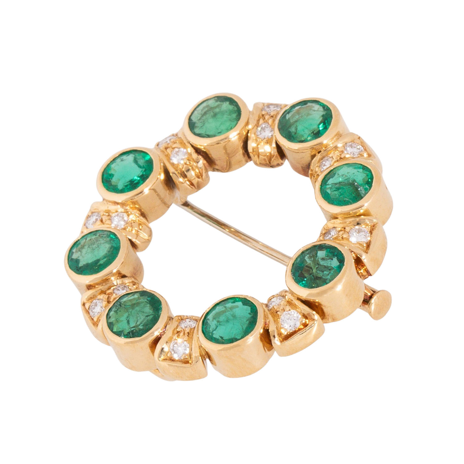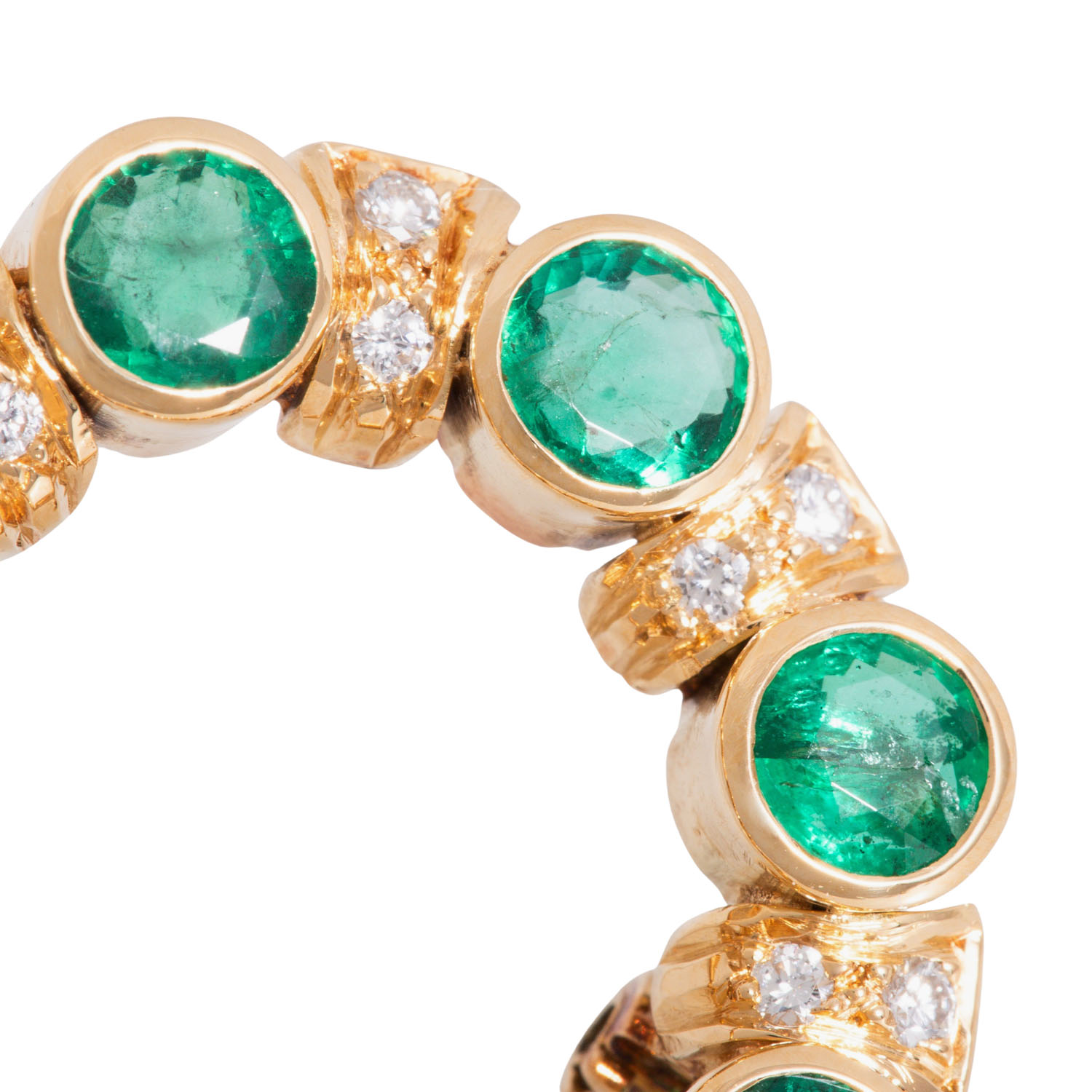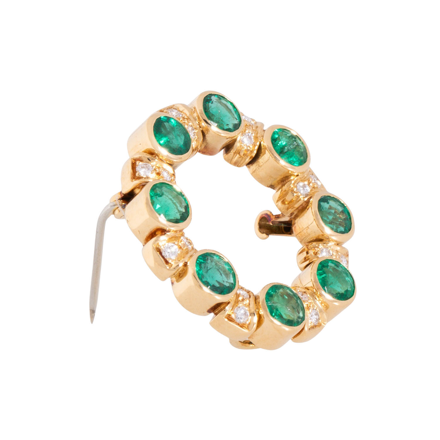 zus. ca. 0,26 ct, FW (F-G)/VVS, Smaragde im fac. Rundschliff zus. ca. 3,44 ct, GG 18K, 8,2 g, D: ca. 26,3 mm, Ende 20. Jh., minimale Tragespuren, Goldschmiedearbeit.