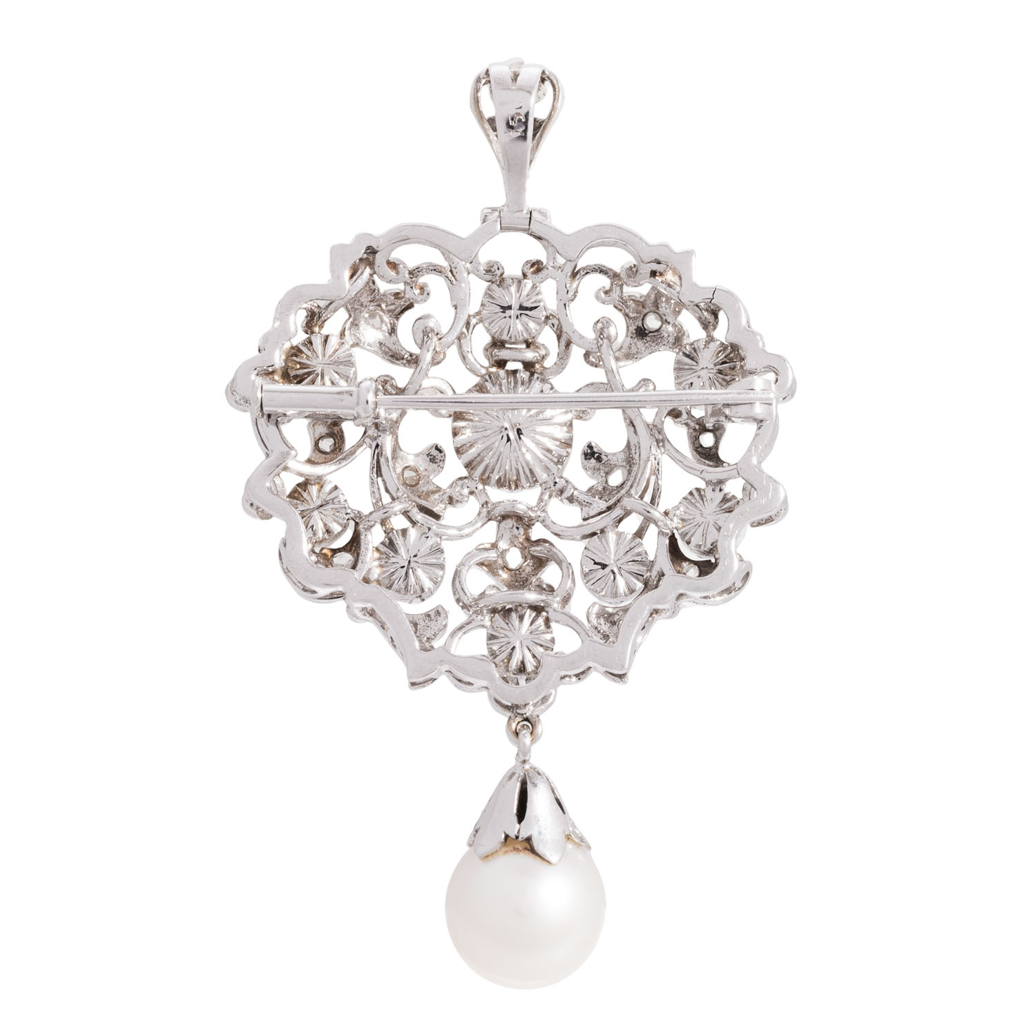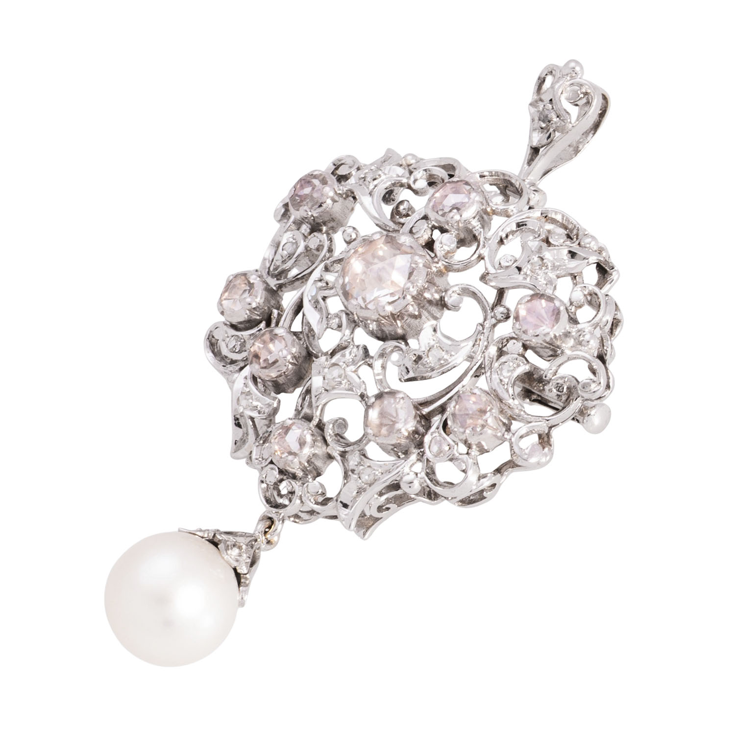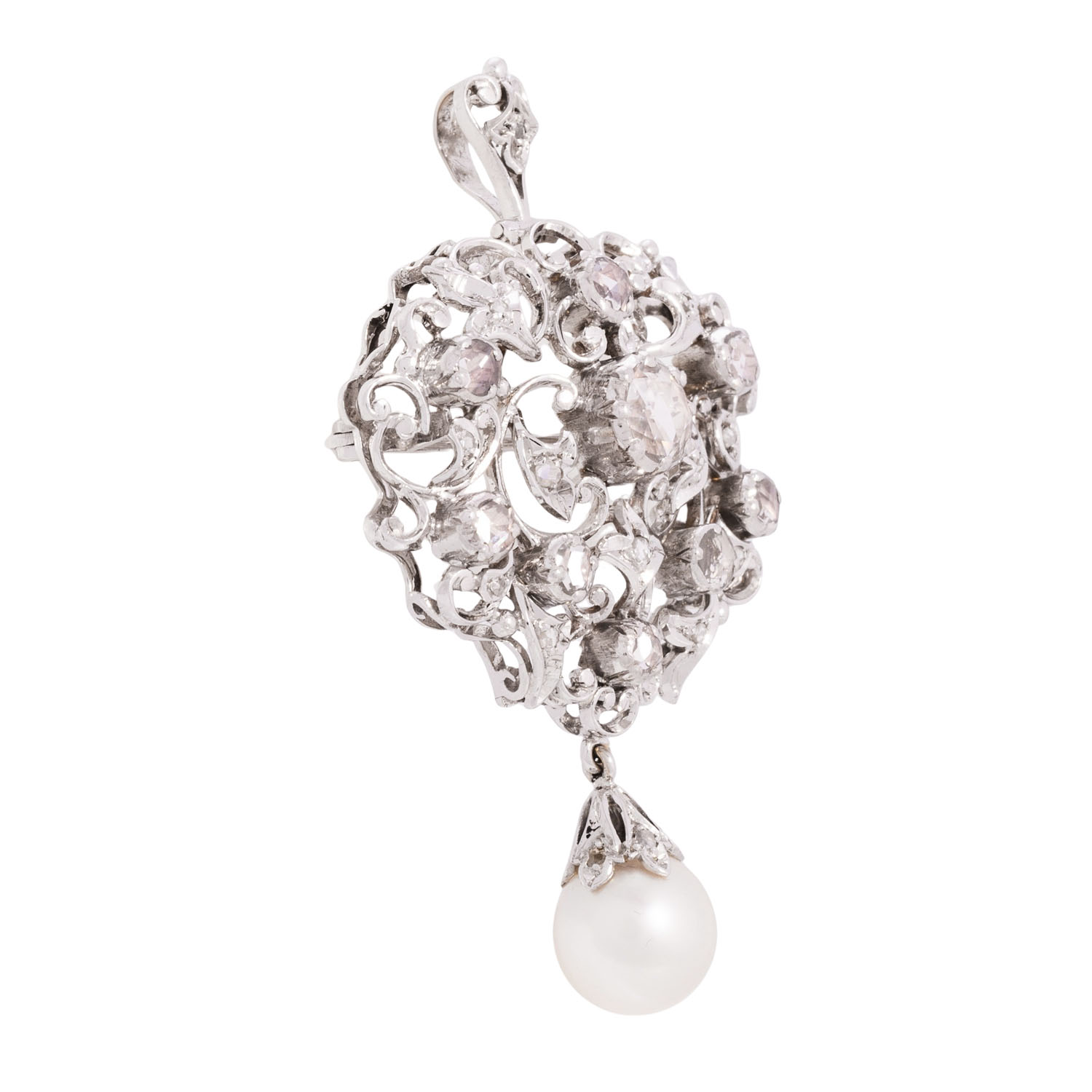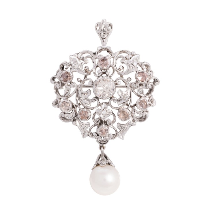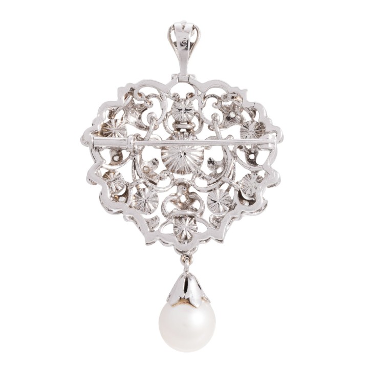 FANCY LIGHT BROWN/SI2-P1 und abhängend 1 Zuchtperle 9,7 mm, WG 18K, 14,8 g, 5x3 cm, floral in barocker Manier, 2. H. 20. Jh., sehr guter Erhalt.