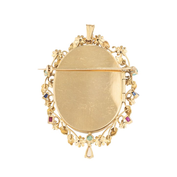floral gearbeiteter Rahmen mit diversen Edelsteinen und Zuchtperlen, GG ca. 18K, 27,3 g, wohl Umarbeitung oder Mariage aus Medaillon, da mit Scharnierbewegung, 20. Jh., Tragespuren, Steine tlw. bestoßen, 1 Perle ersetzt, hübsche Handarbeit.