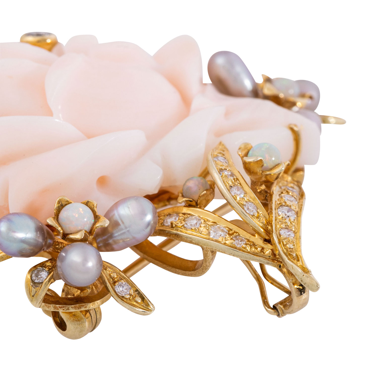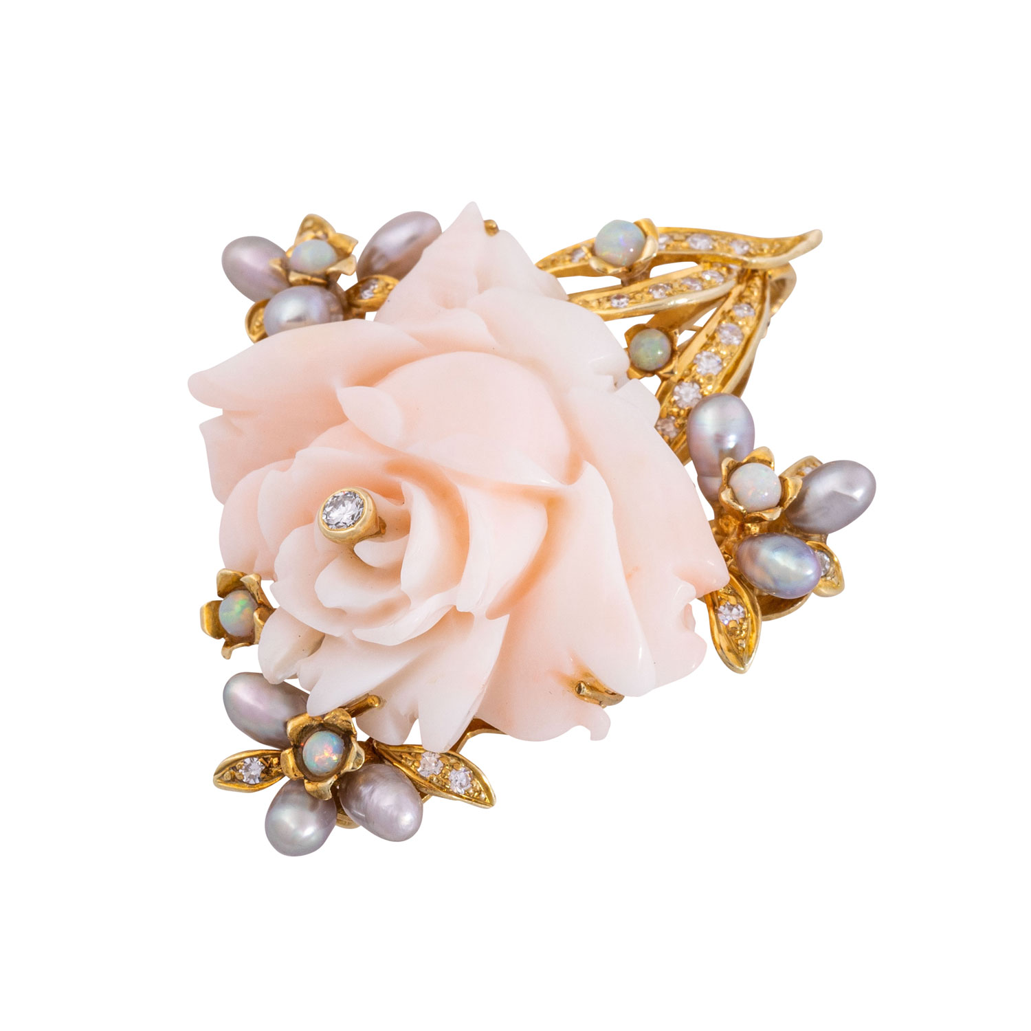 Brillant, ca. 0,06 ct gute Farbe und Reinheit, 23 Achtkantdiam, ges. ca. 0,15 ct, 6 runde Opalcabochons, 2,5 mm, 9 graue Süßwassserperlen, guter Lüster, GG 14K, 21,0 g, L x B: 51 x 43 mm, 2. Hälfte 20. Jh., minimale Tragespuren.