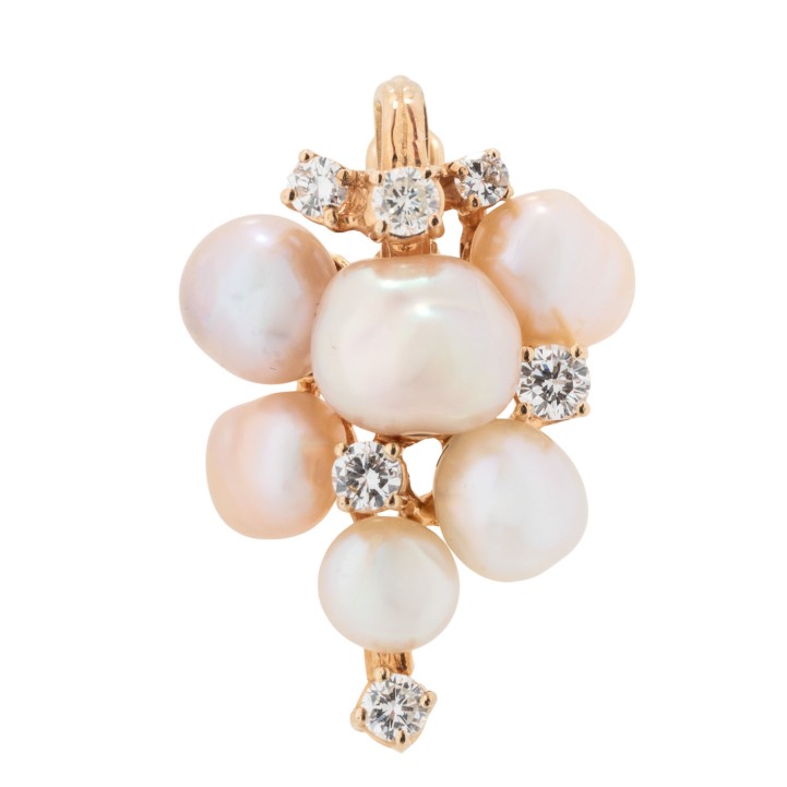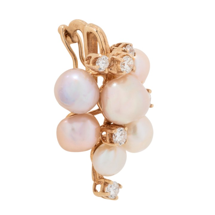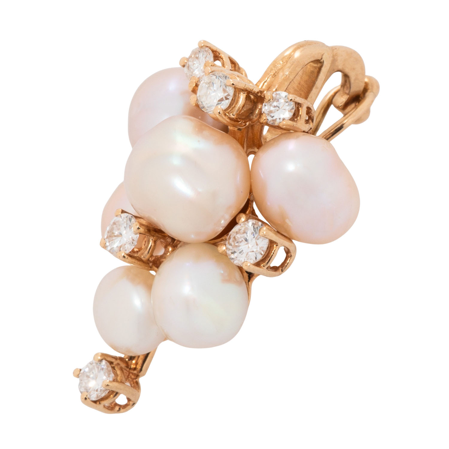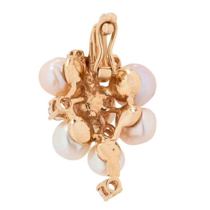 6 Süßwasserperlen, verschiedene Farben und Formen von ca. 5 x 5 bis 8 x 6 mm, 6 Brillanten, ges. ca. 0,25 ct, GG 14K, 3,7 g, L x B: 25 x 16 mm, 2. Hälfte 20. Jh., minimale Tragespuren.