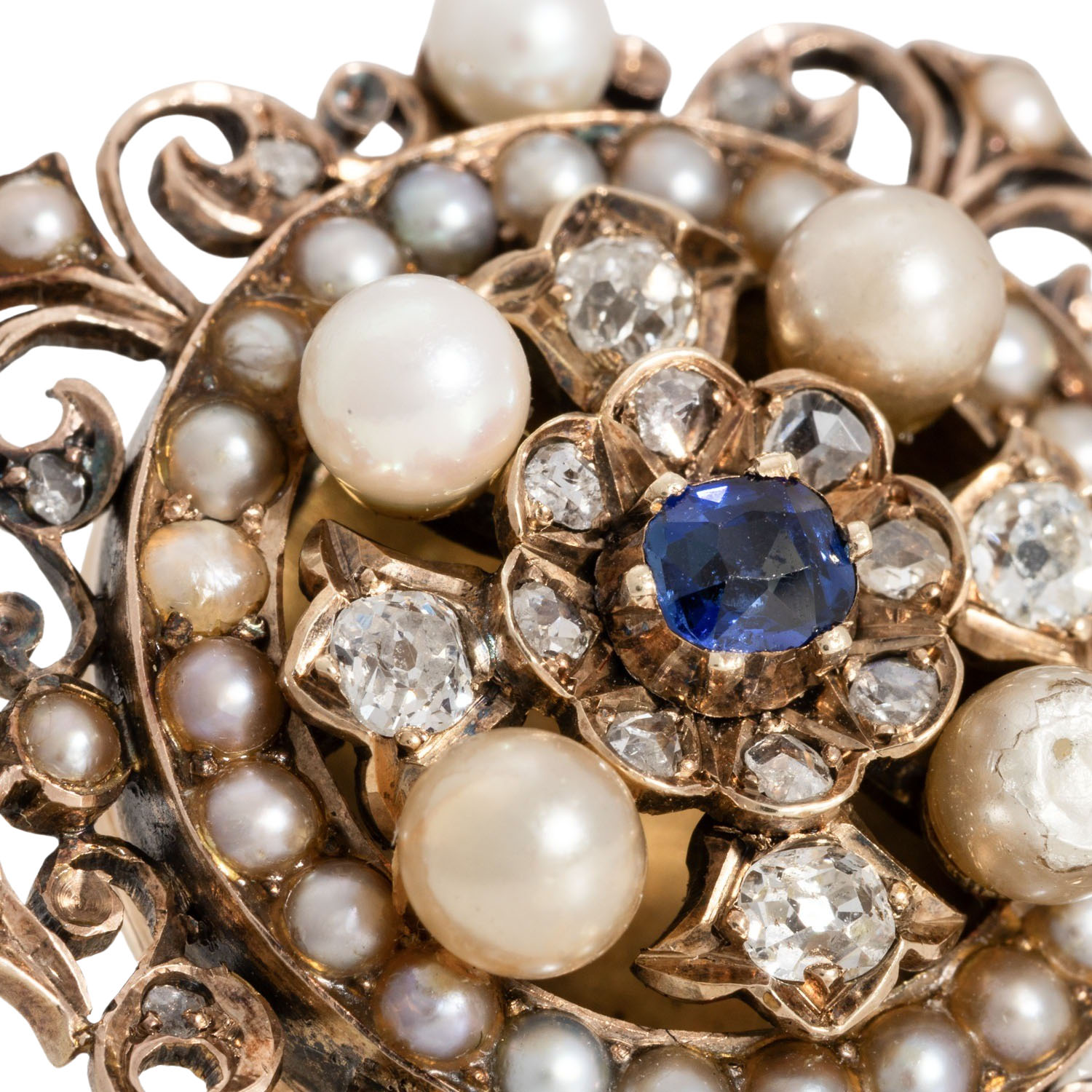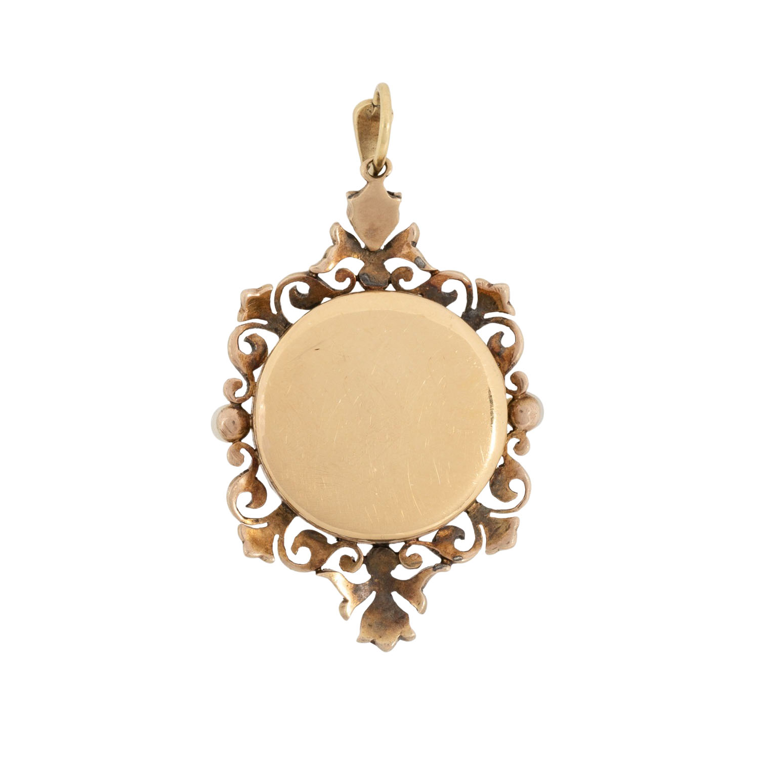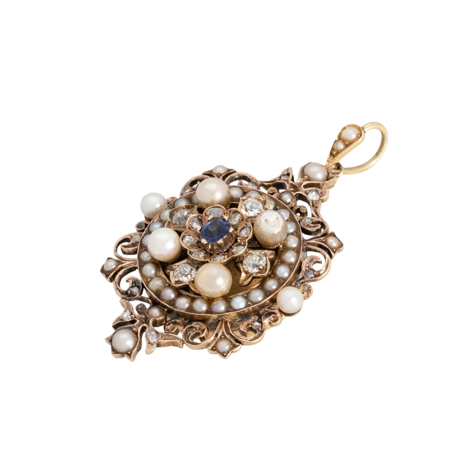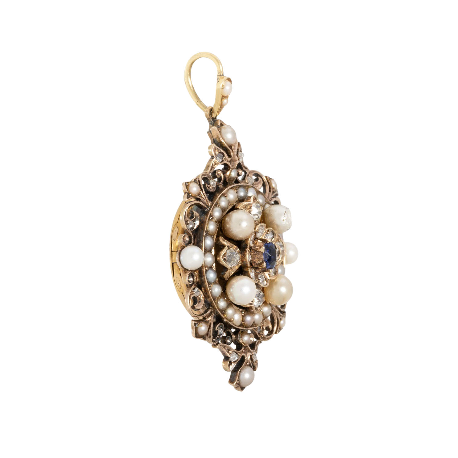 davon 4 Altschliffdiamanten und 20 Rosenschliffe, zus. ca. 0,52 ct, LGW-GW (I-M)/SI-P, Saphir im Kissenschliff, ca. 0,40 ct, Zuchtperlen wohl nachträglich ausgetauscht, 1 Mallorcaperle besch., GG 14K, 14,7 g, L: ca. 48 mm, B: ca. 28 mm, Öse D: ca. 4,9 mm, 1. H. 20. Jh., altersgemäß guter Zustand, Rückseite mit Lotspuren, Medaillon lässt sich nicht öffnen, Öse nachträglich angebracht.