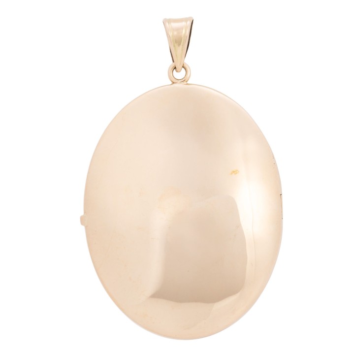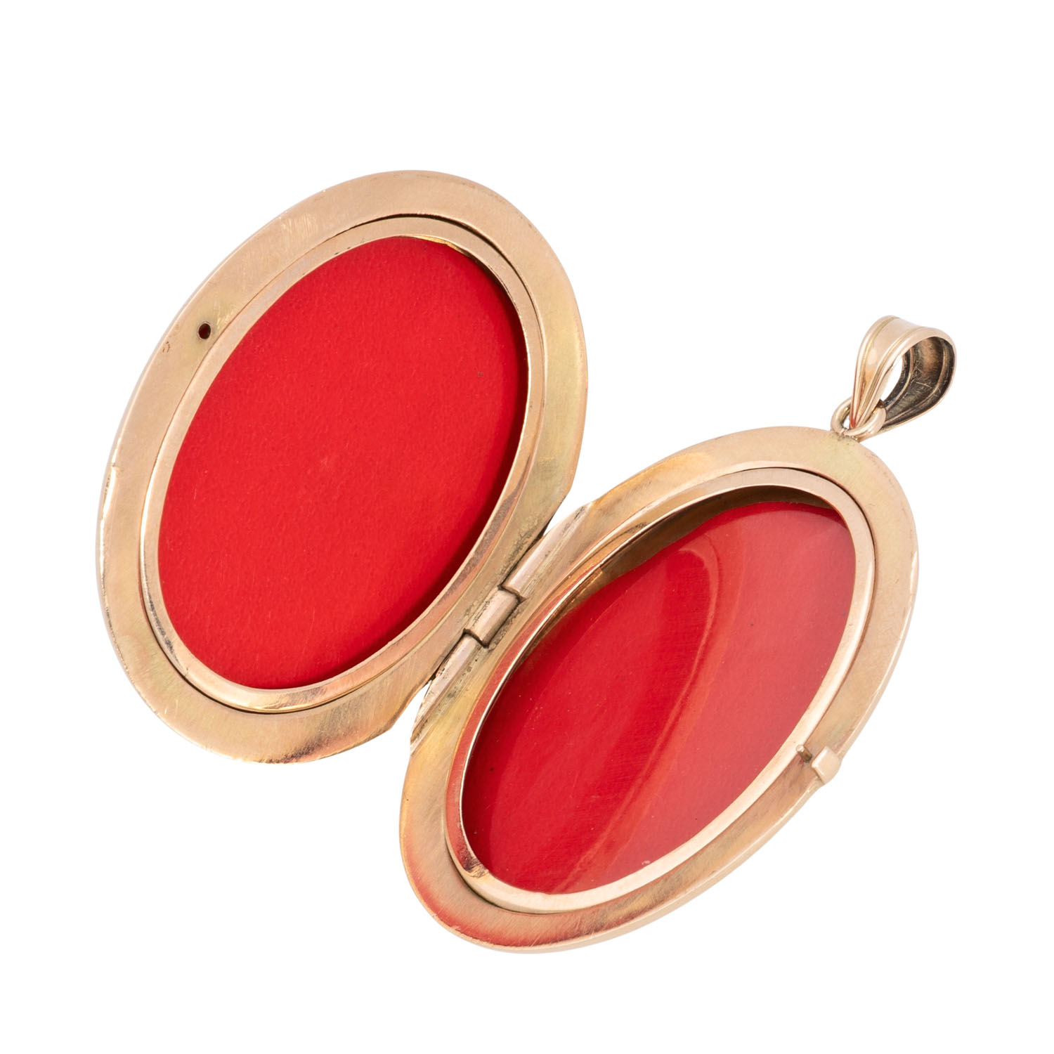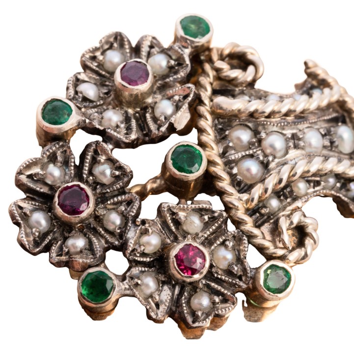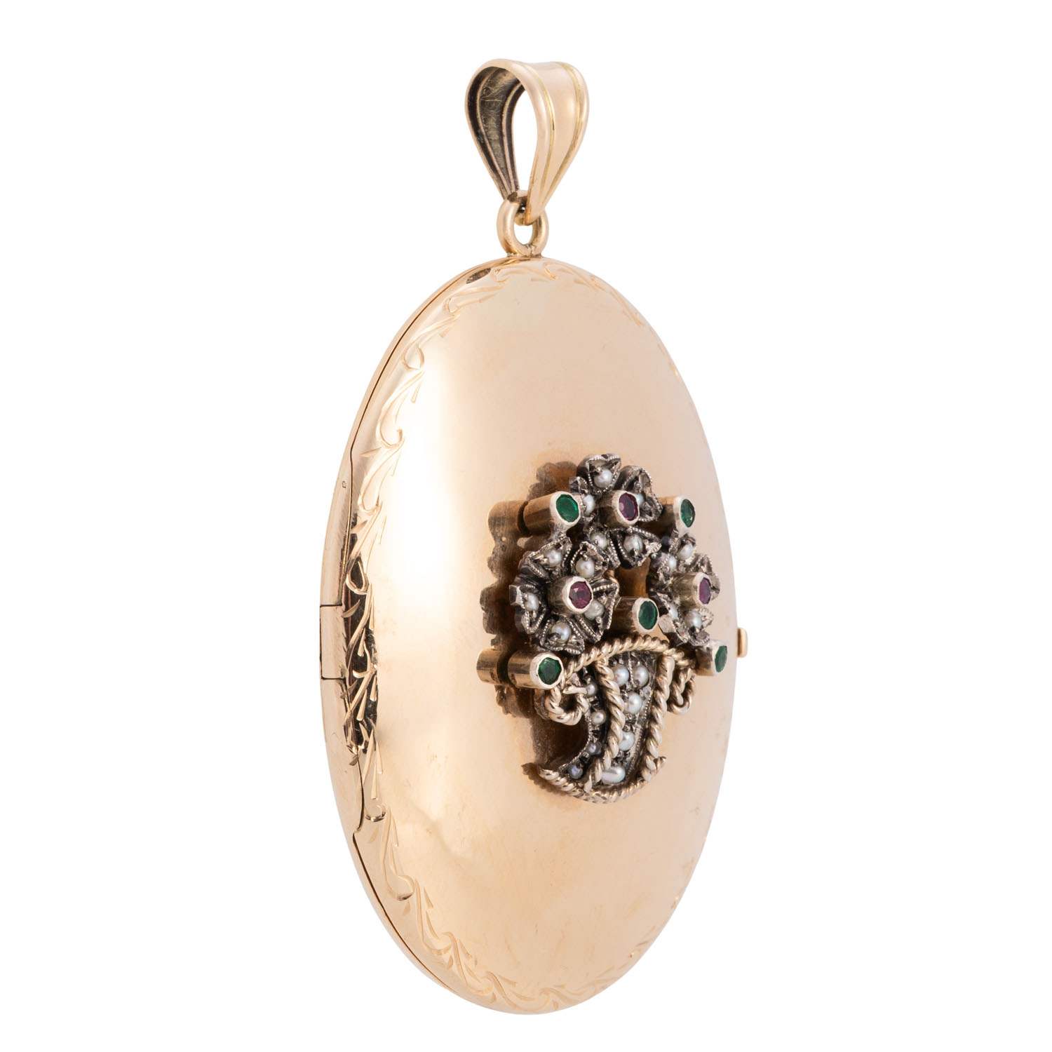 bestzt mit 3 Rubinen im fac. Rundschliff zus. ca, 0,10 ct, 5 Smaragden im fac. Rundschliff zus. ca. 0,13 ct, und 28 Saatperlen, Rand verziert mit feiner Gravur, GG 14K/Silber, 22,3 g, L: ca. 63 mm, B: ca. 40 mm, Öse D: ca. 6 mm, 2 Bildeinlagerahmen, um 1970/80, leichte Tragespuren, mit Herstellerpunze 'rAH',