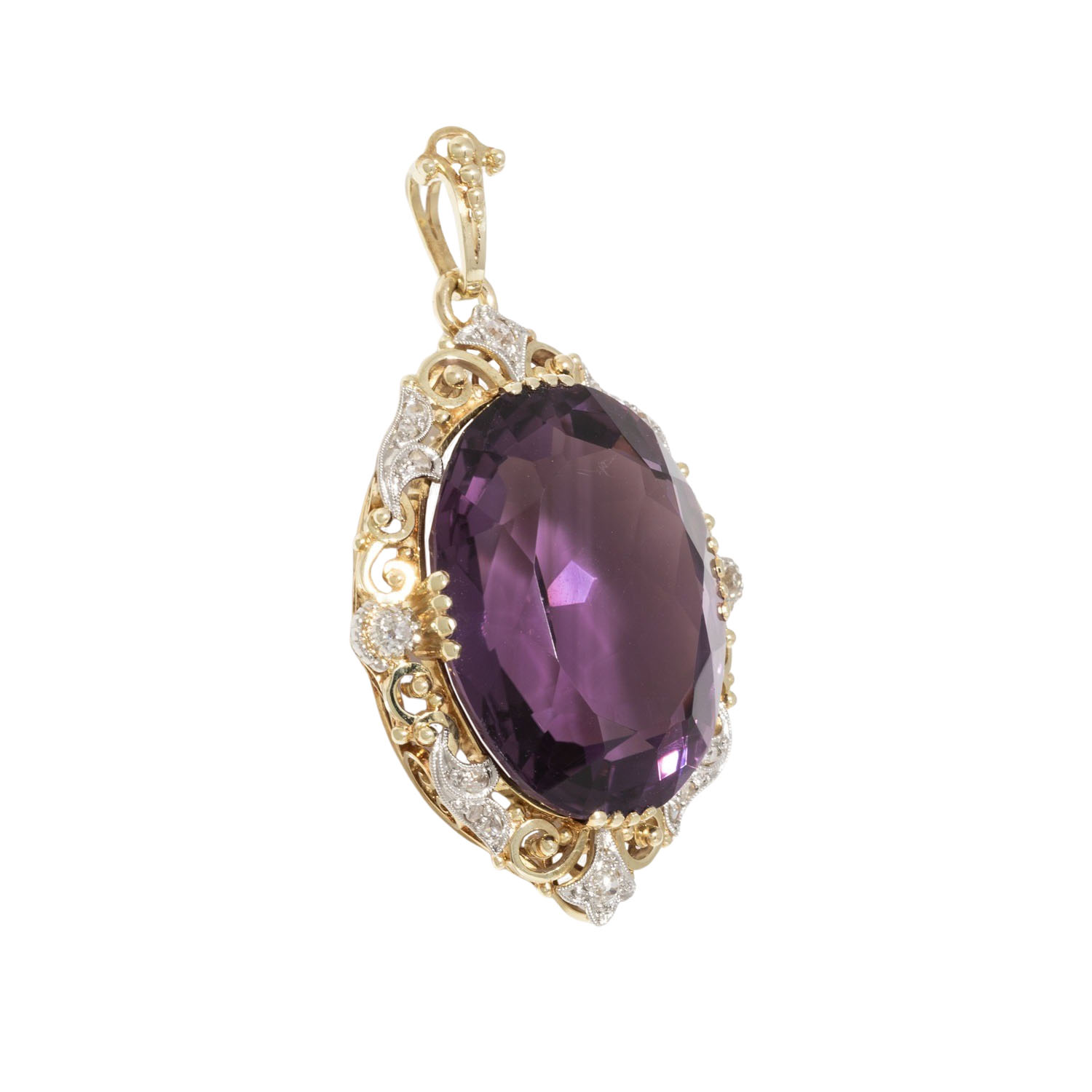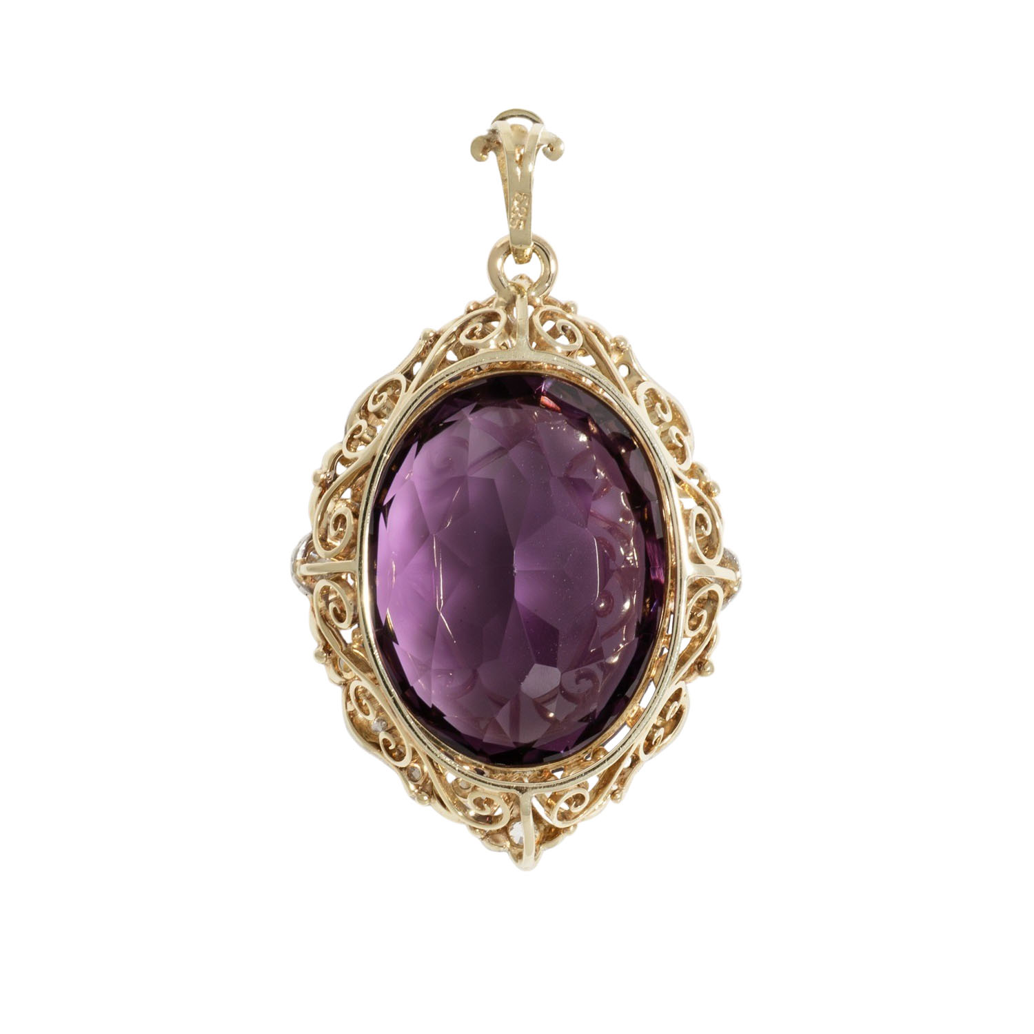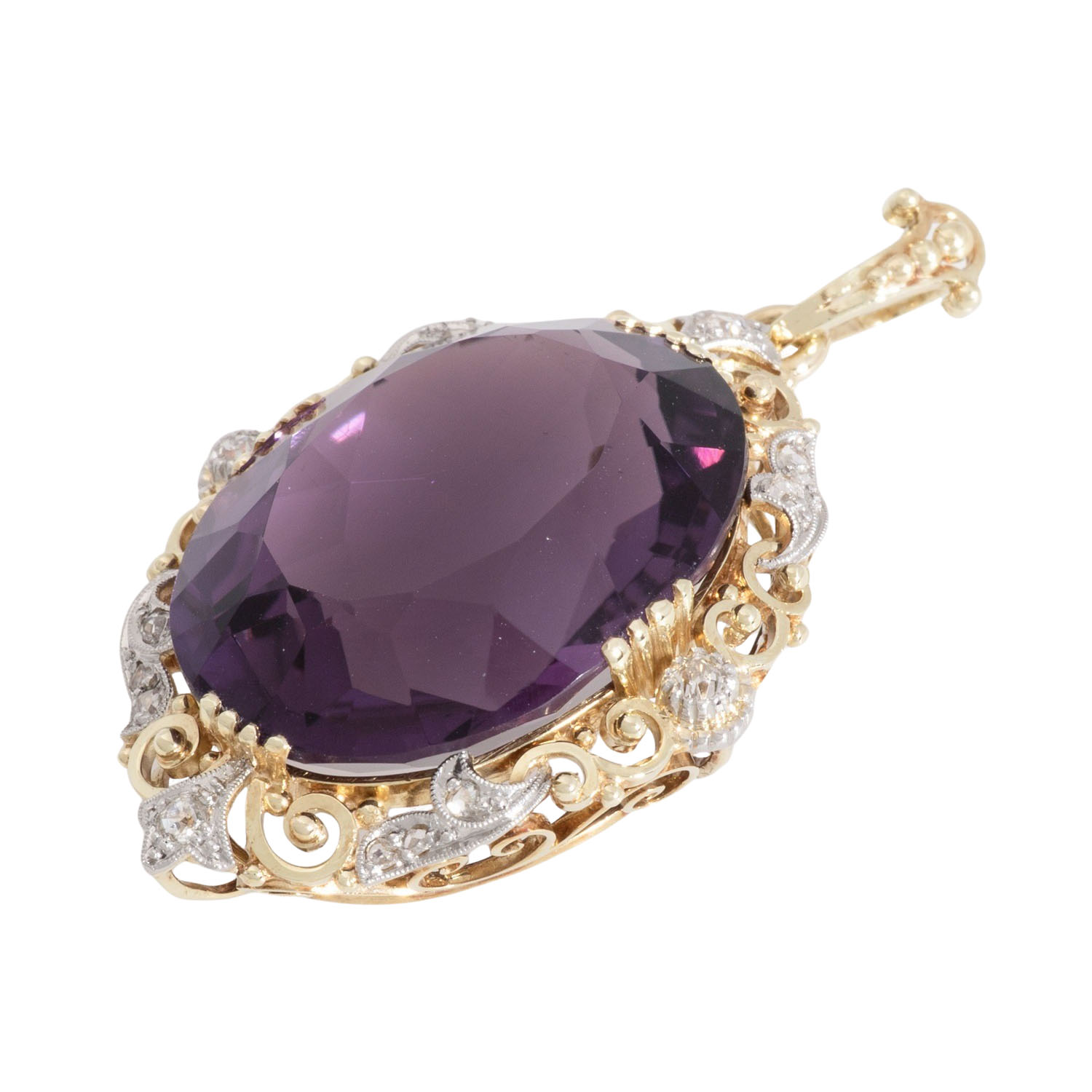 oval facettierter Amethyst, ca. 24 x 18,5 x 12,8 mm, ca. 30 ct, 4 Altschliffdiamanten von zus. ca. 0,2 ct und Diamantrosen, mittlere Farbe und Reinheit, GG 14K, 13,1 g, L.: ca. 36 mm, 2. H. 20. Jh., guter Zustand.