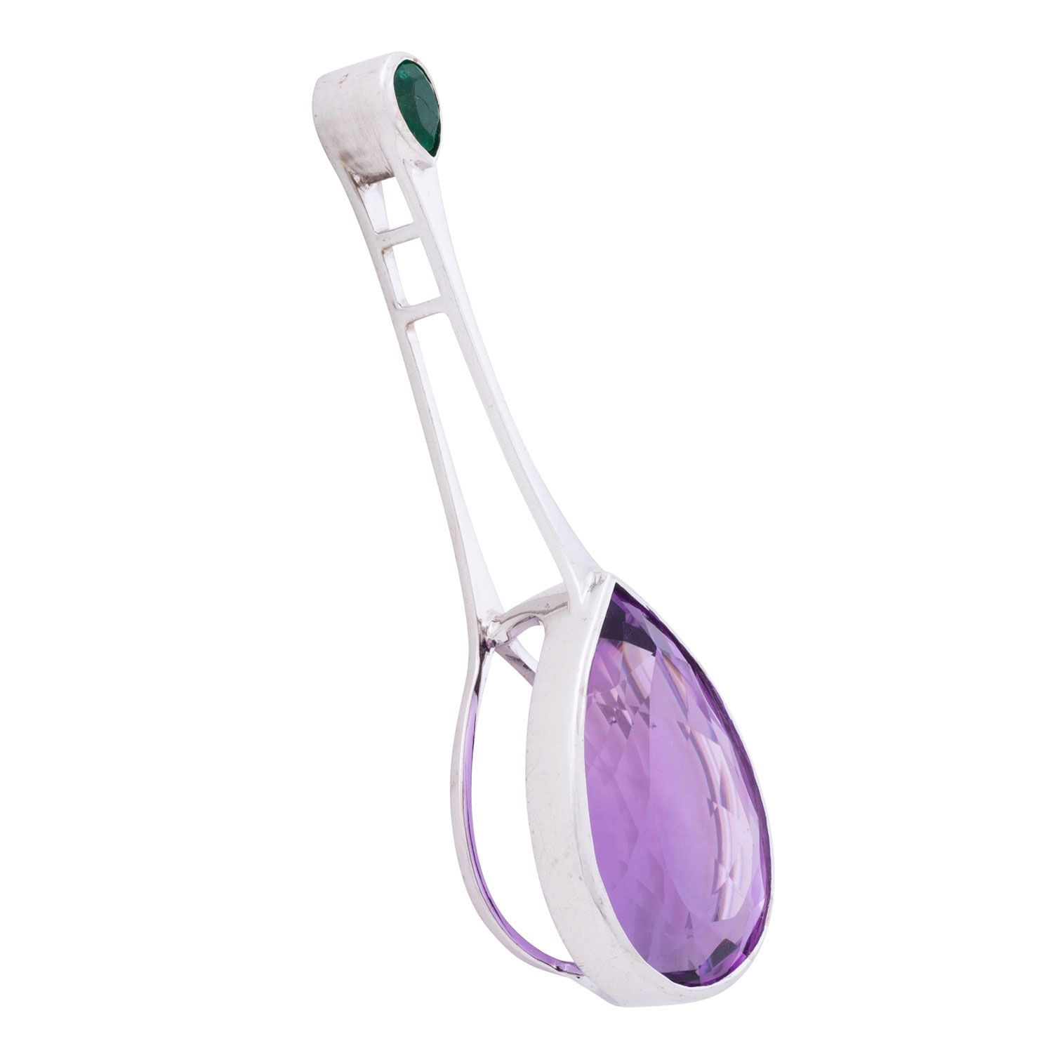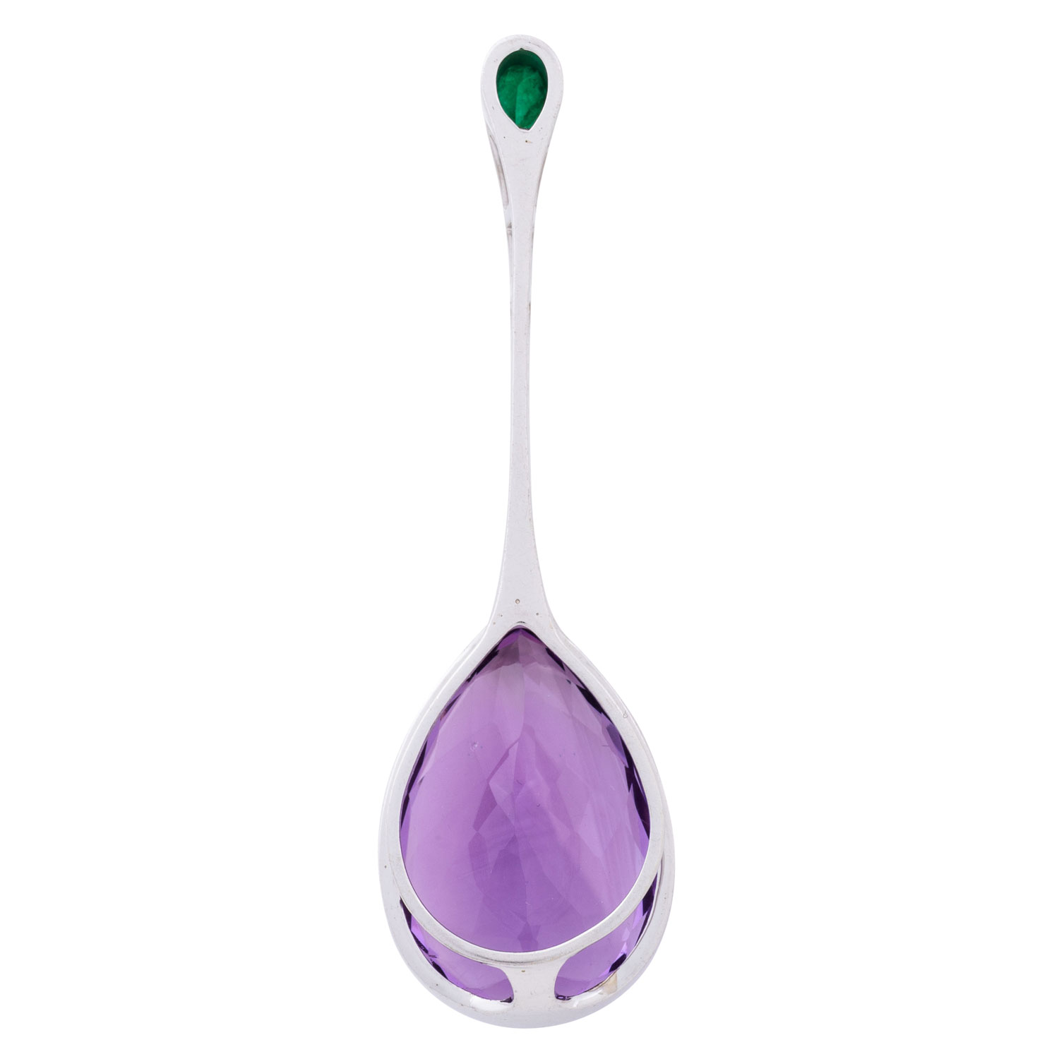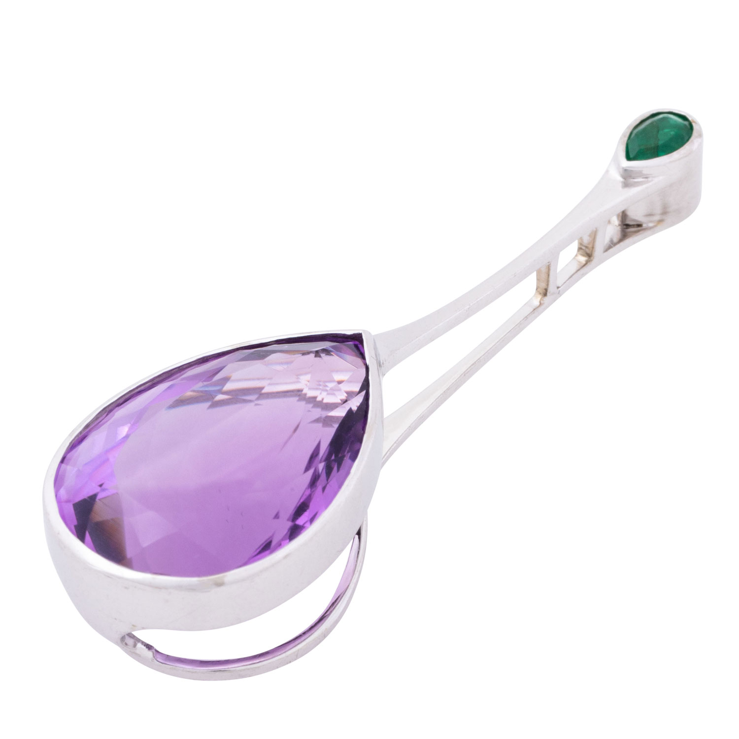 Amethyst ca. 26 ct, rücks. min. bestoßen, Smaragd rissig, Pendelform aus WG 14K, 12,4 g, 6x1,8 cm, Ende 20. Jh., leichte Tragespuren, Handarbeit.