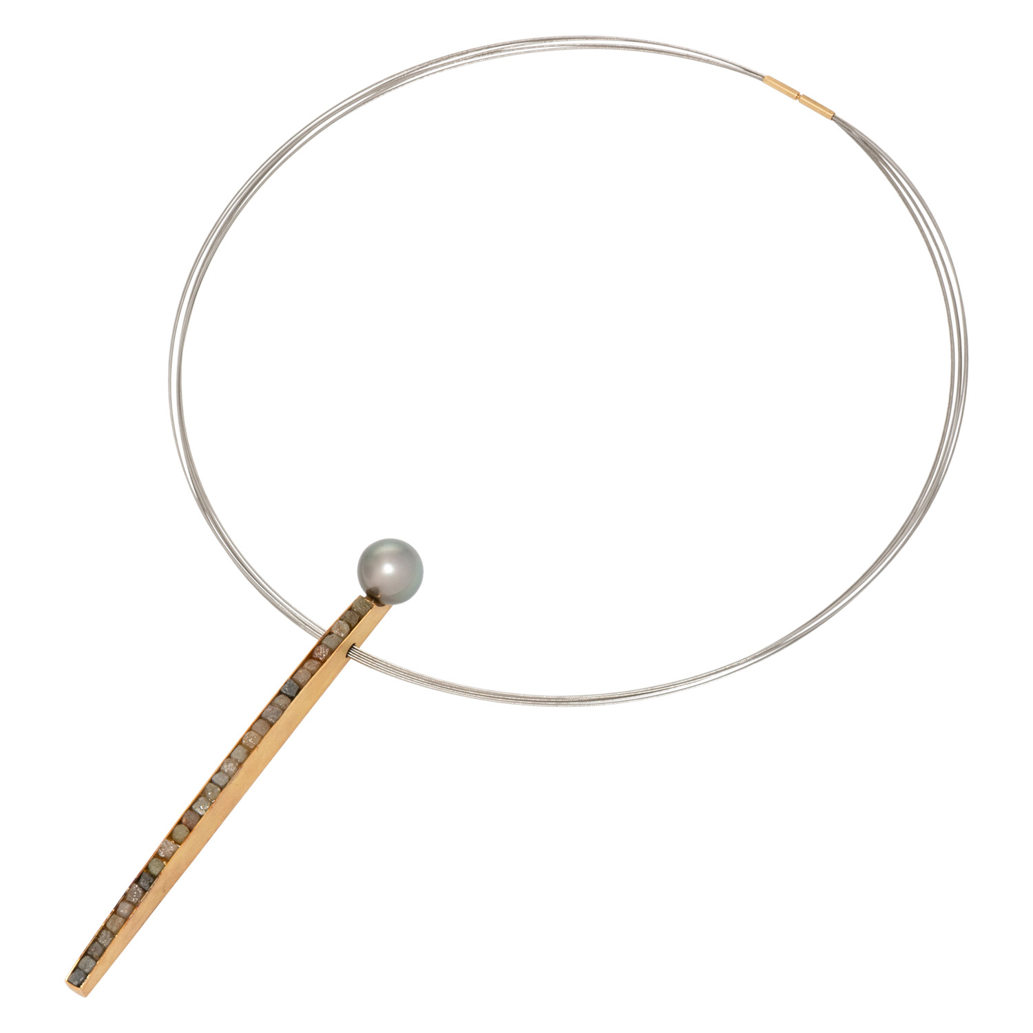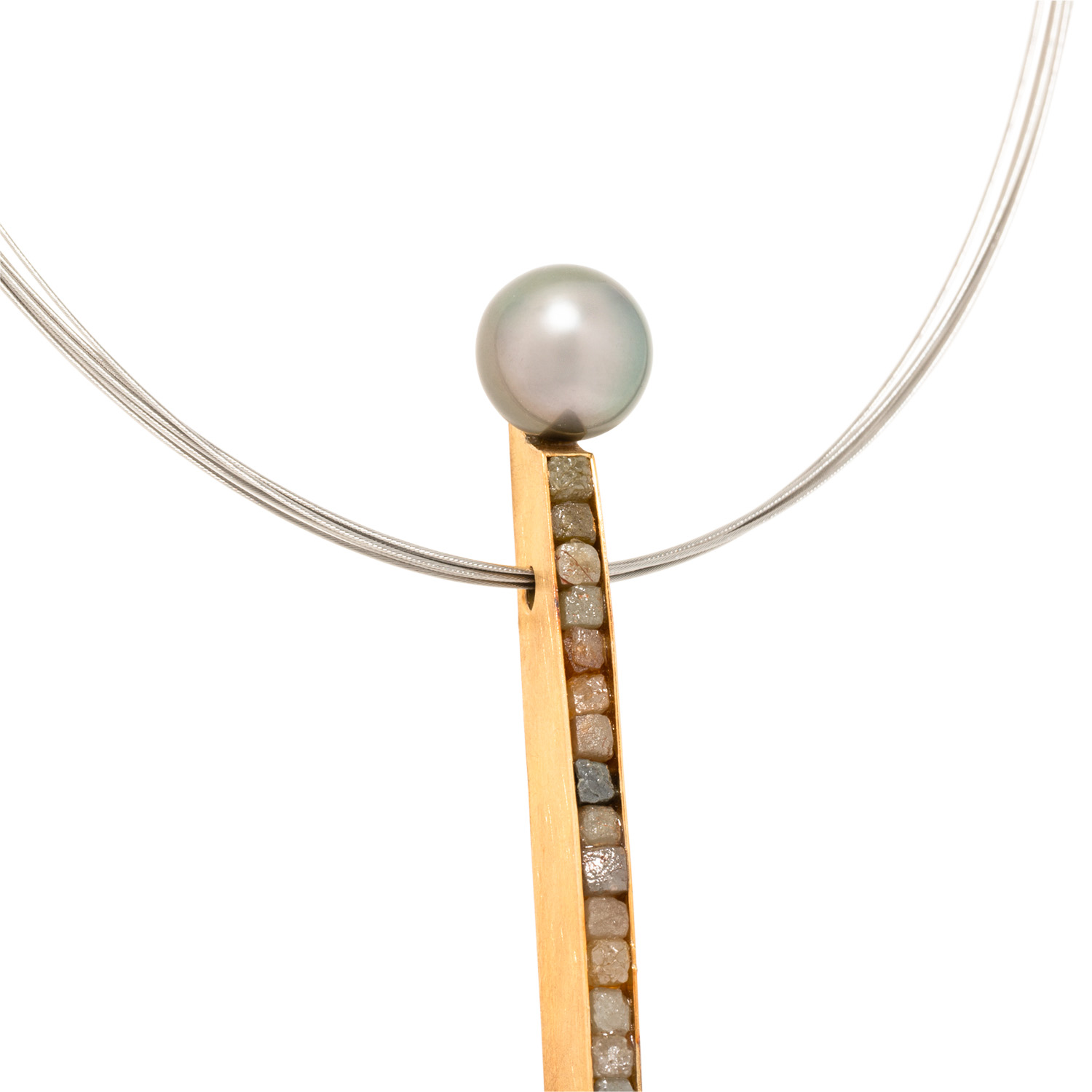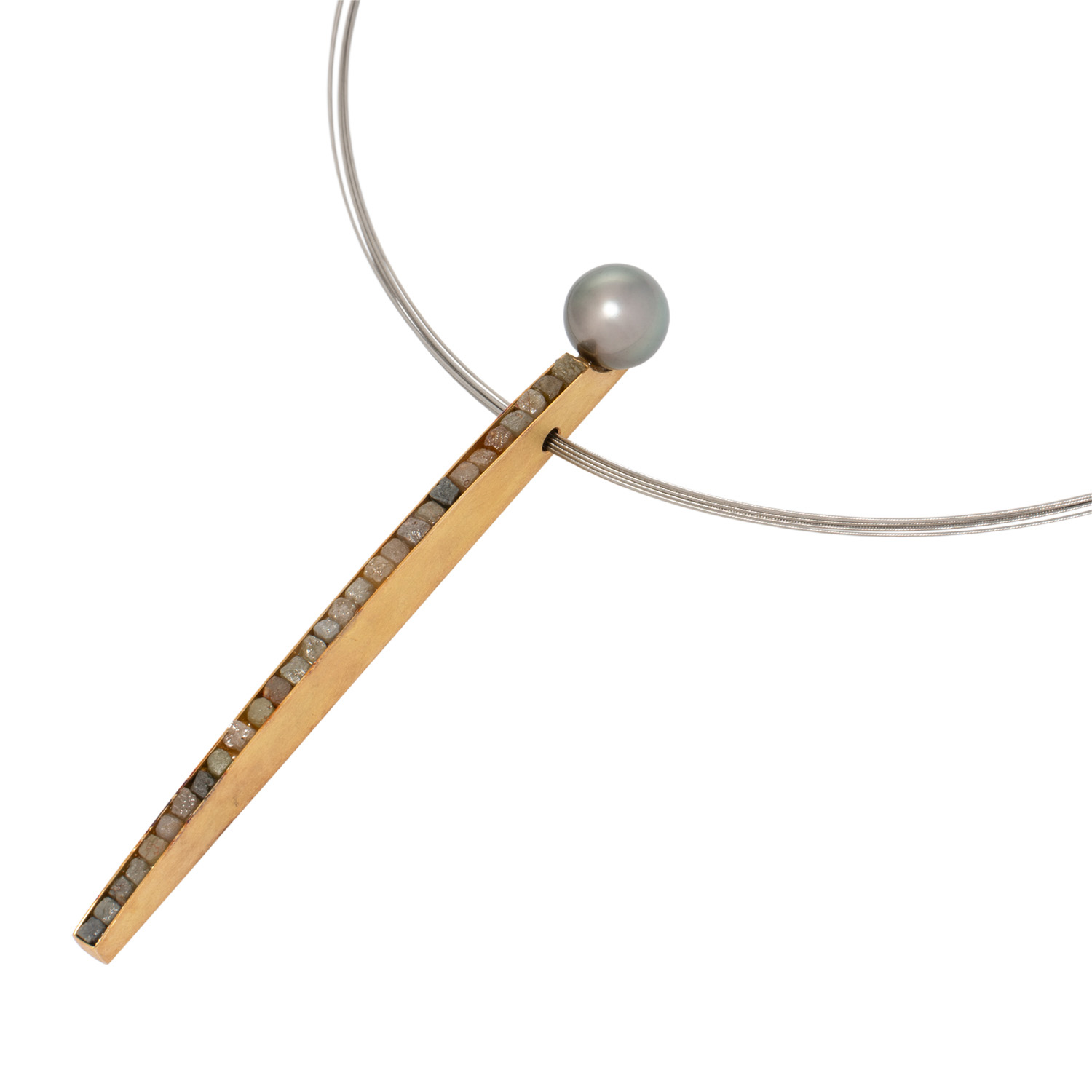 gefasst in 18K GG 21,7 gr. Besetzt mit Rohdiamanten, gemischte Farben von zus. ca. 10ct. Länge ca. 105 mm, an mehrreihigem Stahlcollier mit Bajonettverschluss, Länge ca. 52 cm. Bajonettverschluss in 18K GG. Handarbeit. Unbekannte Herstellerpunze.