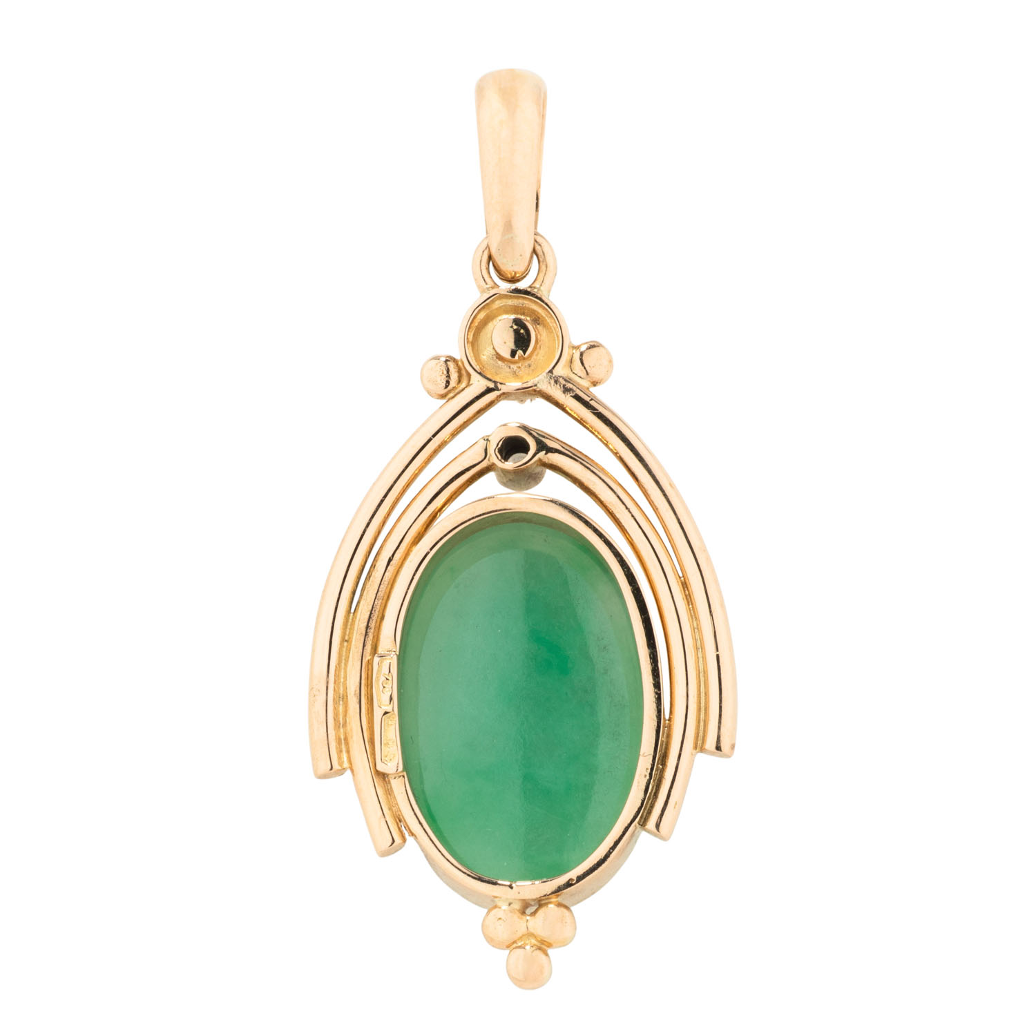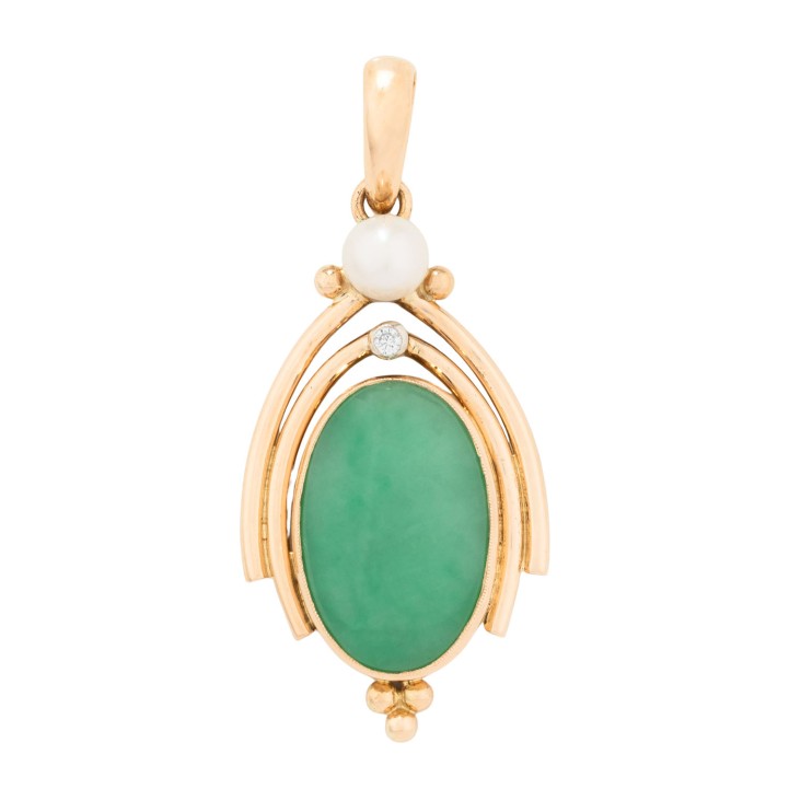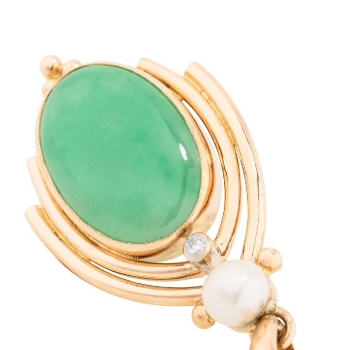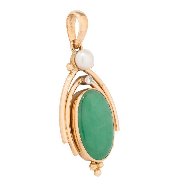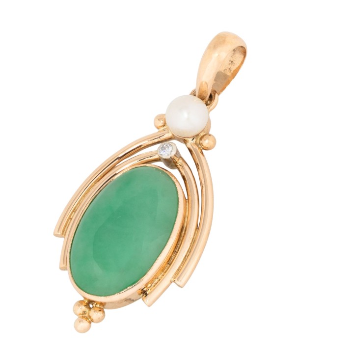 ca. 0,03 ct, WEISS (H)/SI, Jadecabochon ca. 20 x 12,5 mm, Süßwasserzuchtperle, weiß, D: ca. 5,9 mm, guter Lüster, RSG 18K, 9,7 g, L: ca. 47,5 mm, B: ca.3,6 - 21,4 mm, Öse D: ca. 5,4 mm, Mitte 20. Jh., leichte Tragespuren, mit italenischer Herstellerpunze.
