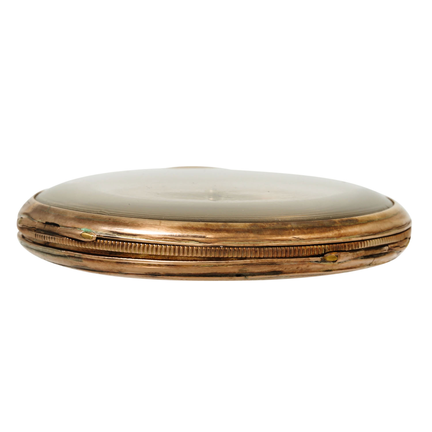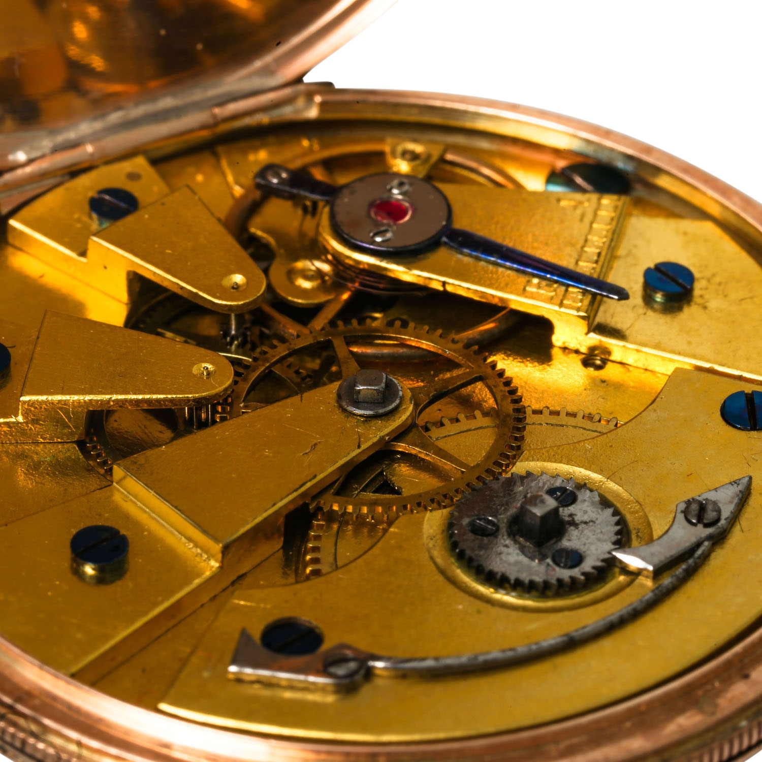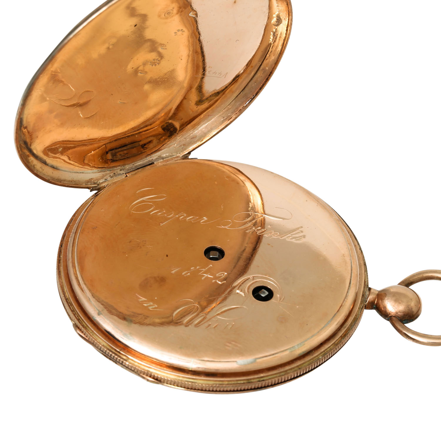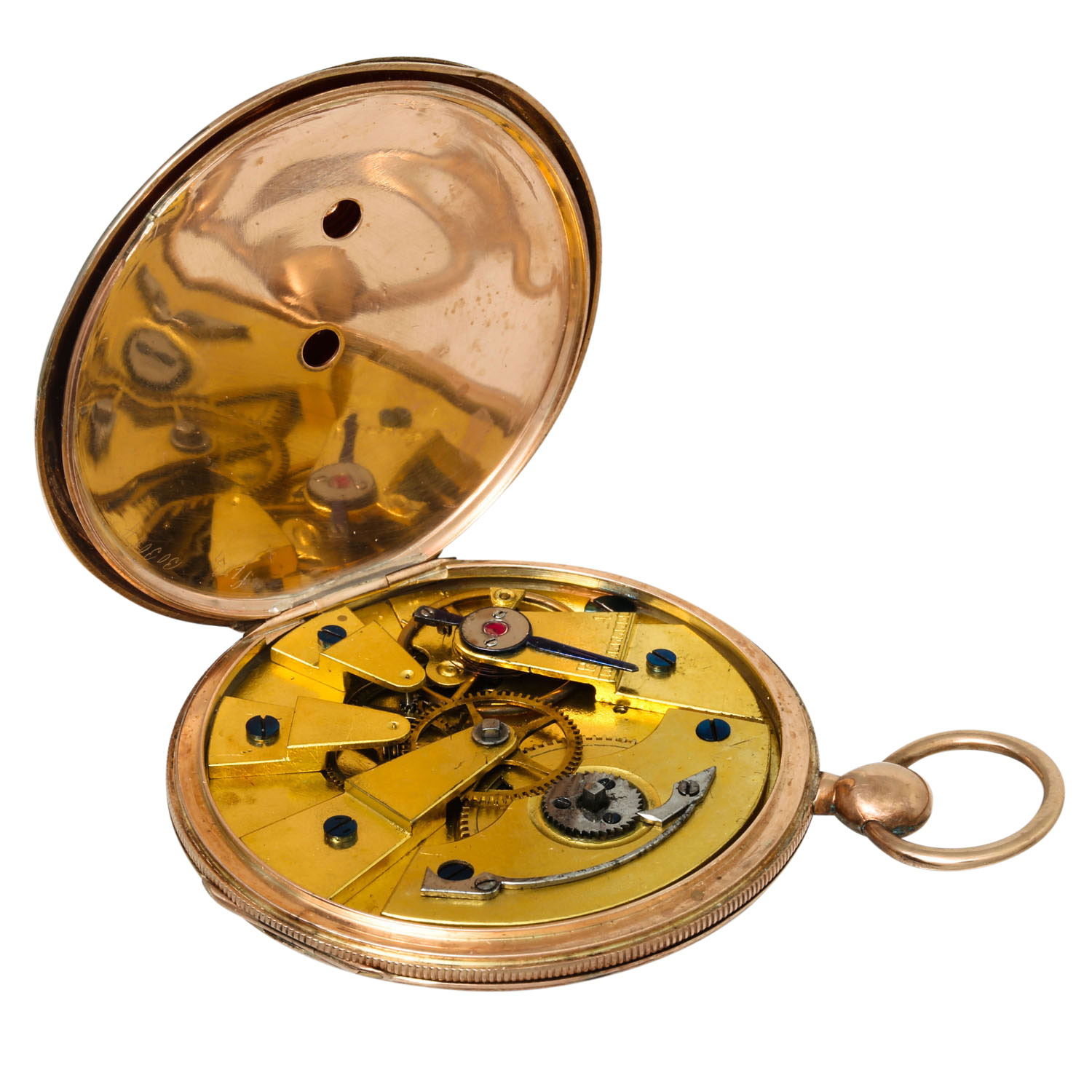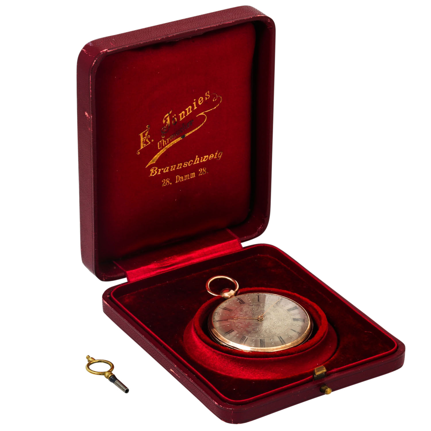 Gold 8K, inklusive Staubdeckel. Staubdeckel graviert mit 'Caspar Trinks 1842'. Brücken Uhrwerk mit Schlüsselaufzug und -zeigerverstellung, Wolfsverzahnung am Aufzugsrad, funktionsfähig. Zifferblatt aus 900er Silber mit römischen Ziffern. Breguet-Zeiger in Gold. Sichtbare Gebrauchsspuren am Gehäuse, leichte Rissbildung am Rand des Rückdeckels auf ca. 2cm. Passender Schlüssel anbei. 46,5 mm Durchmesser ohne Krone.