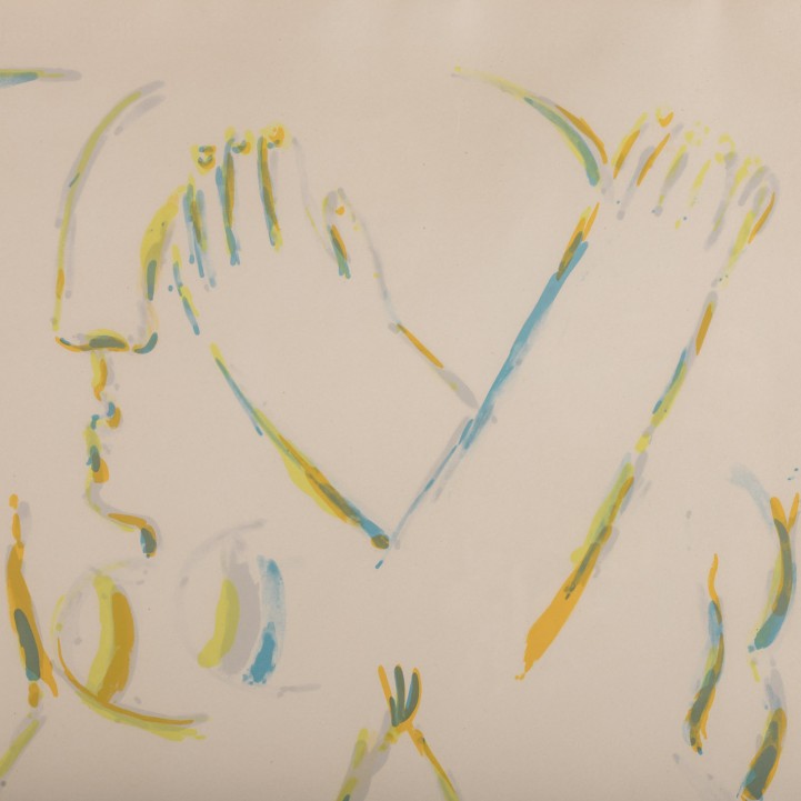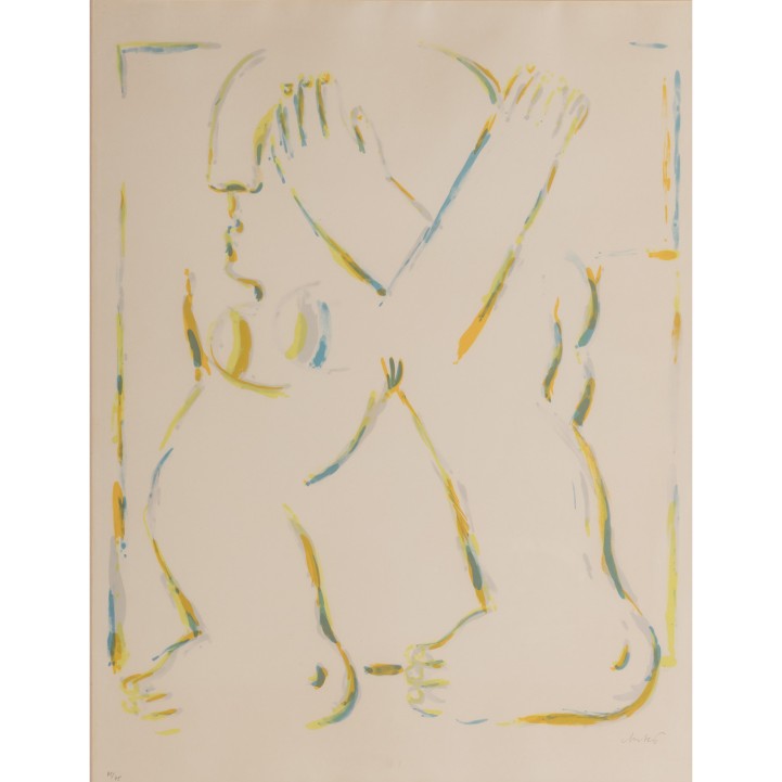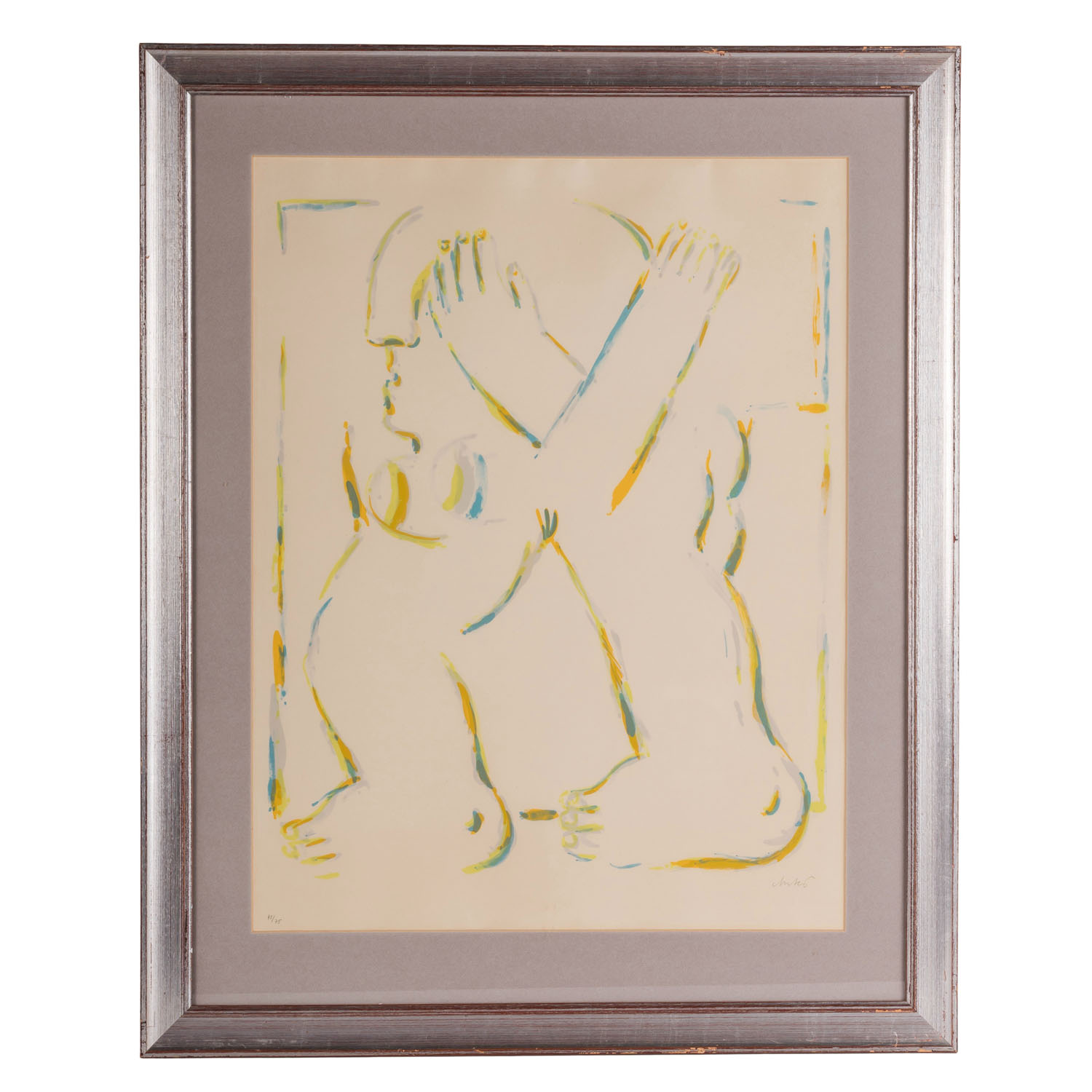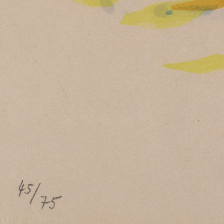 u.re. mit Bleistift von Hand signiert 'Antes', u.li. mit Bleistift von Hand nummeriert '45/75', Farblithographie/Papier, HxB: Platte ca. 56x46cm, Passepartout-Ausschnitt ca. 64x49 cm, Außenmaße Rahmen ca. 83,5x68 cm. Alters- und Beriebsspuren, gebräunt, gewellt, Knickspuren. Im Passepartout hinter Glas gerahmt (Alters- und Beriebsspuren). VERSO Etikett mit handschriftlichen Werkangaben.