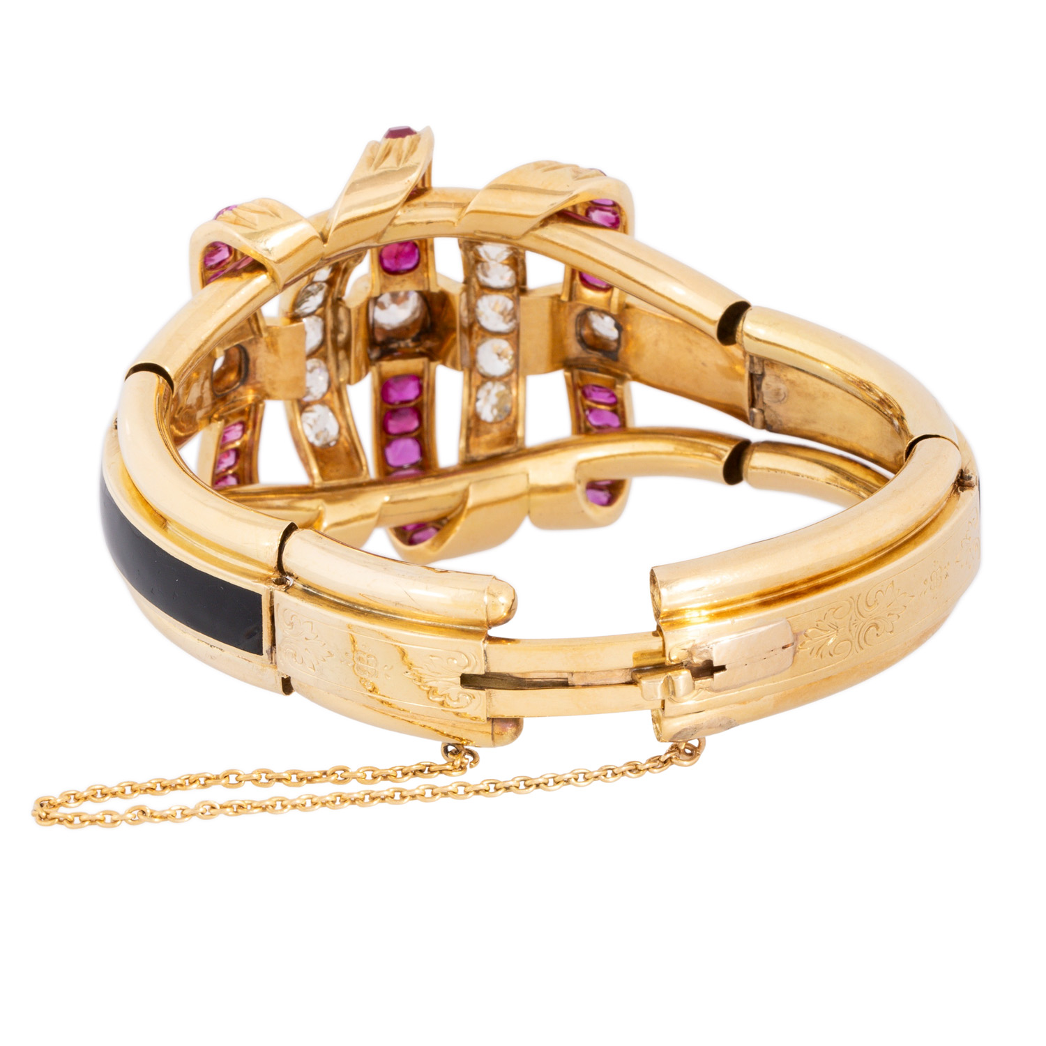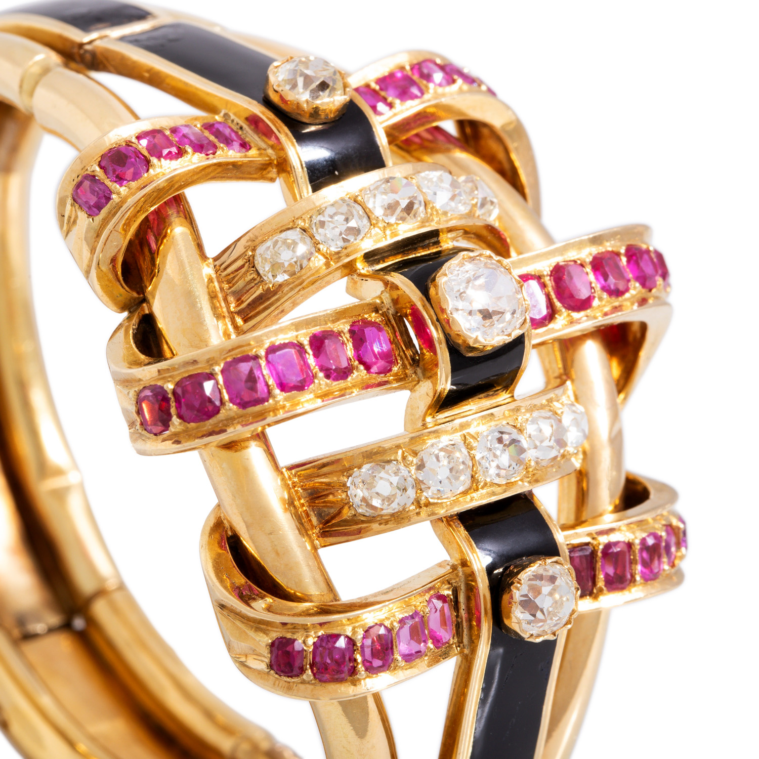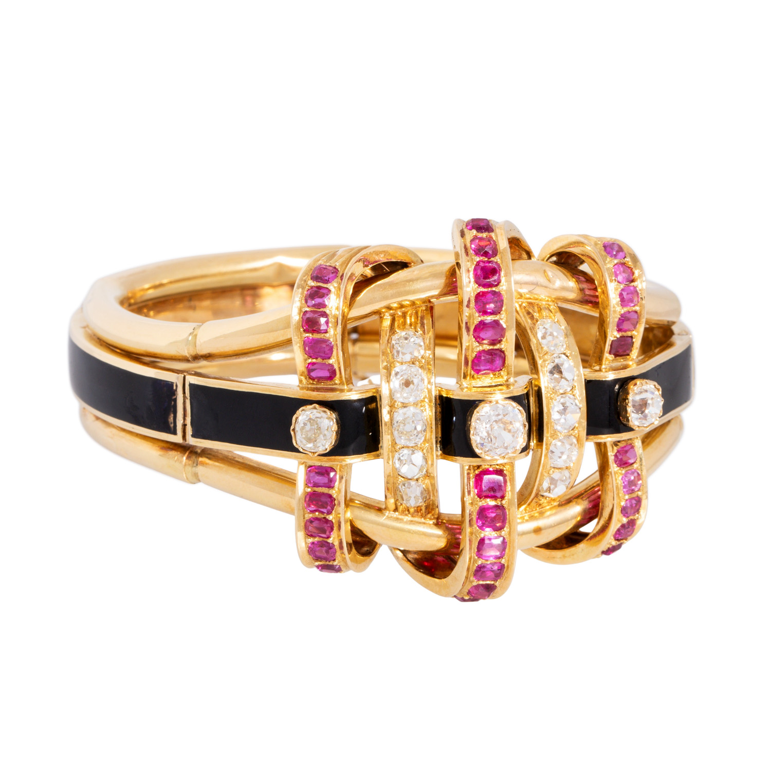 im Altschliff, zus. ca. 4,2 ct, ca. FW-LGW (F-J)/VS-P1, Rubine zus. ca. 5,0 ct, enzelne Steine leicht berieben, nicht erhitzt, GG 18K, 56,0 g, IU: 17,5 cm, 20. Jh., Flechtmuster, teilweise schwarz emailliert, Email zum Teil beschädigt, Alters- und Gebrauchsspuren.