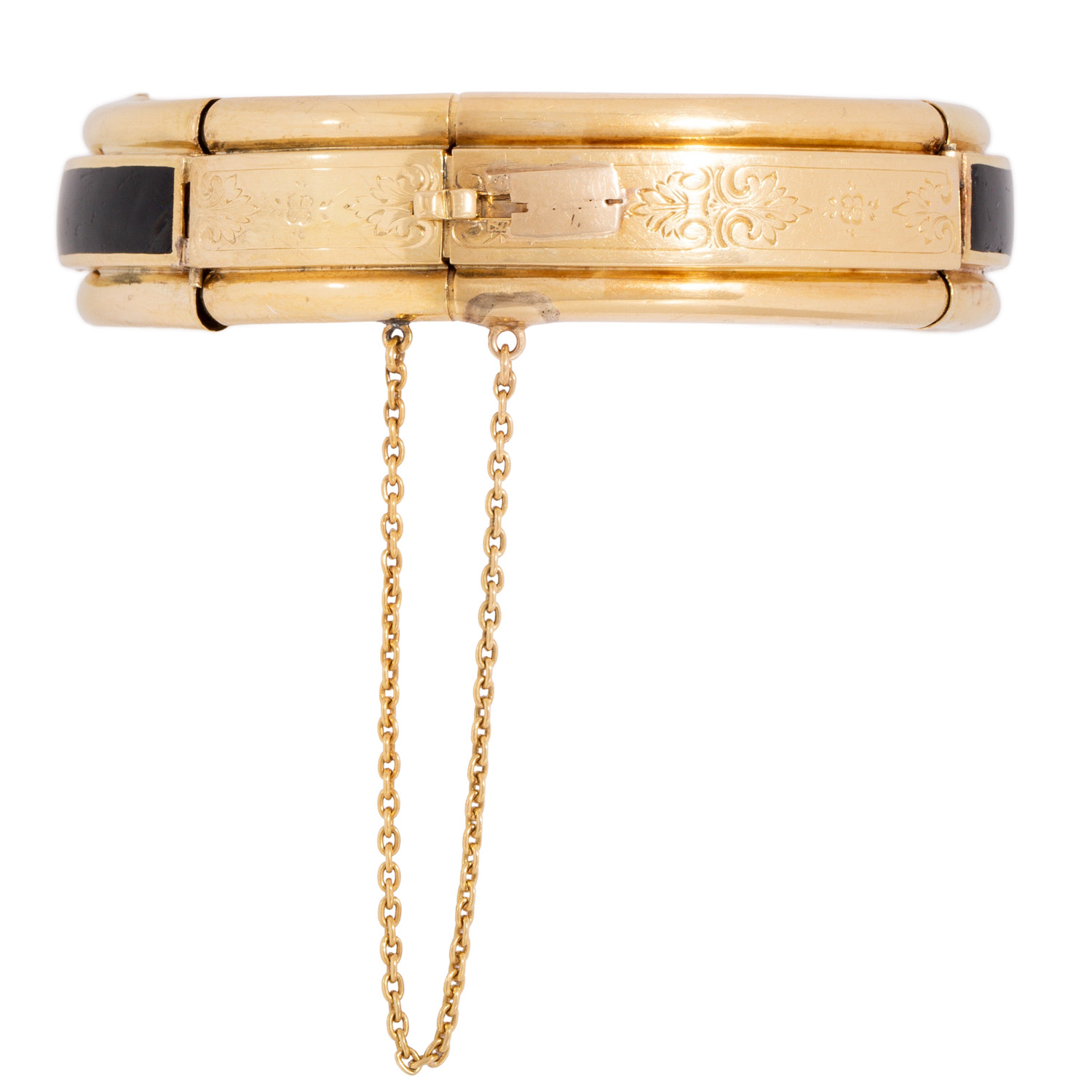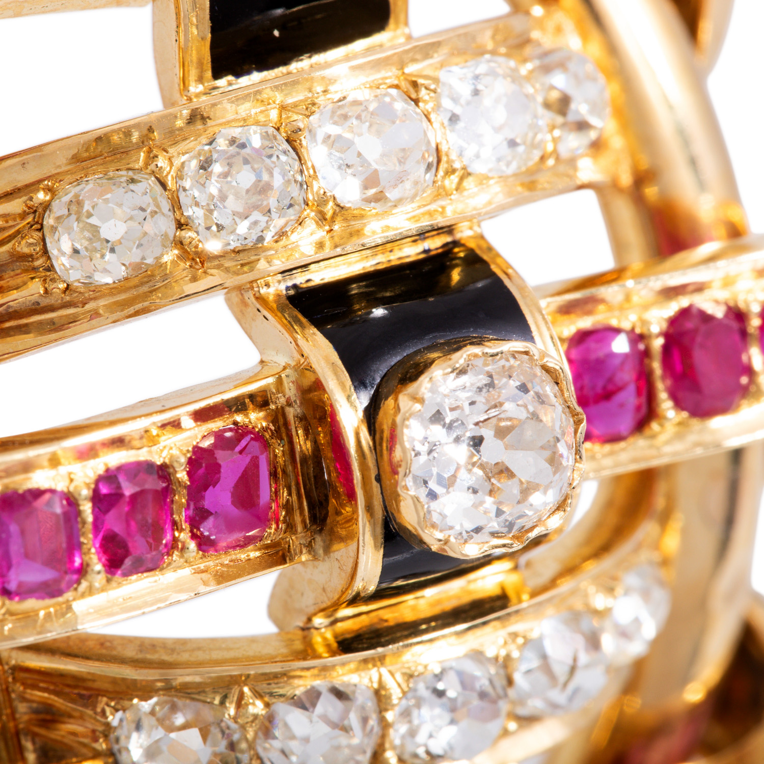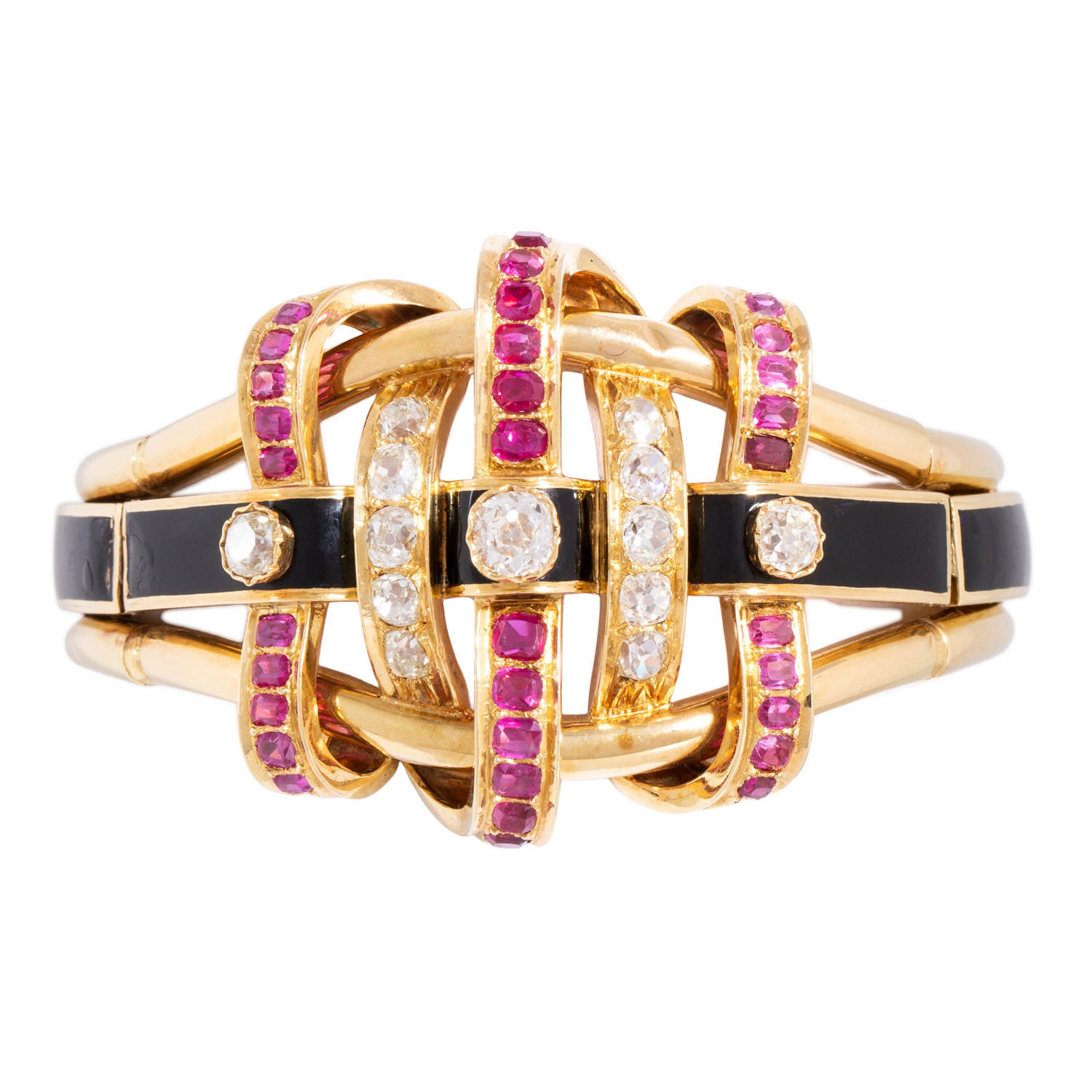 im Altschliff, zus. ca. 4,2 ct, ca. FW-LGW (F-J)/VS-P1, Rubine zus. ca. 5,0 ct, enzelne Steine leicht berieben, nicht erhitzt, GG 18K, 56,0 g, IU: 17,5 cm, 20. Jh., Flechtmuster, teilweise schwarz emailliert, Email zum Teil beschädigt, Alters- und Gebrauchsspuren.