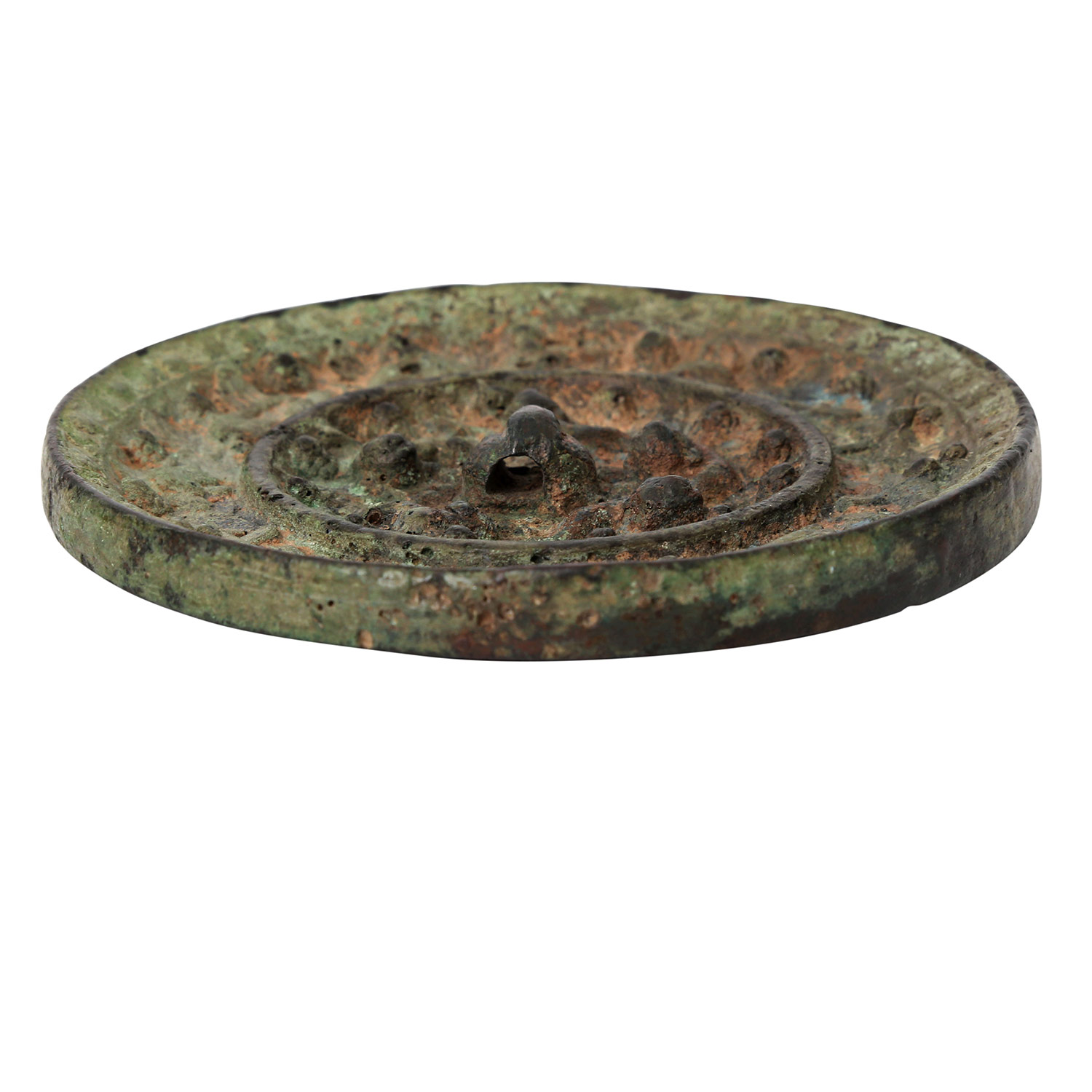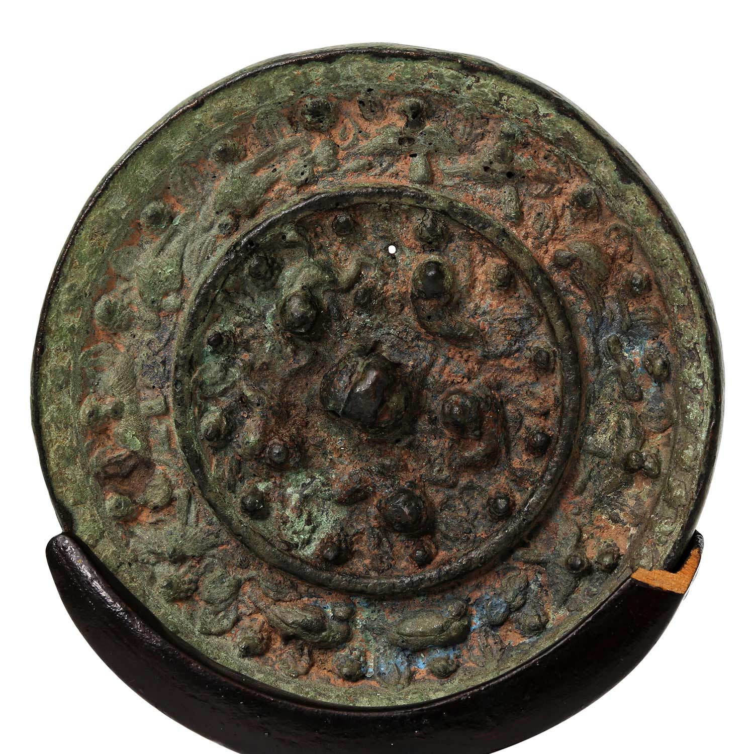 verziert mit einem Relief von verschiedenen Tieren, wie z.B. Insekten, Vögeln, Löwen sowie von Weintrauben. Krustige Alterspatina, D ca. 11,5 cm, besch. Dabei: passender Holzständer (besch.)