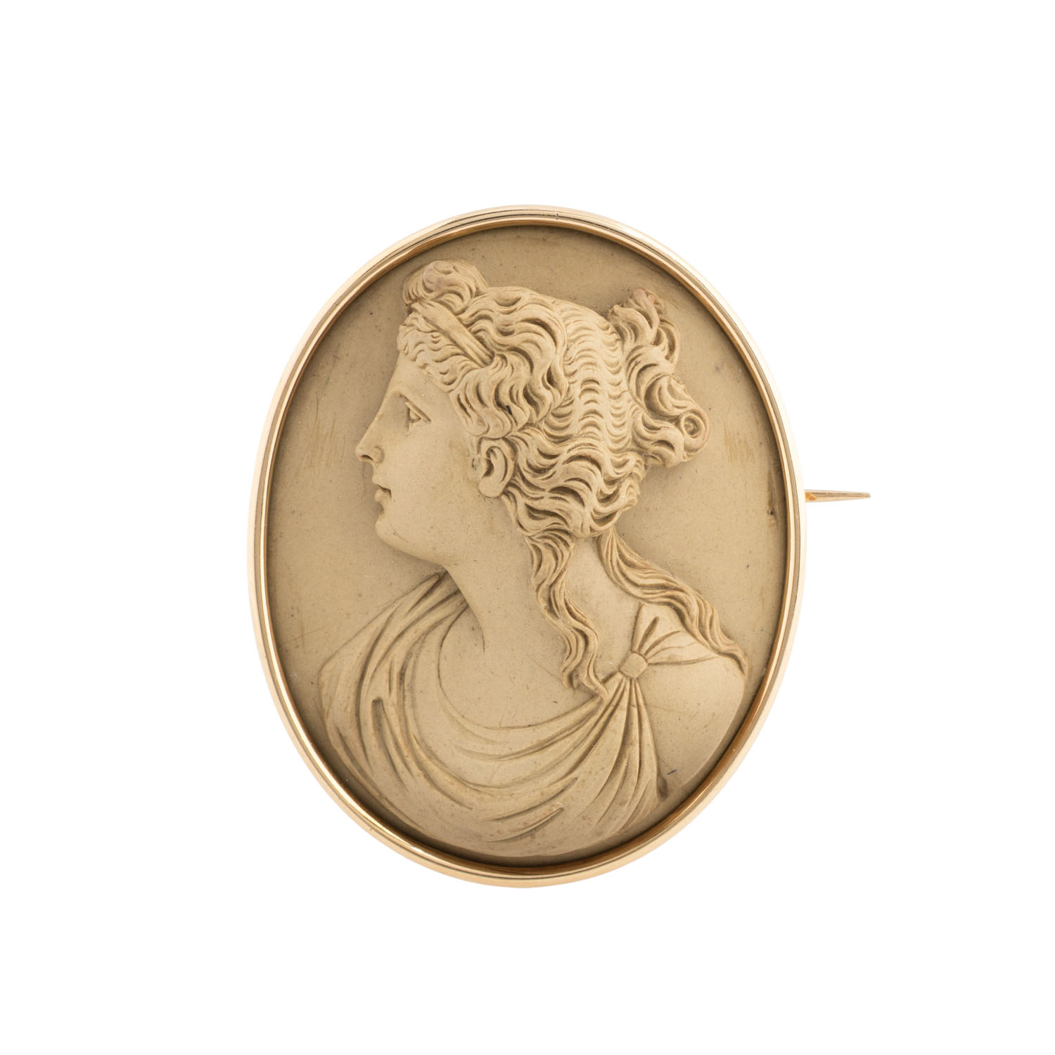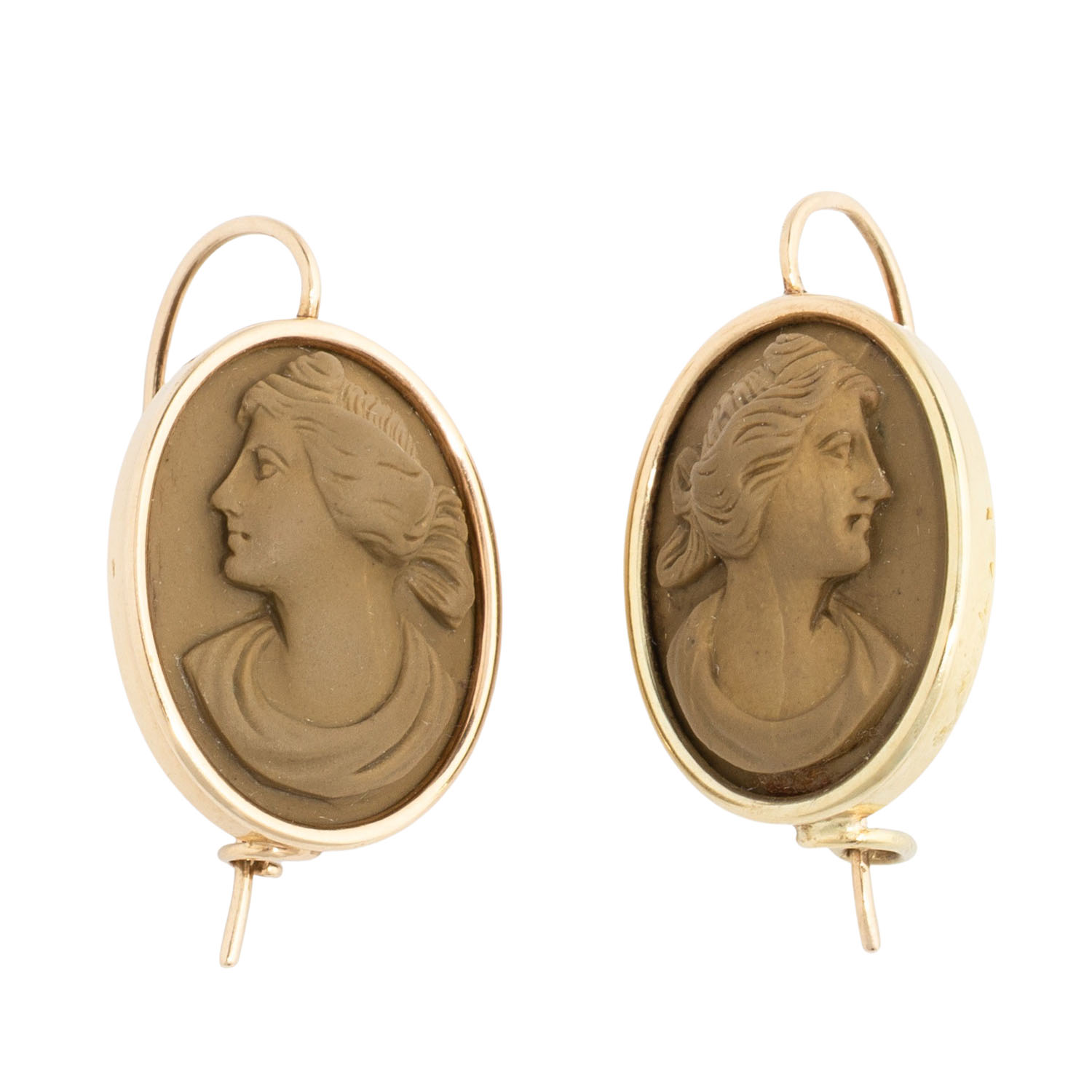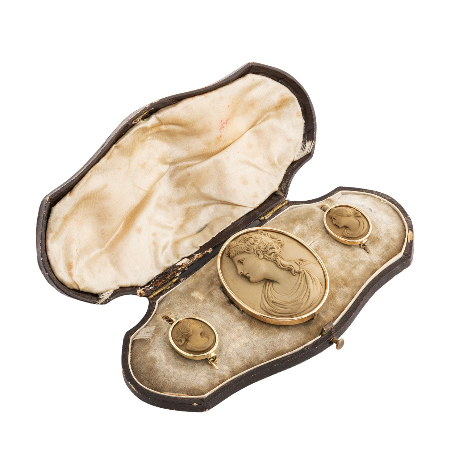 (sog. Vesuv-Lava), best. aus Brosche und Ohrhängern, 14K Gold, Brosche ca. 5 cm lang, Vermutlich Italien um 1860-1880, guter altersgemäßer Zustand, inkl. original Etui. Äußerst feine und detailgetreue Gravur einer Dame im seitlichen Halbportrait.