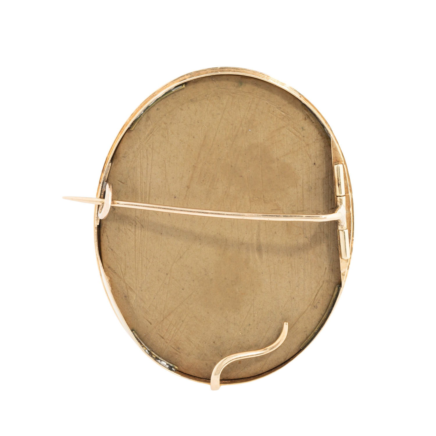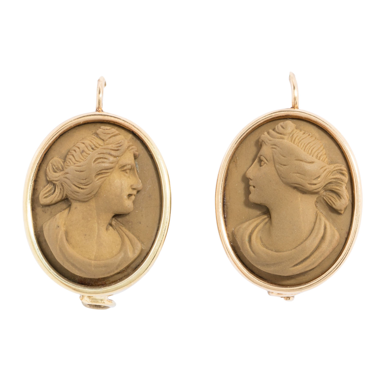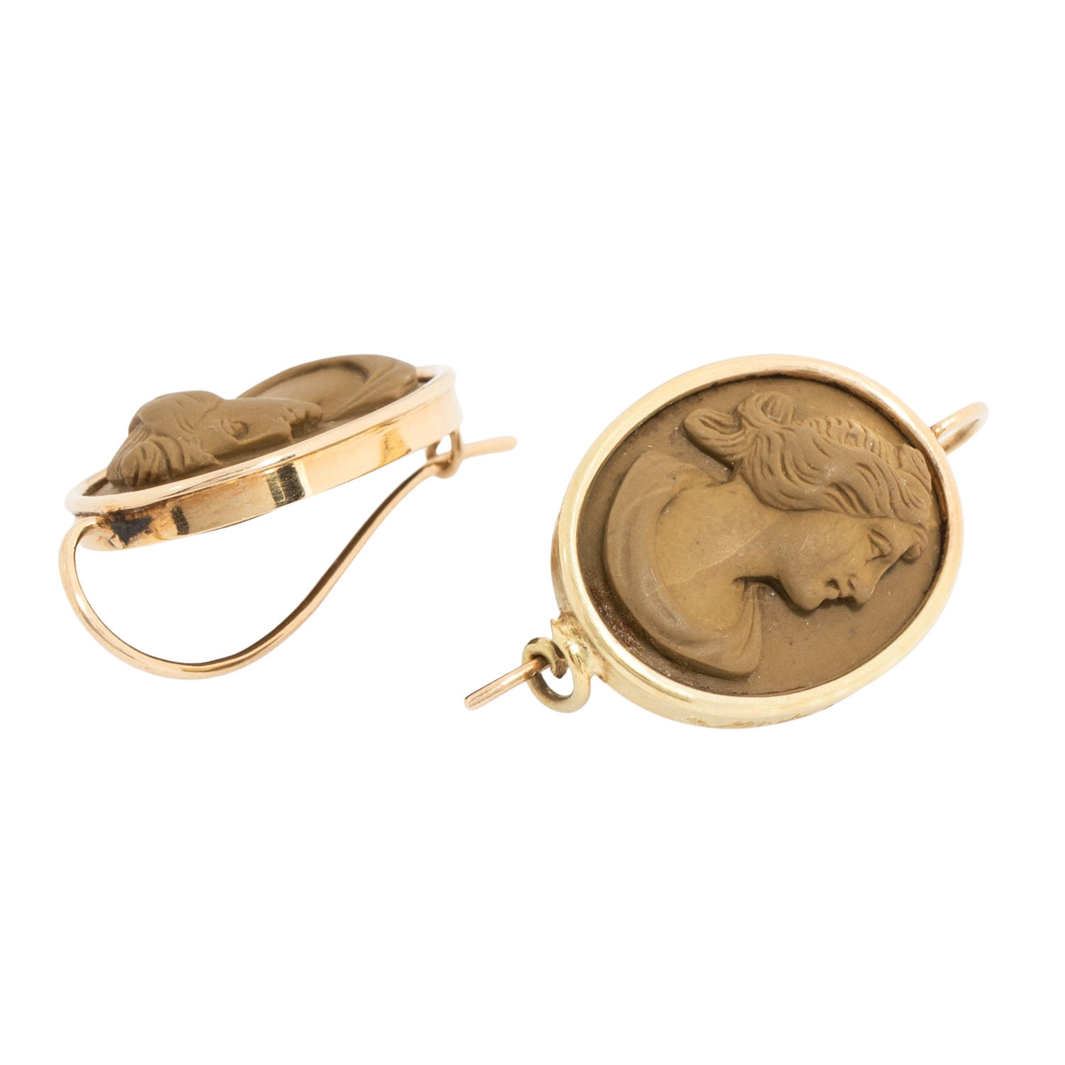 (sog. Vesuv-Lava), best. aus Brosche und Ohrhängern, 14K Gold, Brosche ca. 5 cm lang, Vermutlich Italien um 1860-1880, guter altersgemäßer Zustand, inkl. original Etui. Äußerst feine und detailgetreue Gravur einer Dame im seitlichen Halbportrait.