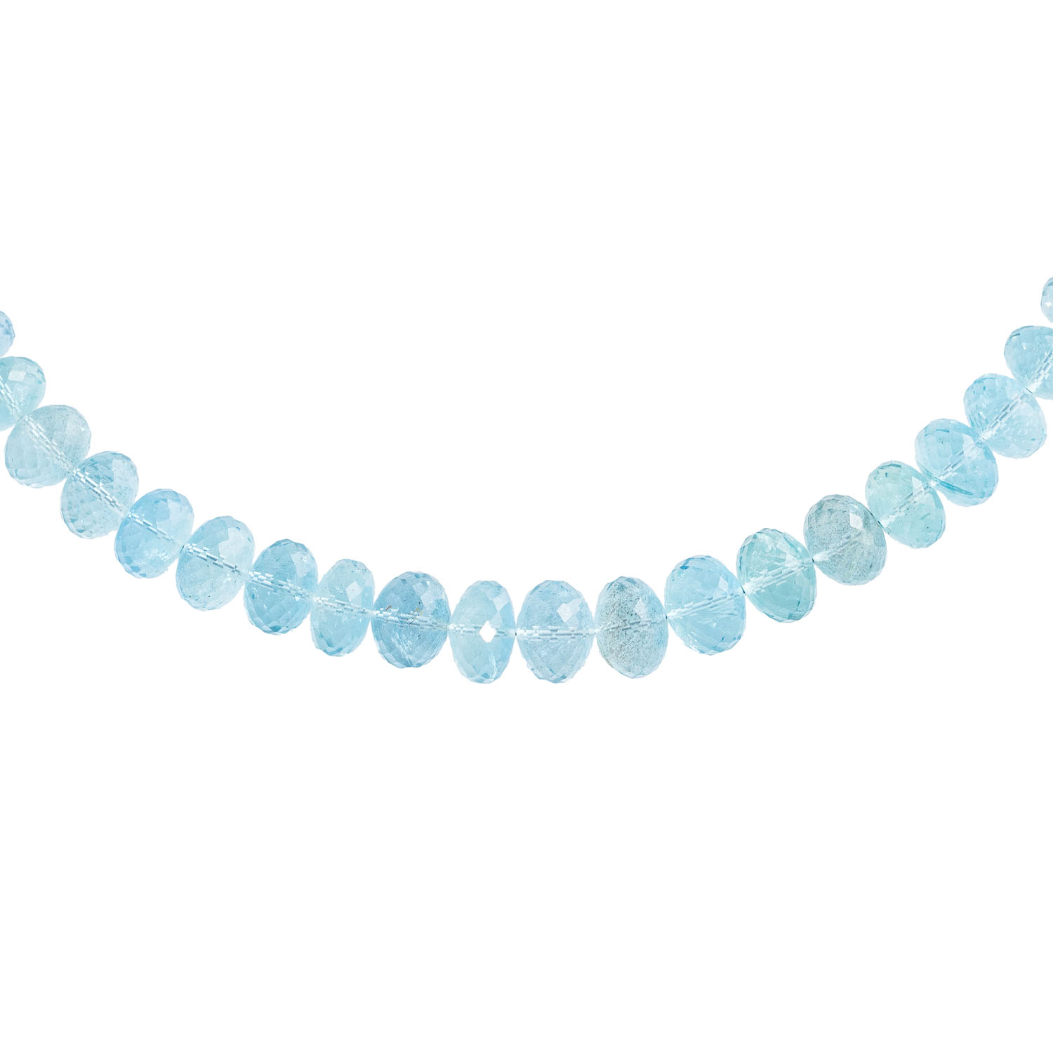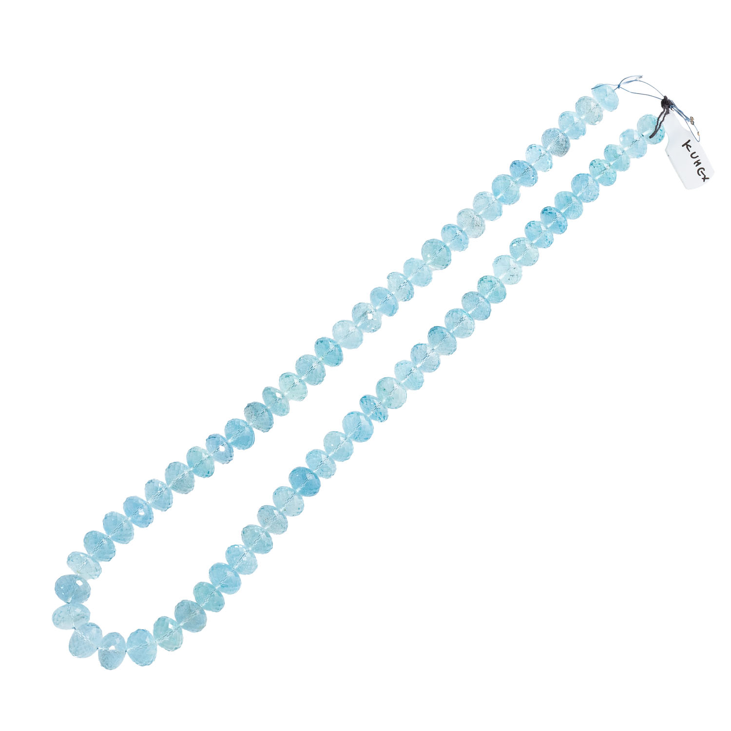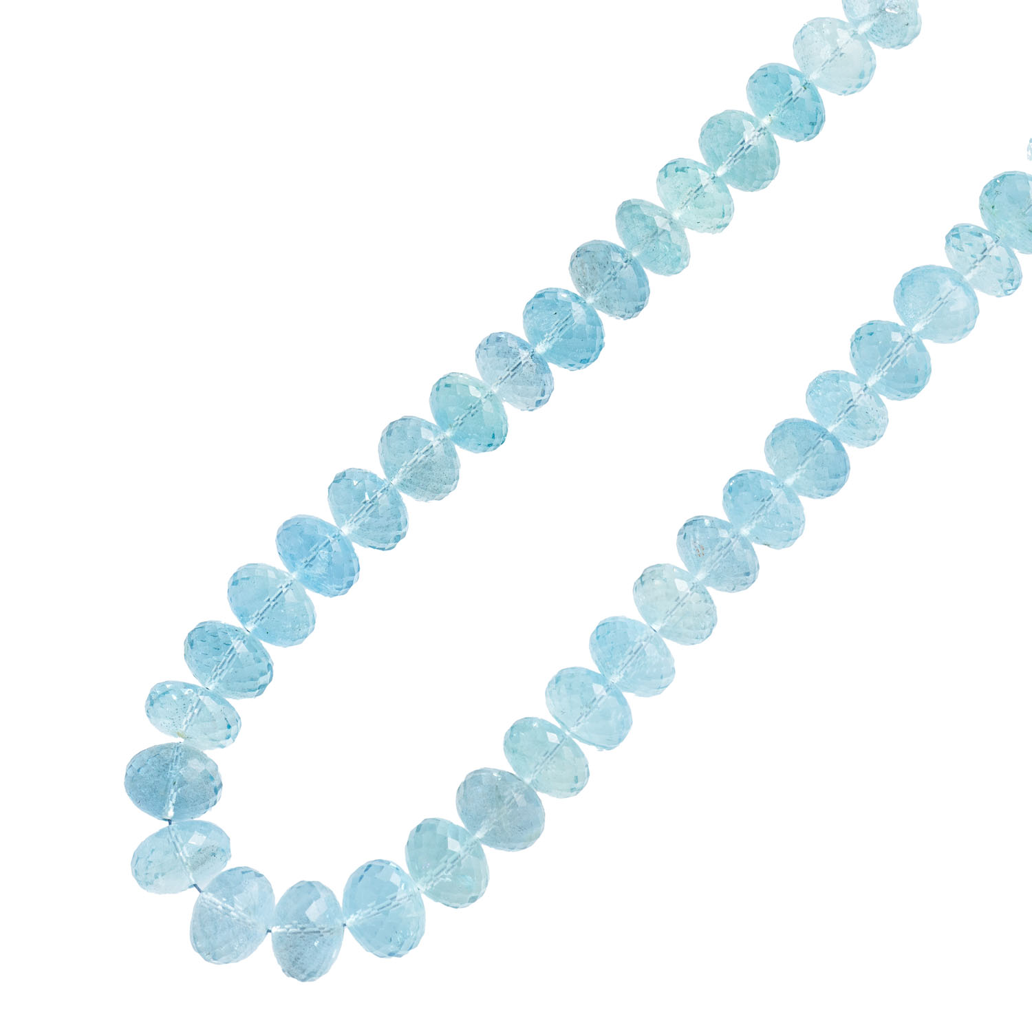 aus 65 facettierten Aquamarinrondellen, zus. ca. 305 ct (inkl. Schnur), D: ca. 9 bis 11 mm, L: ca: 44 cm, gefädelte Linie ohne Verschluss, 21. Jh., neuwertiger Zustand. Aquamarine mit leichten Farbvariationen und unterschiedliche Ausformungen, Facettenkanten partiell leicht gerieben.