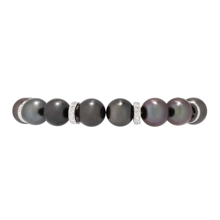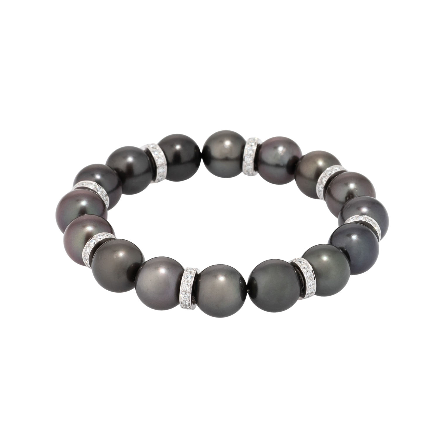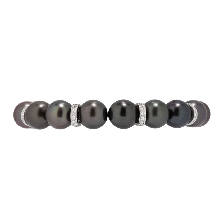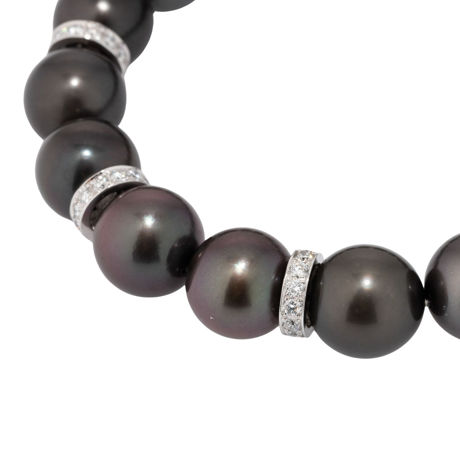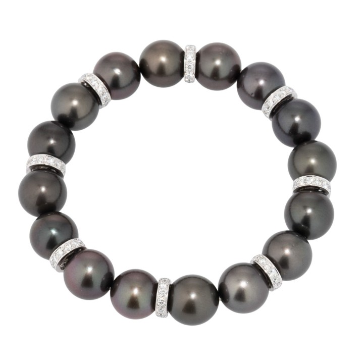 und 8 Zwischenelementen mit Brillanten von zus. ca. 2,30 ct, FW (G)/VS, schwarze Tahiti-Zuchtperlen mit Wachstumsmerkmalen, D: ca. 10,5-11 mm, Zwischenelemente WG 18K, 34 g, L: 16 cm, ohne Verschluss, auf elastischem Band gefasst. 21. Jh. guter Zustand, inklusive Juwelierzertifikat.