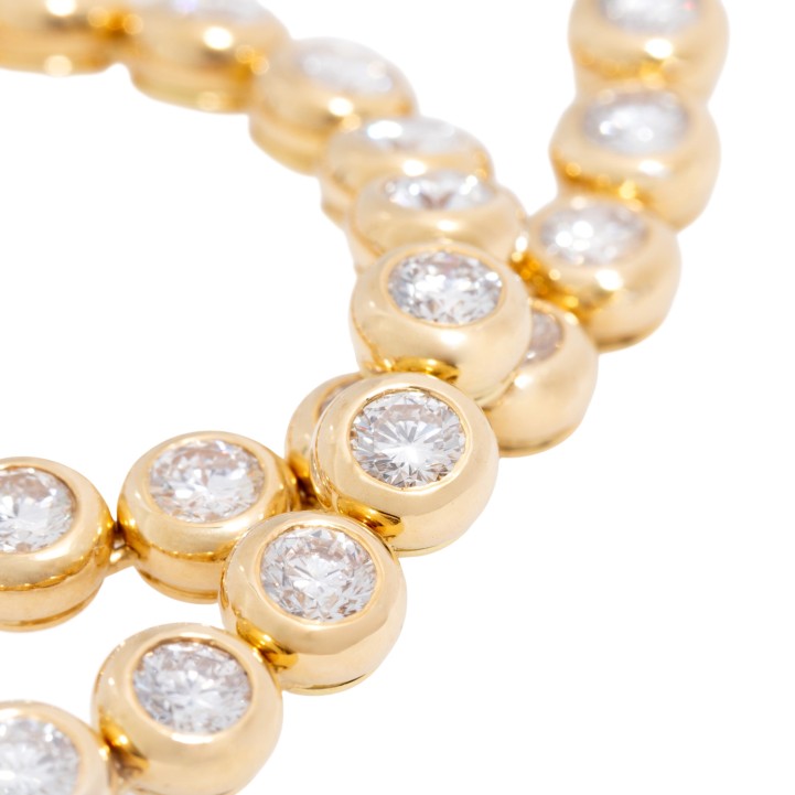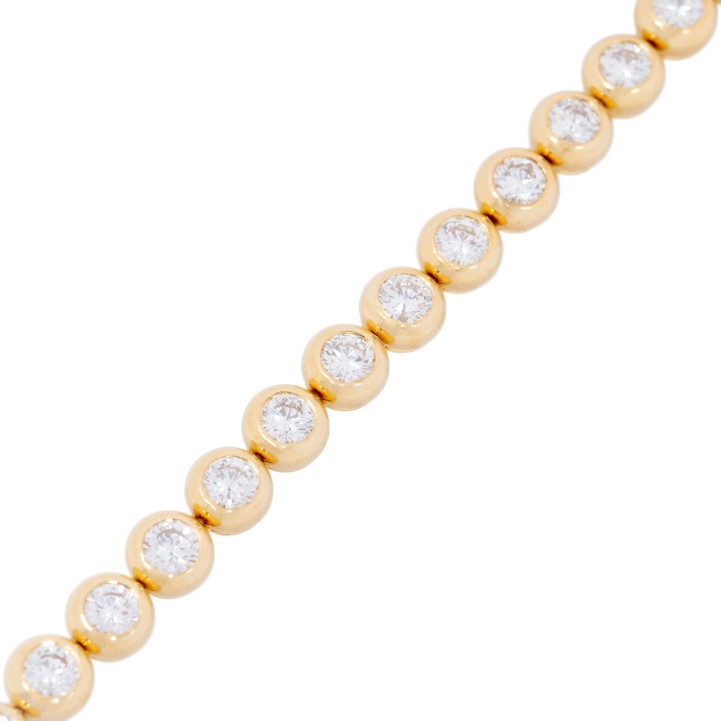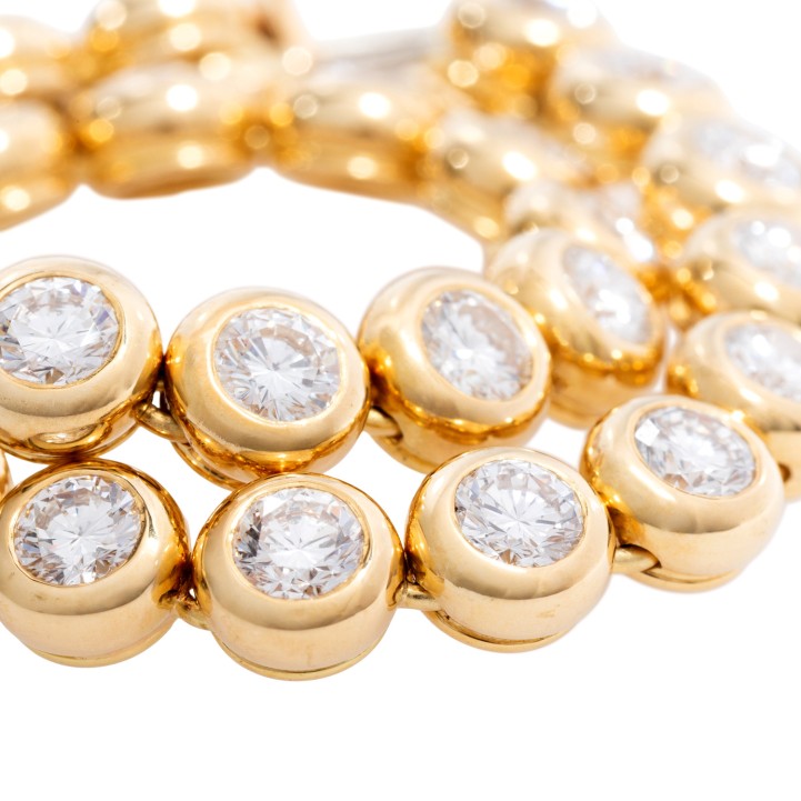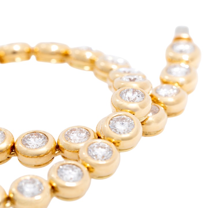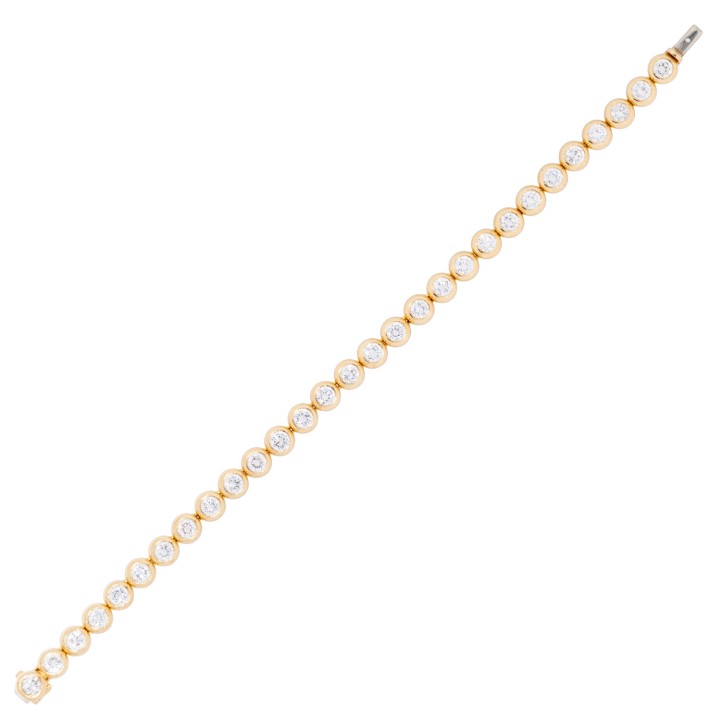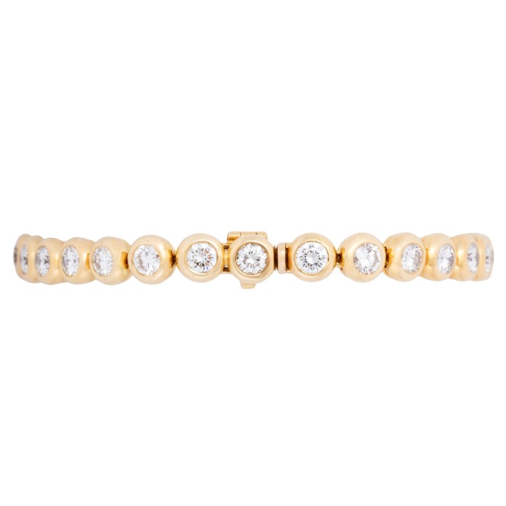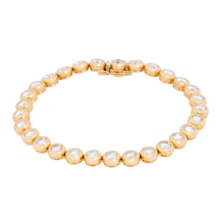 zus. ca. 7,25 ct, guter Farbgrad (in der Gelbgoldfassung nicht eindeutig zu bestimmen), WBW: ca. 35.000 €, VS-SI, 18K GG, 24,1 g, Länge ca. 18,5 cm, spätes 20. Jh., leichte Tragespuren.