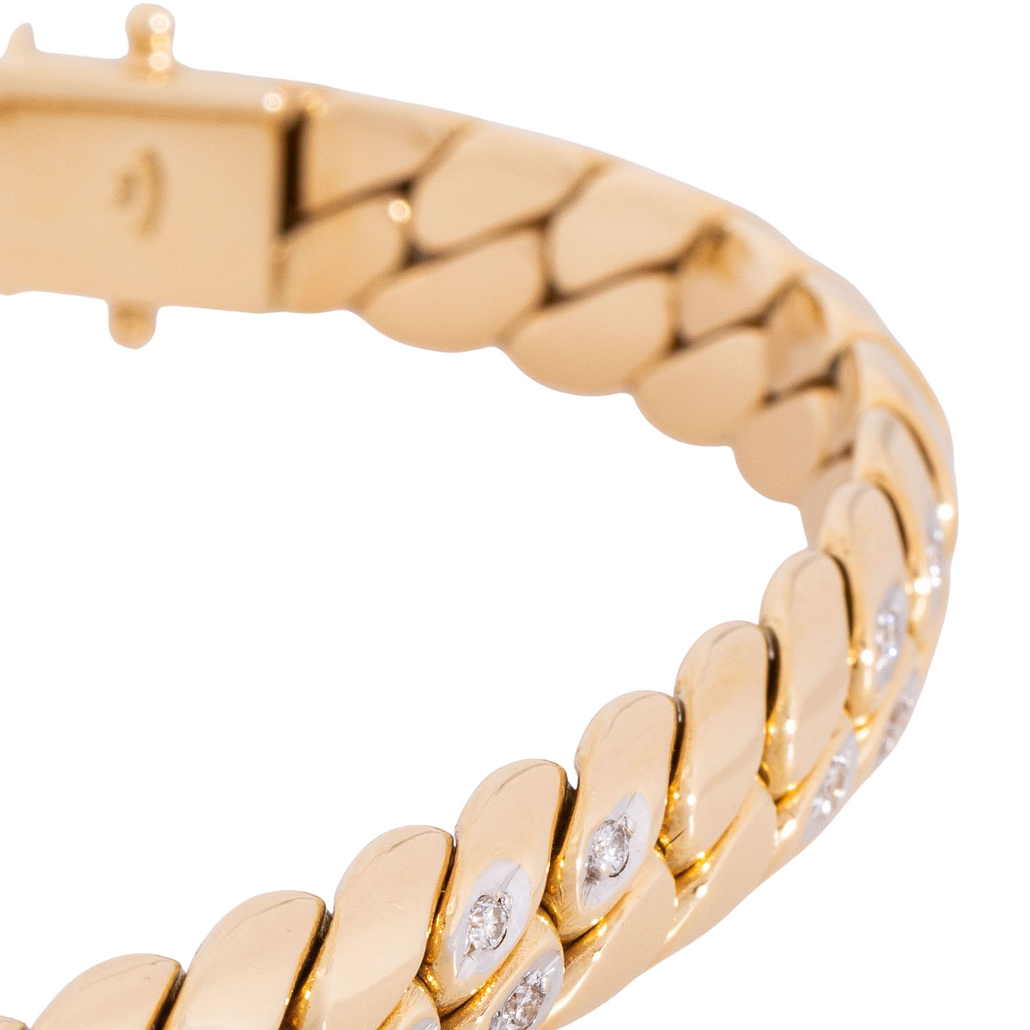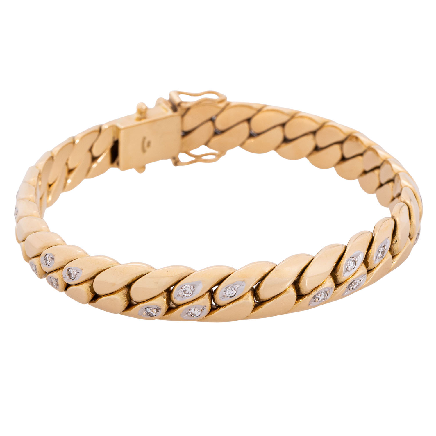 zus. ca. 0,32 ct, WEISS (H)/SI, WG/GG 18K, 66,3 g, L; ca. 19 cm, B: ca. 0,9 cm, Ende 20. Jh, minimale Tragespuren, massiv gearbeitet, Handarbeit, (punz.).