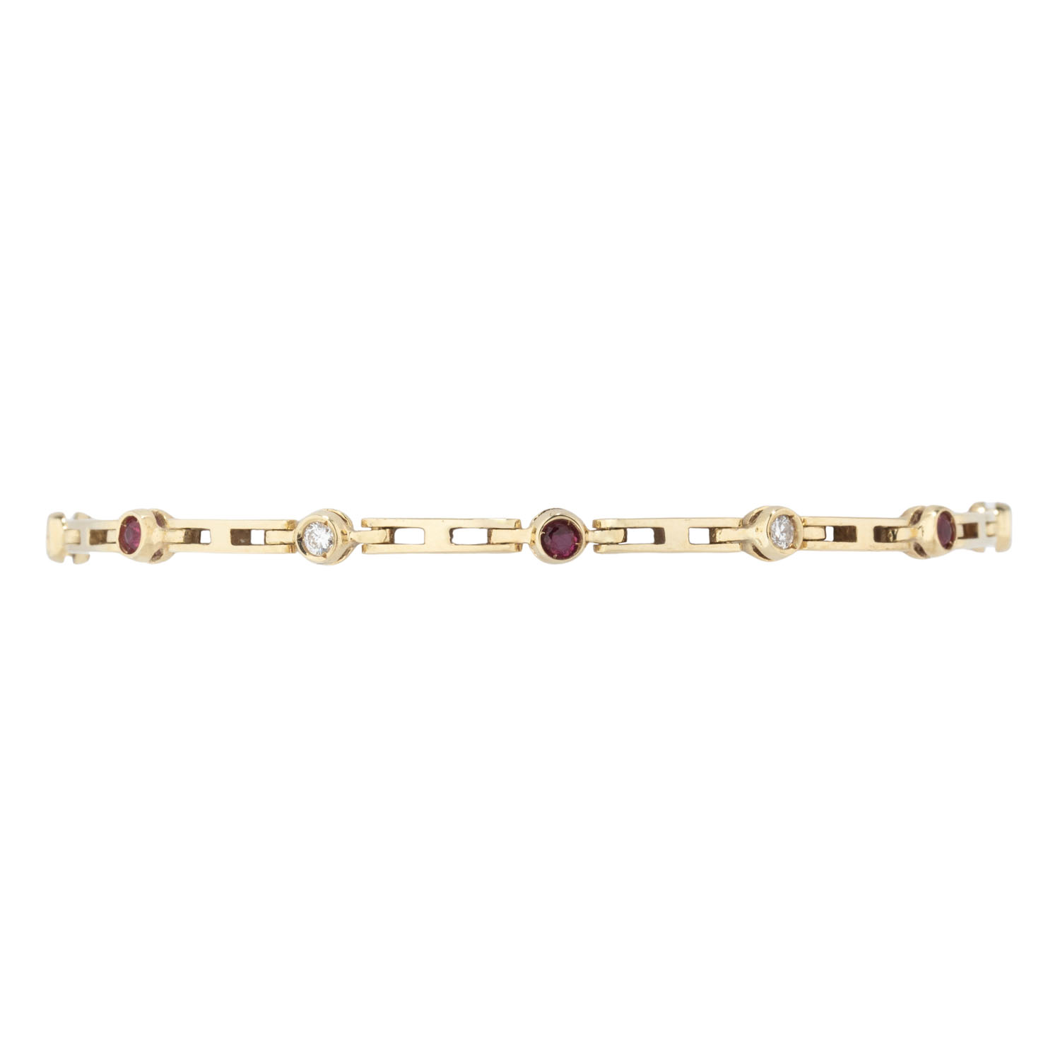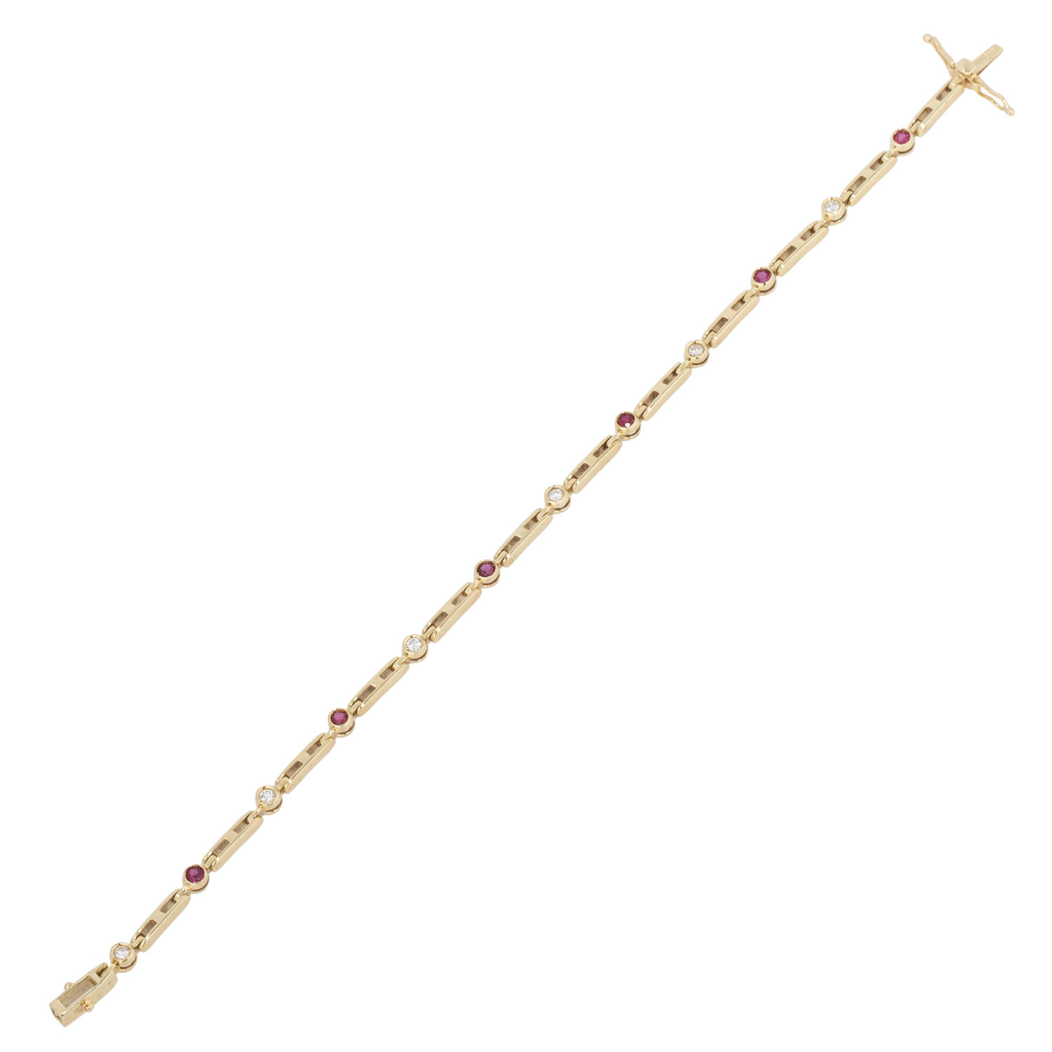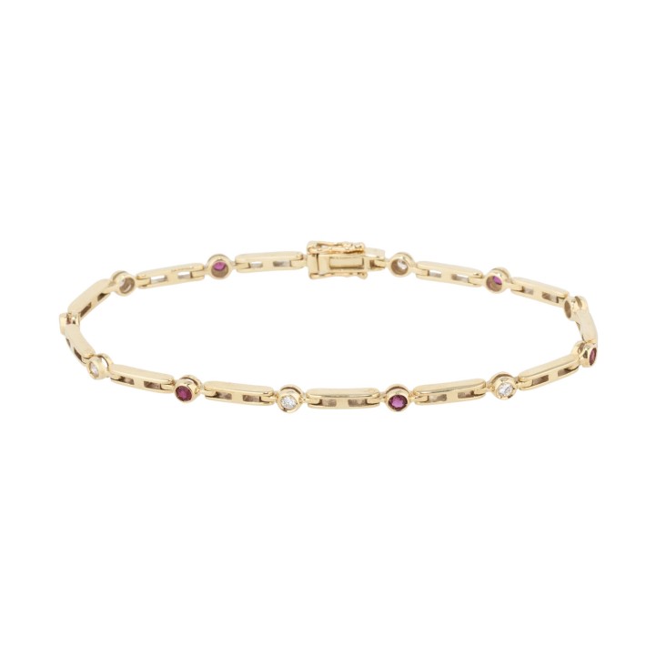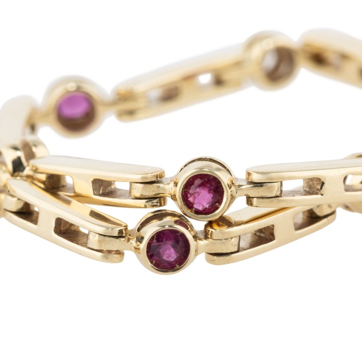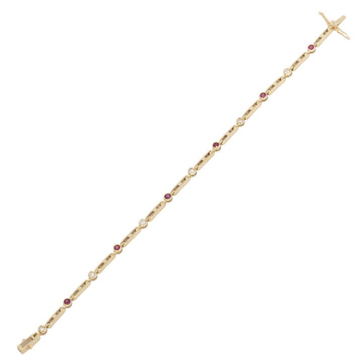 ges. ca. 0,2 ct, gute Farbe und Reinheit, 6 Rubine, rund facettiert, ca. 2,2 mm, GG 14K, 7,9 g, L: 17,5 cm, Kastenschloß mit 2 Sicherungsachten, 1970 - 1980er Jahre, minimale Tragespuren.